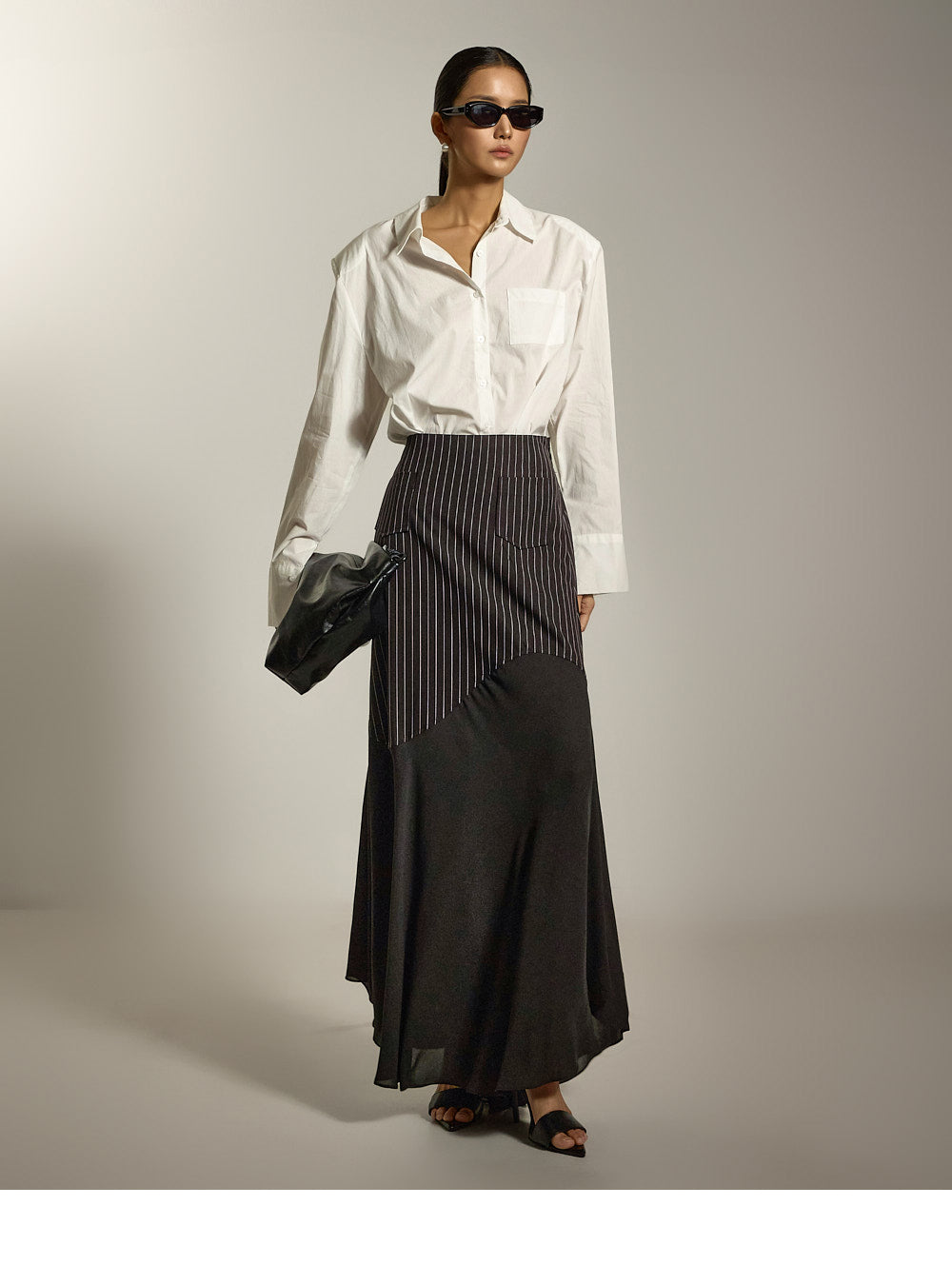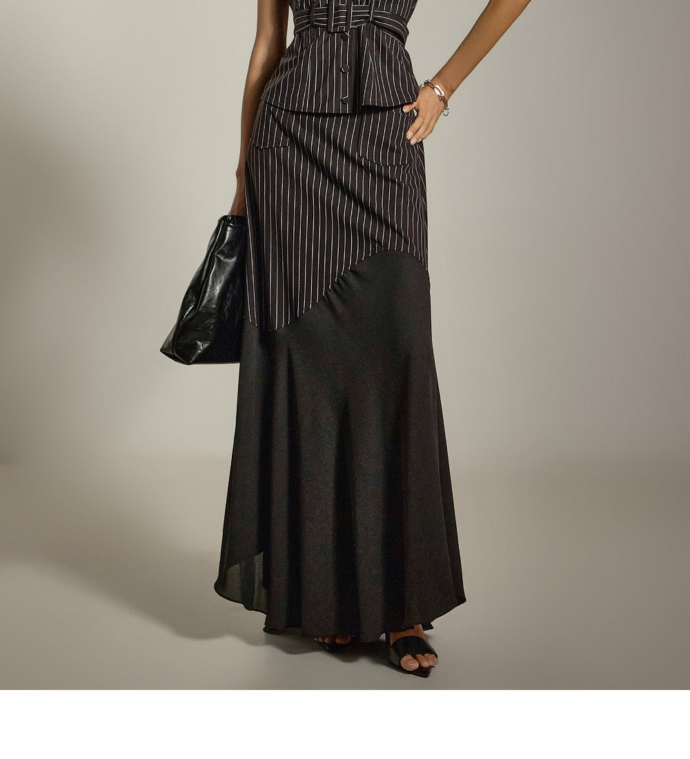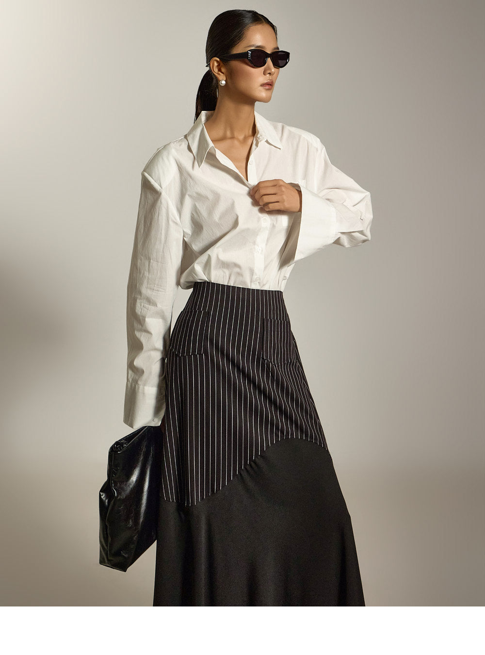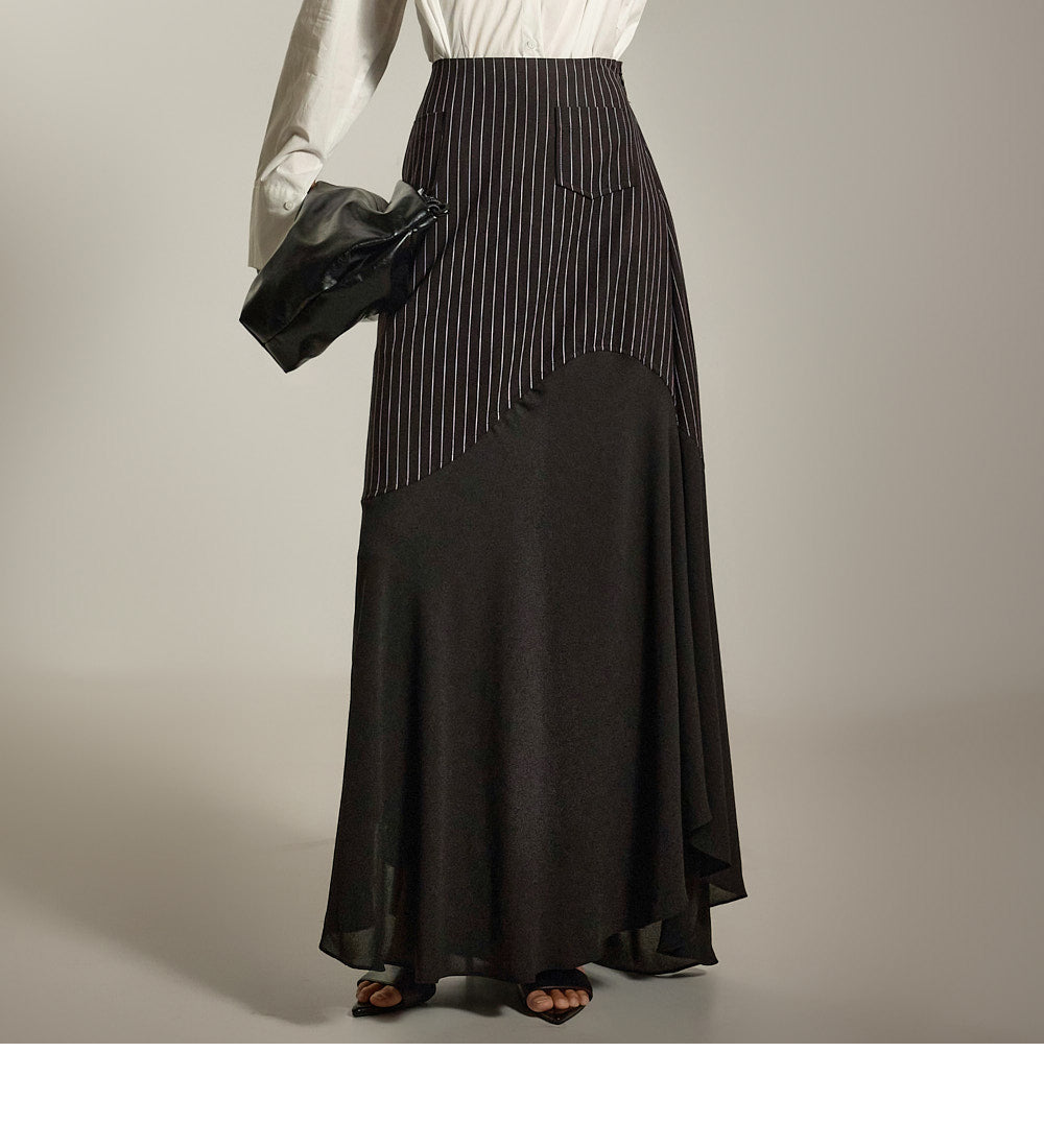 ストライプのコントラストが上品なスカートは、洗練された印象を与えます。