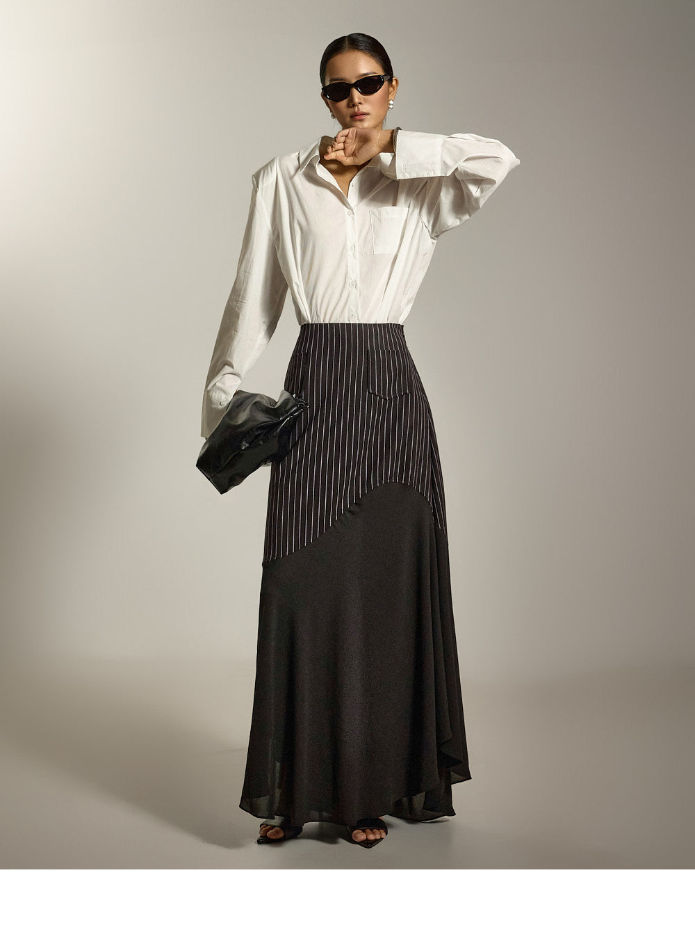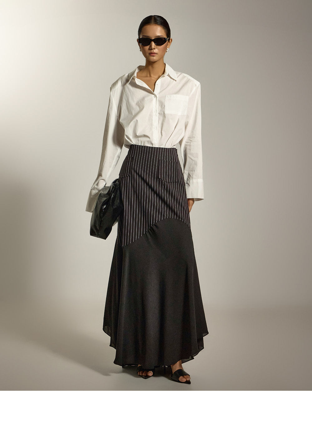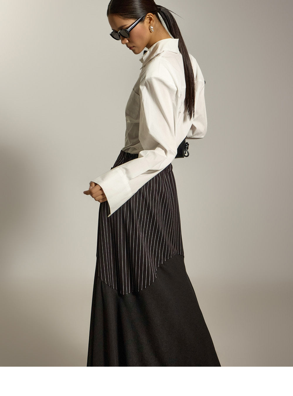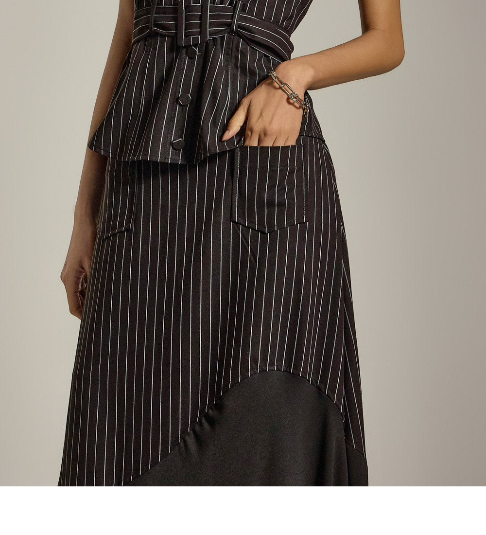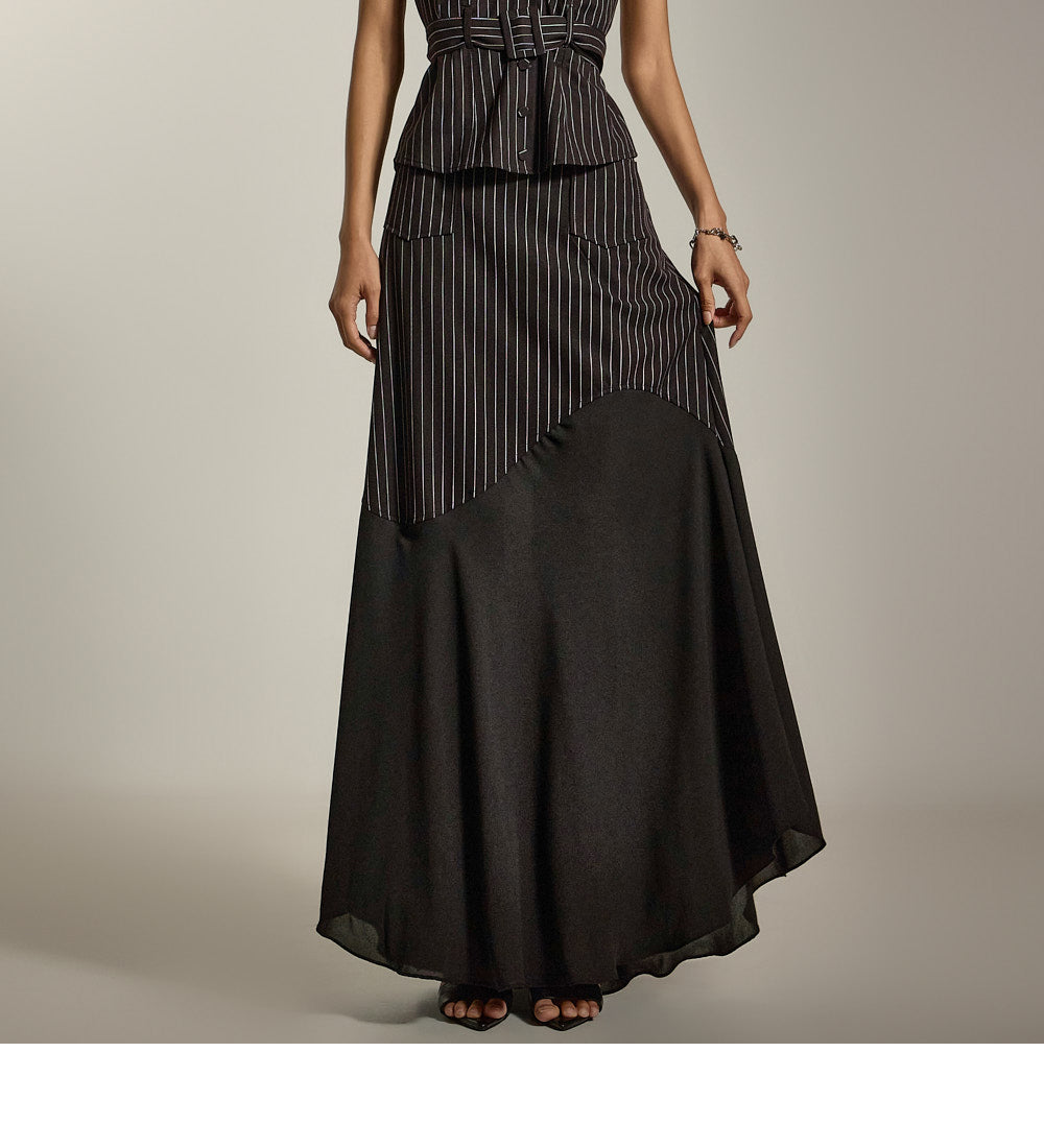ストライプのコントラストが上品なスカートは、洗練された印象を与えます。