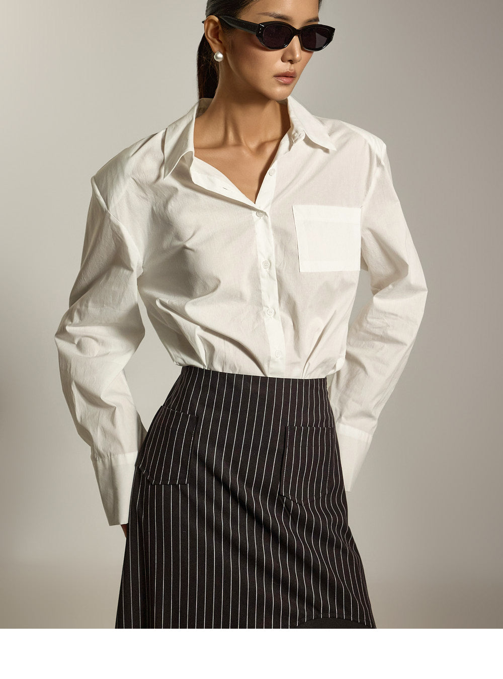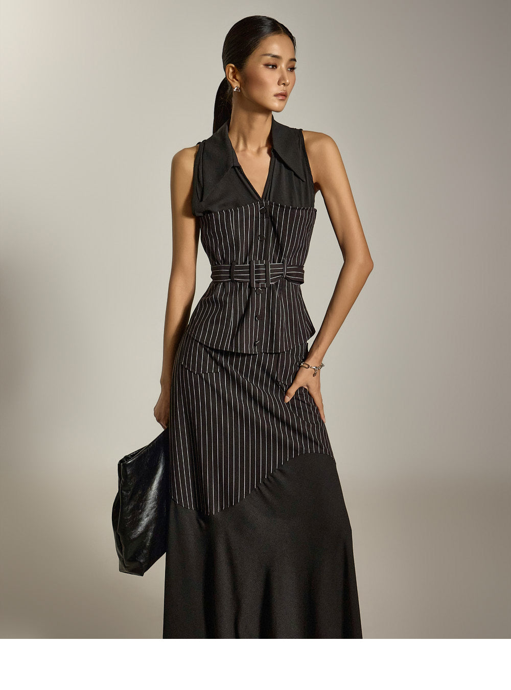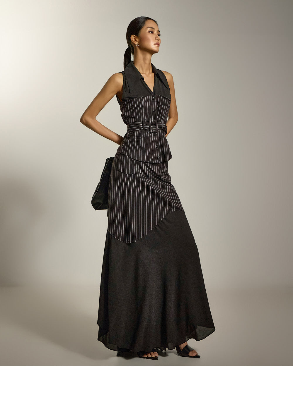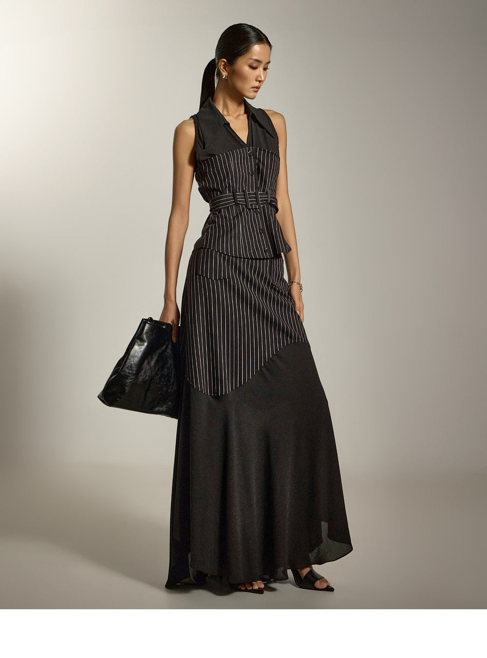 ストライプのコントラストが上品なスカートは、洗練された印象を与えます。