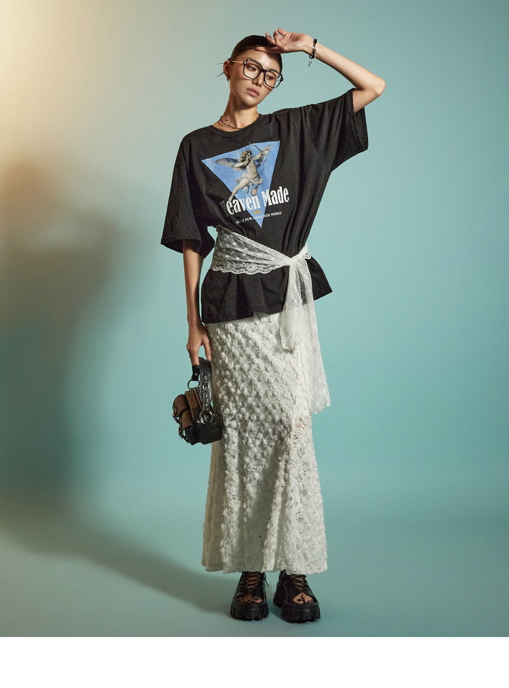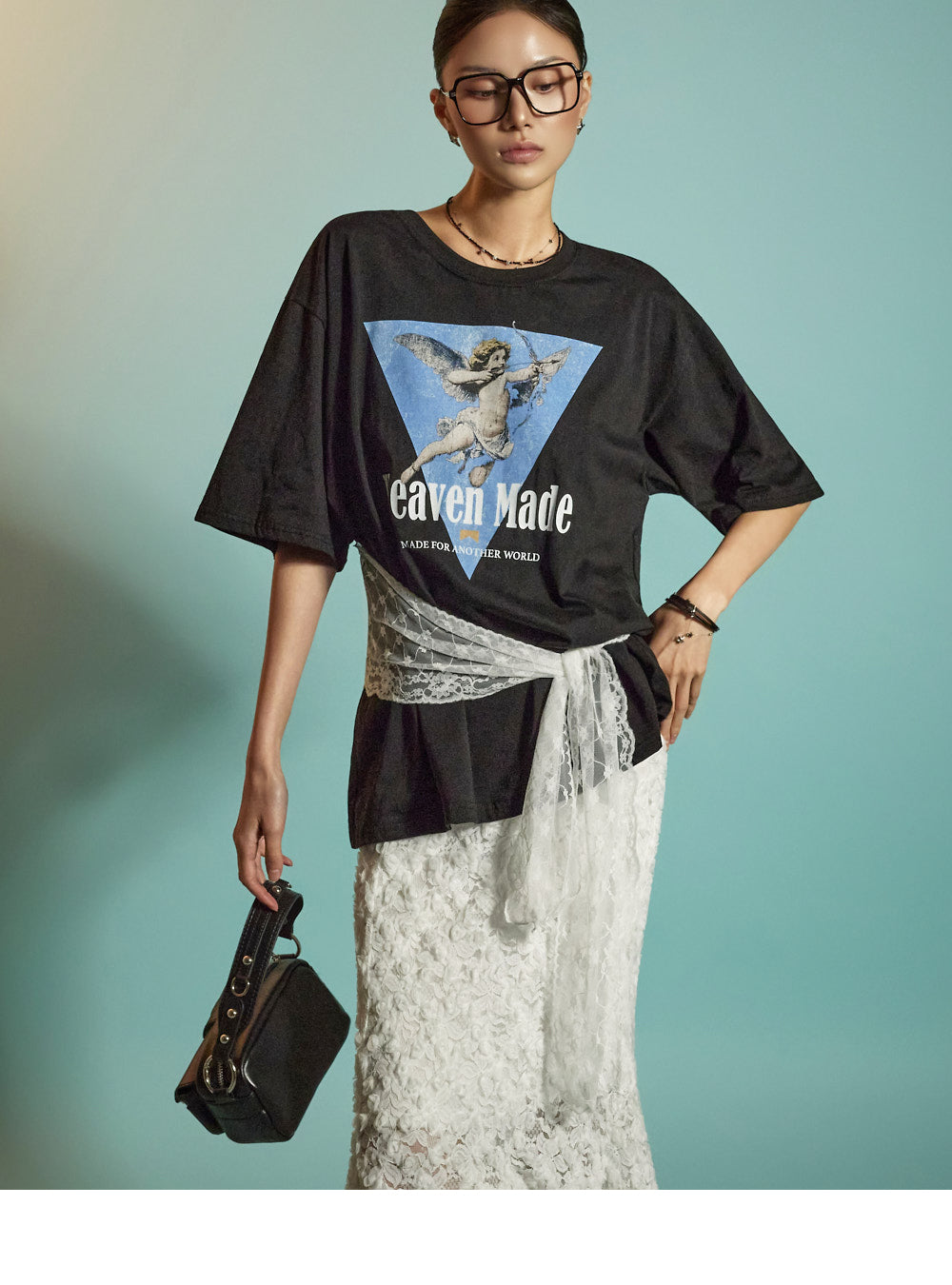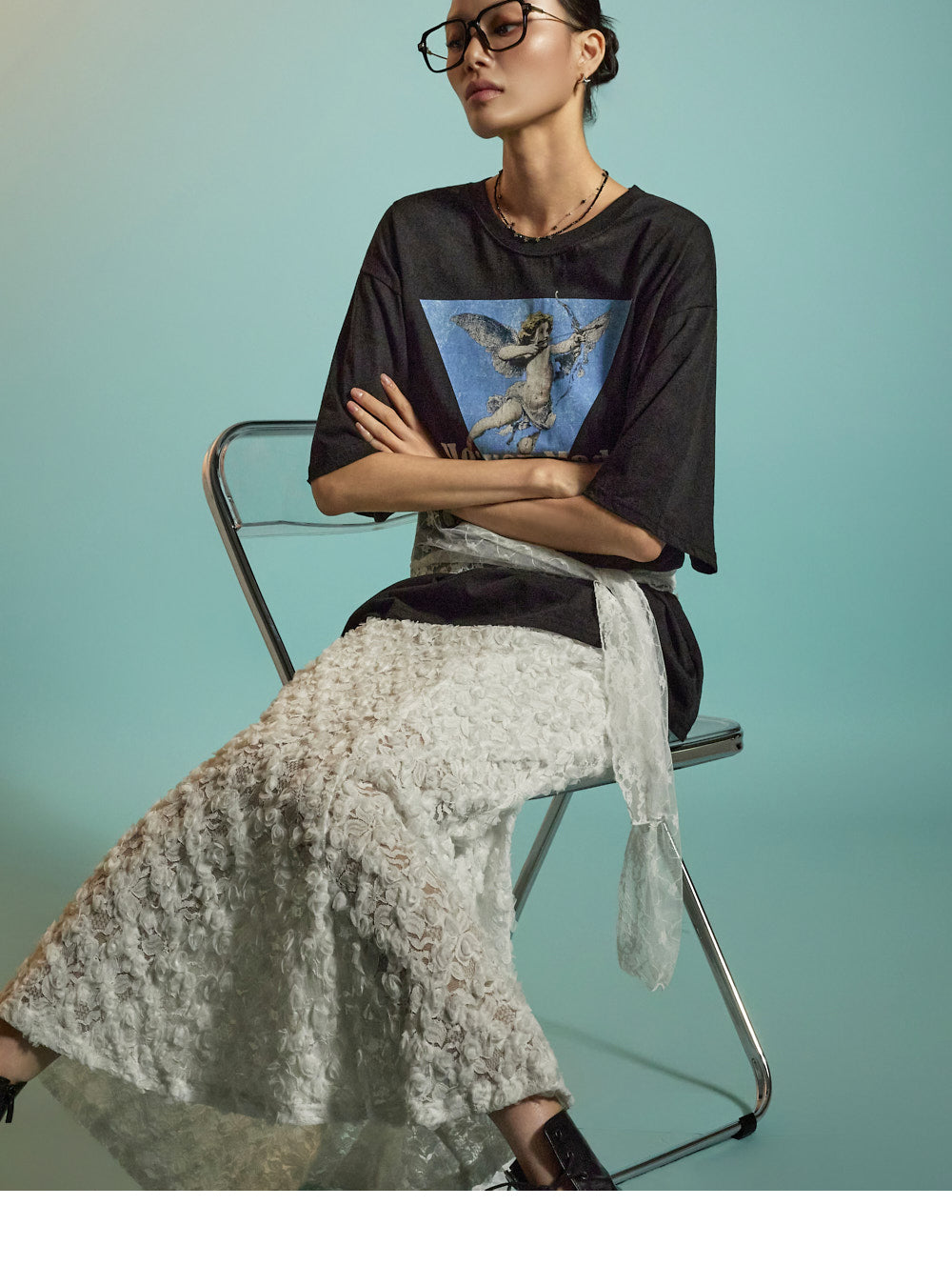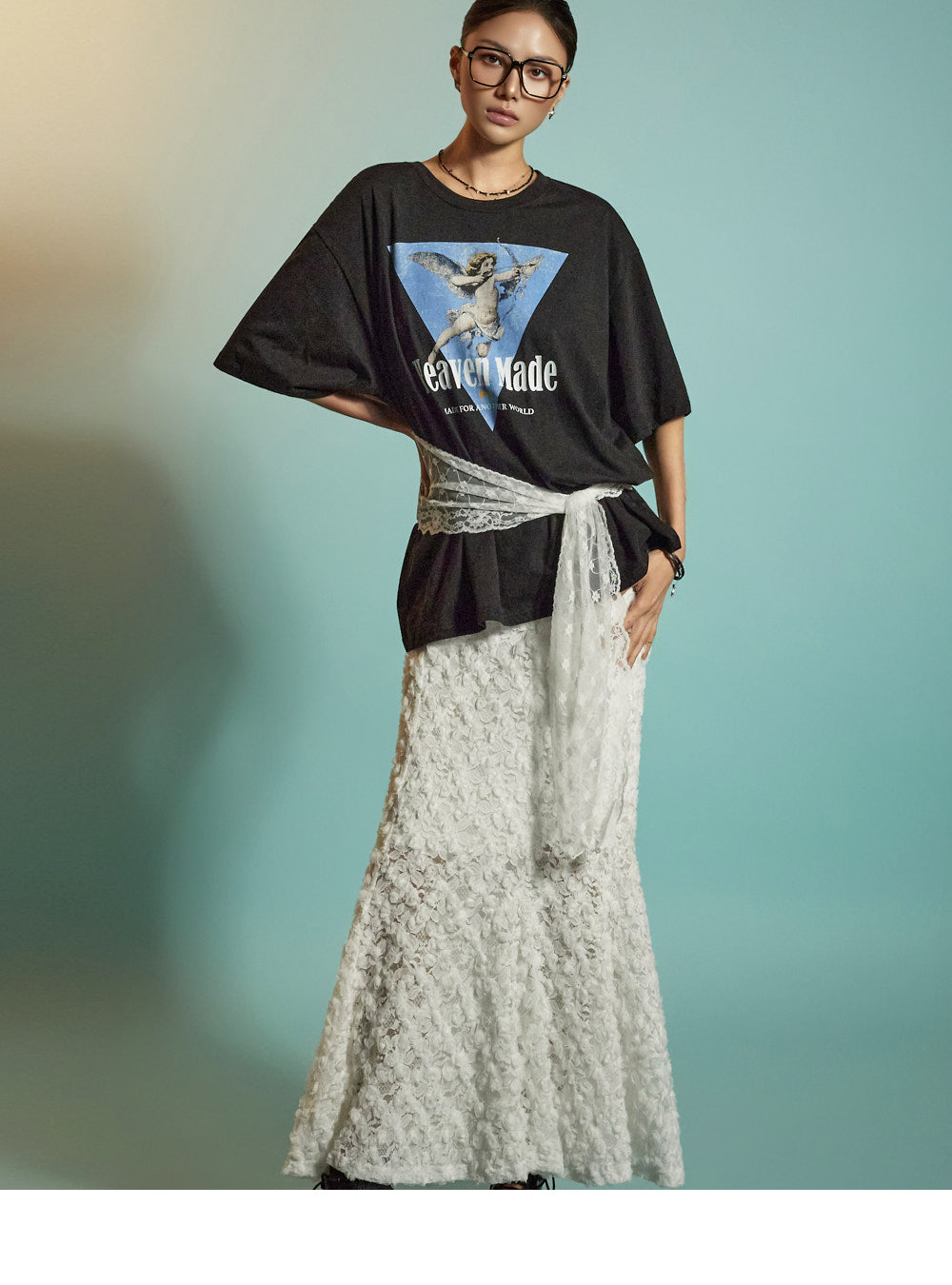 The all-over lace fabric creates a soft, romantic mood,
