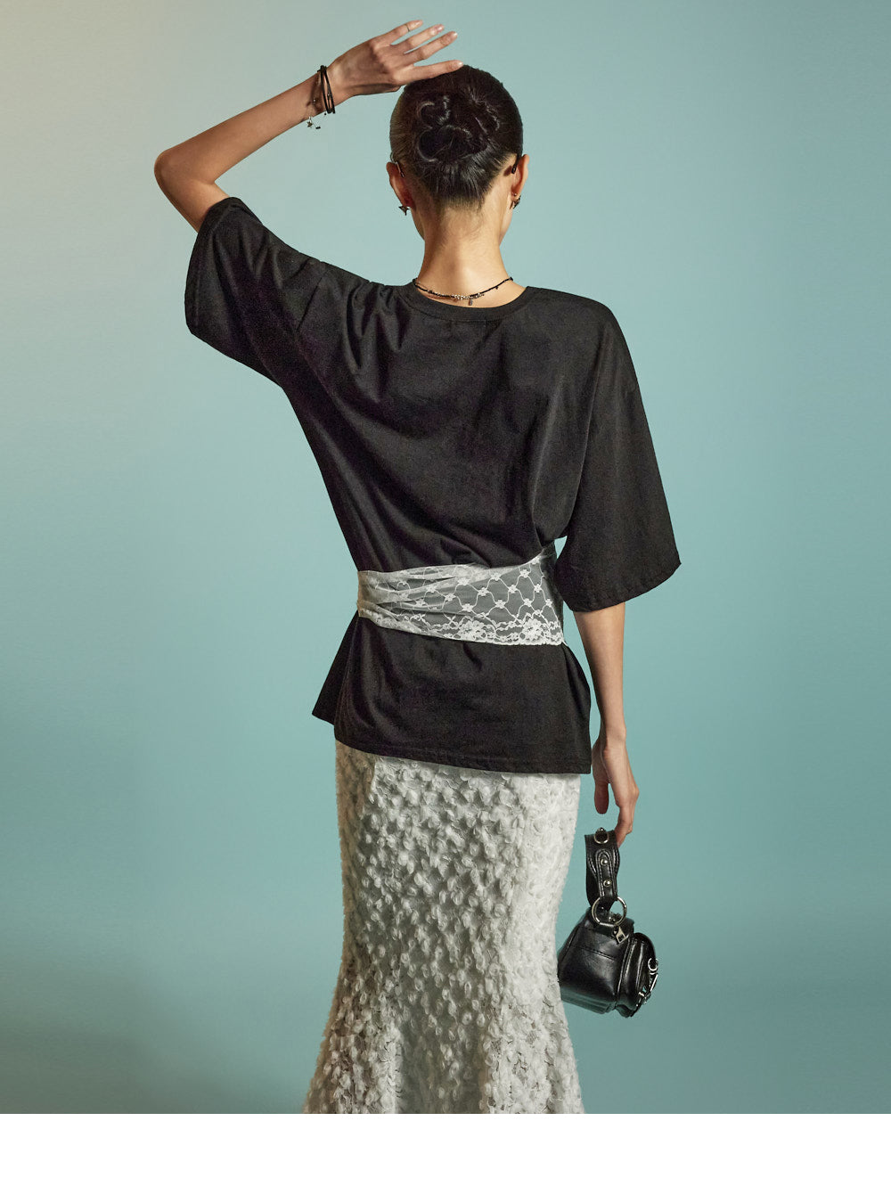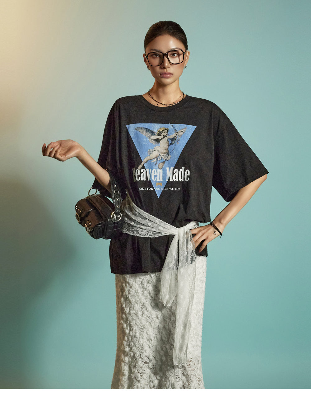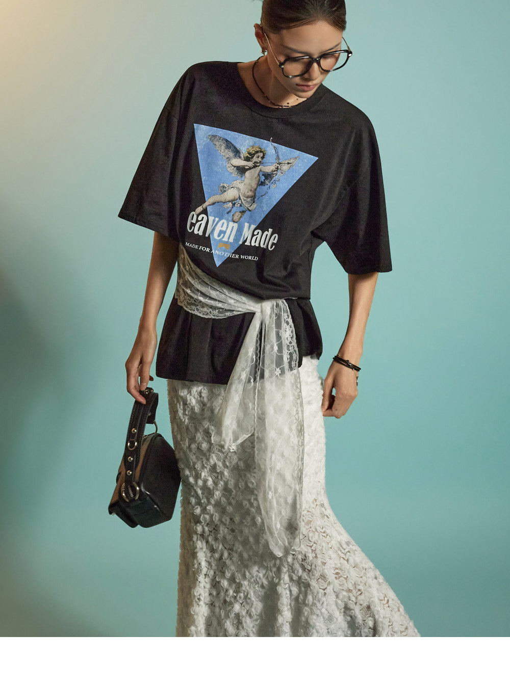 The all-over lace fabric creates a soft, romantic mood,