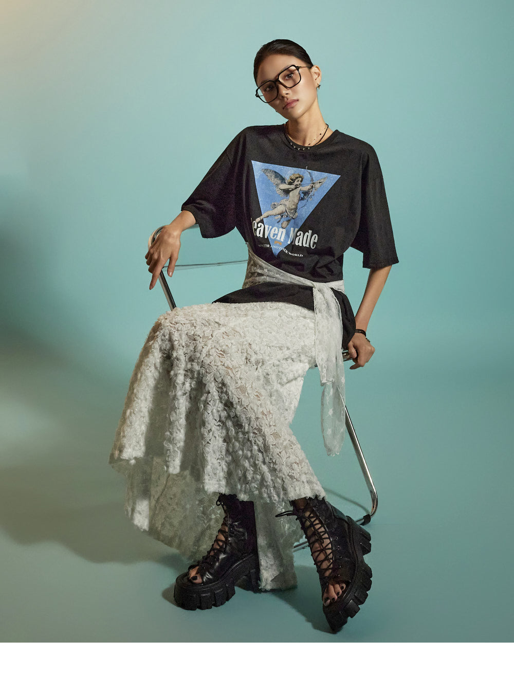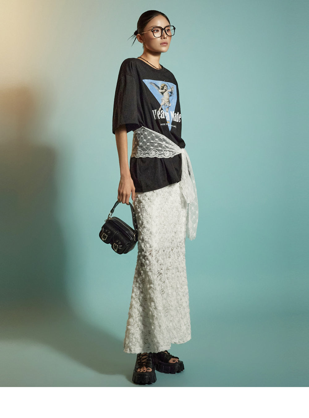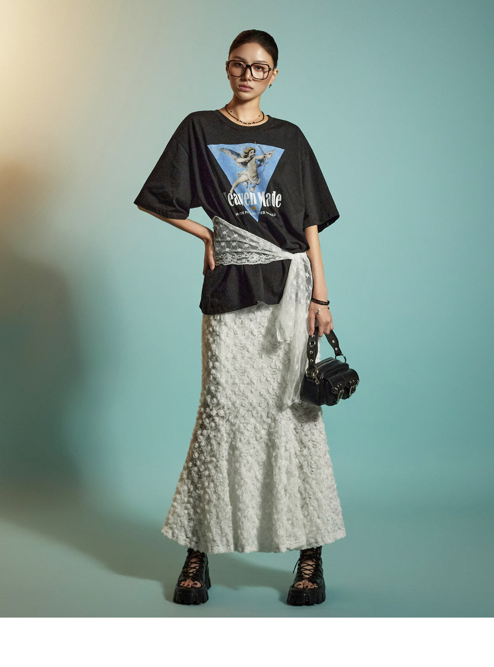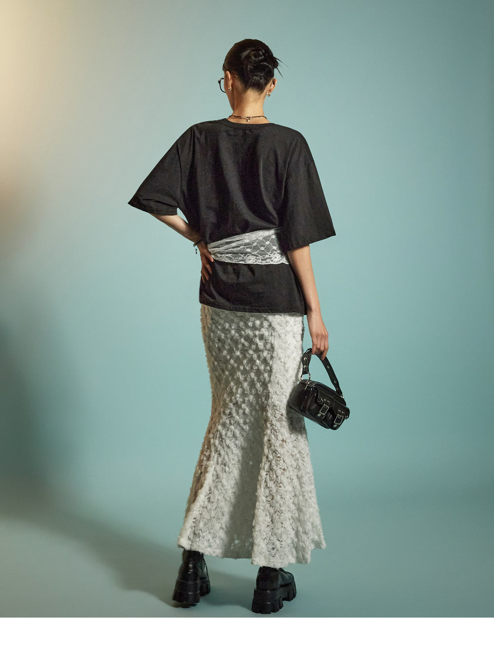 The all-over lace fabric creates a soft, romantic mood,
