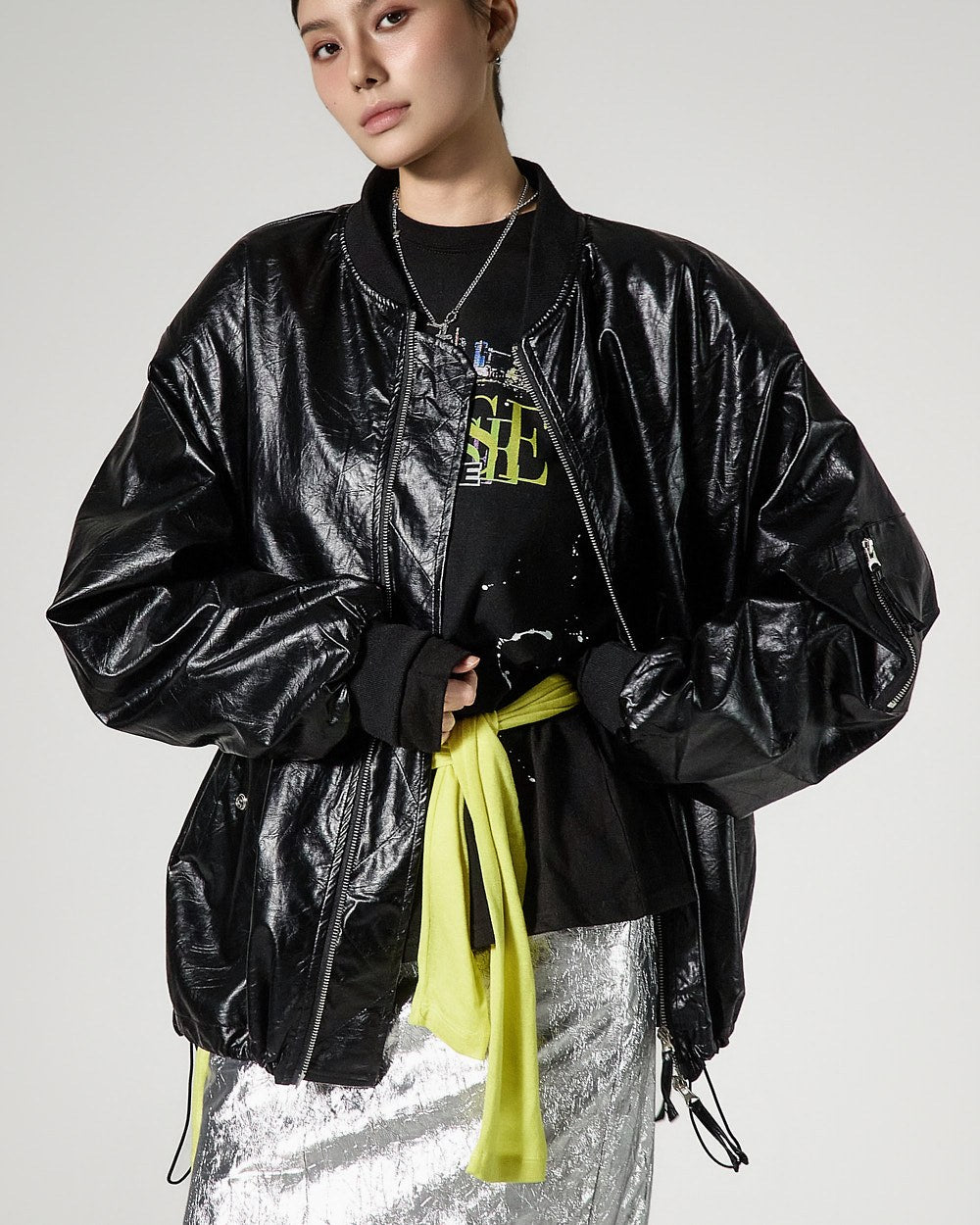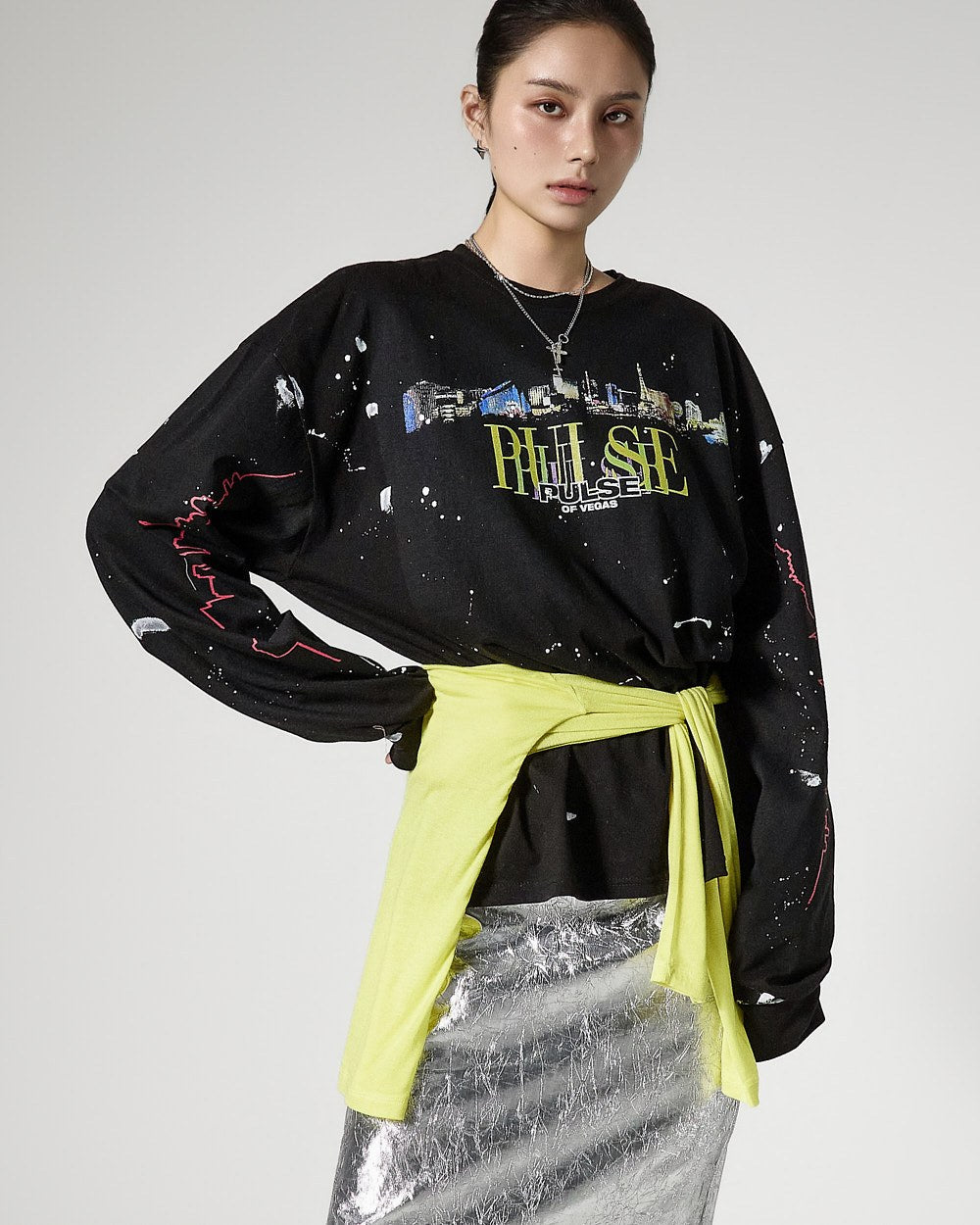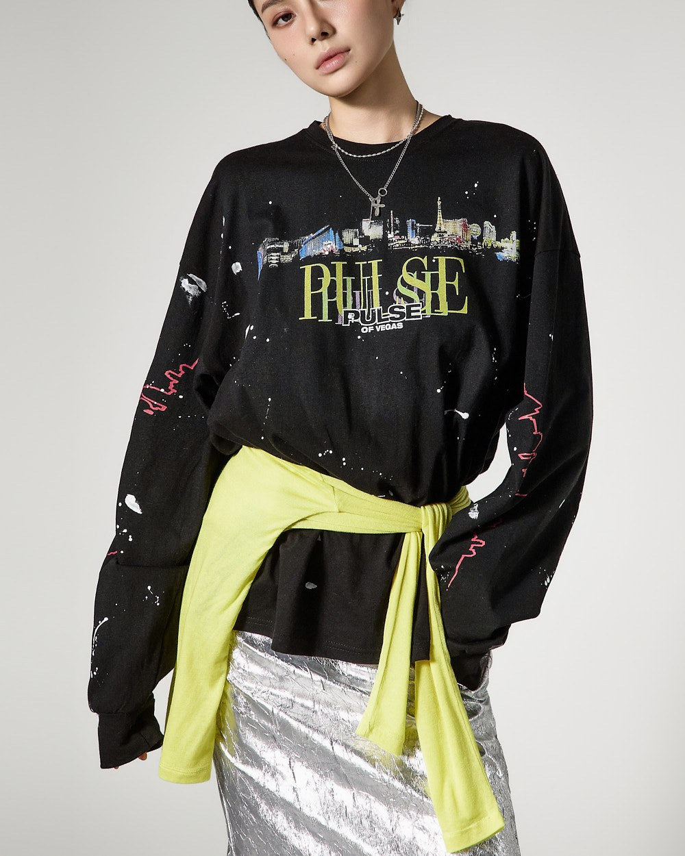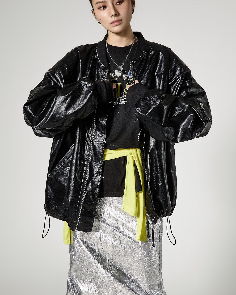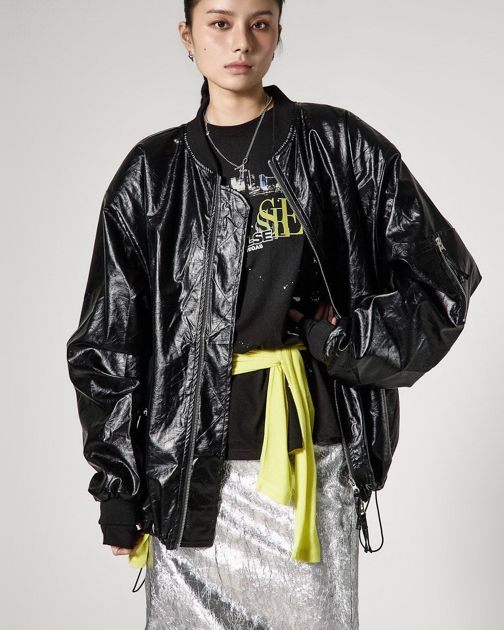モデルは身長171cmで、シルバーカラーのONEサイズを着用しています。
