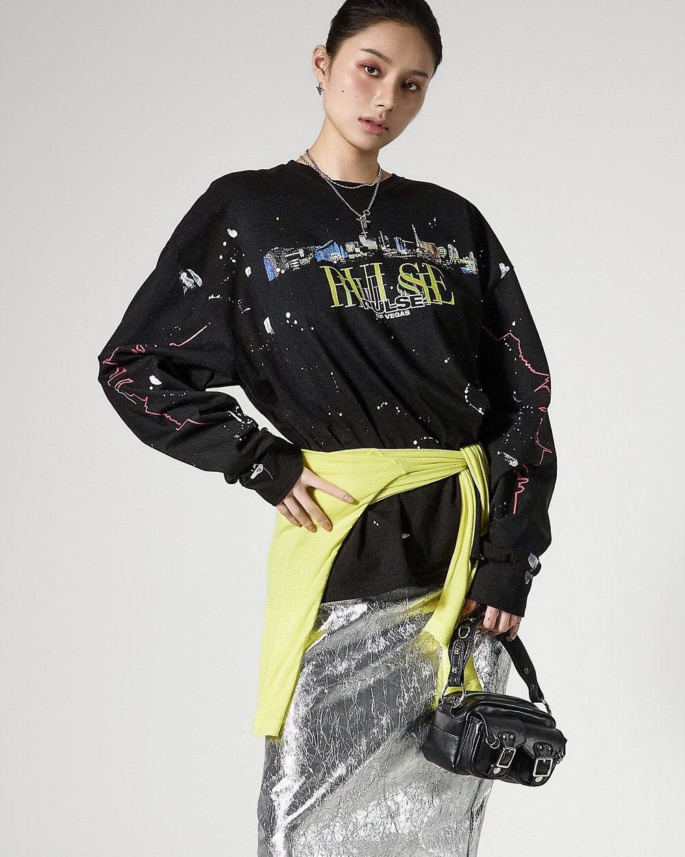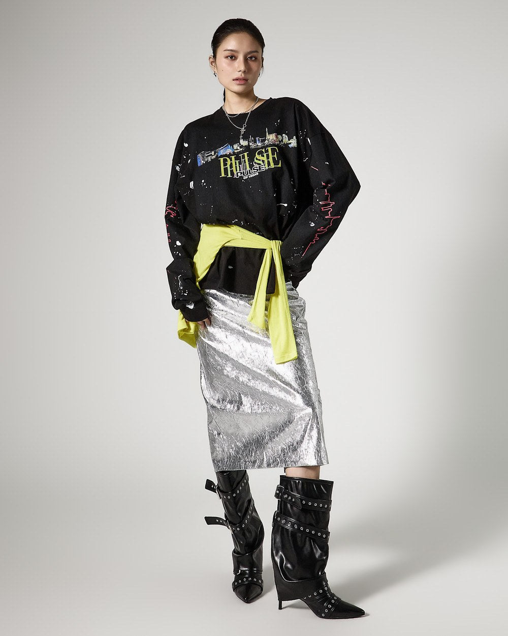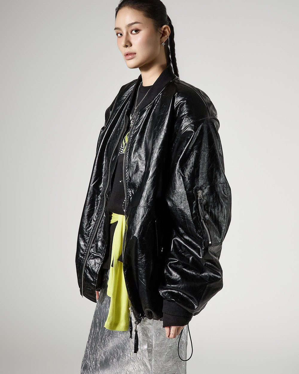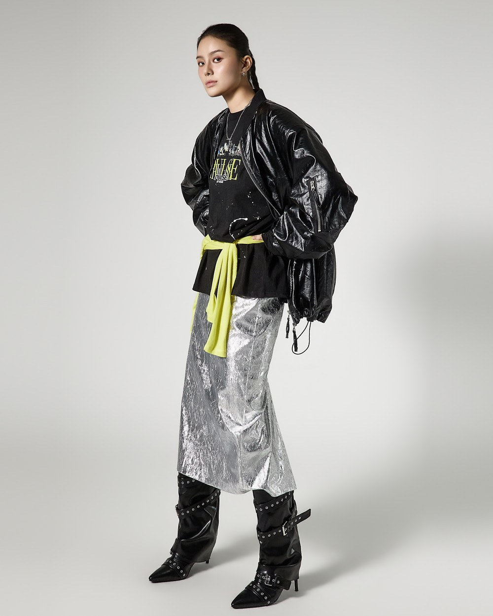 モデルは身長171cmで、シルバーカラーのONEサイズを着用しています。