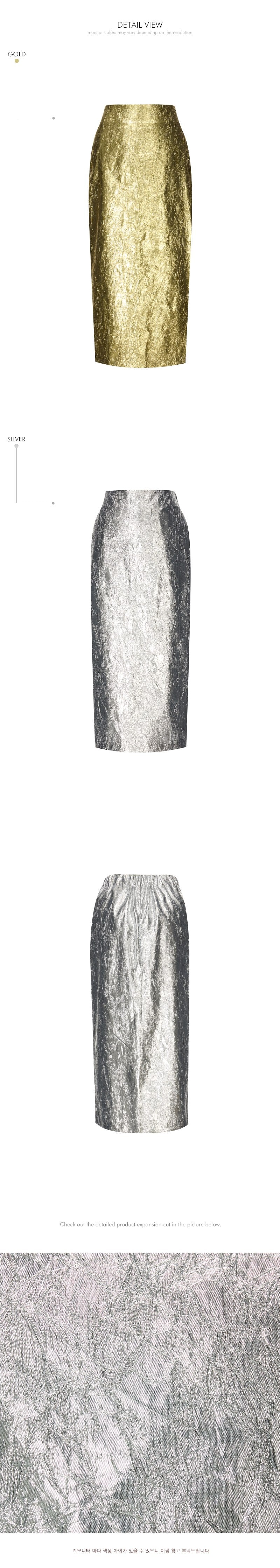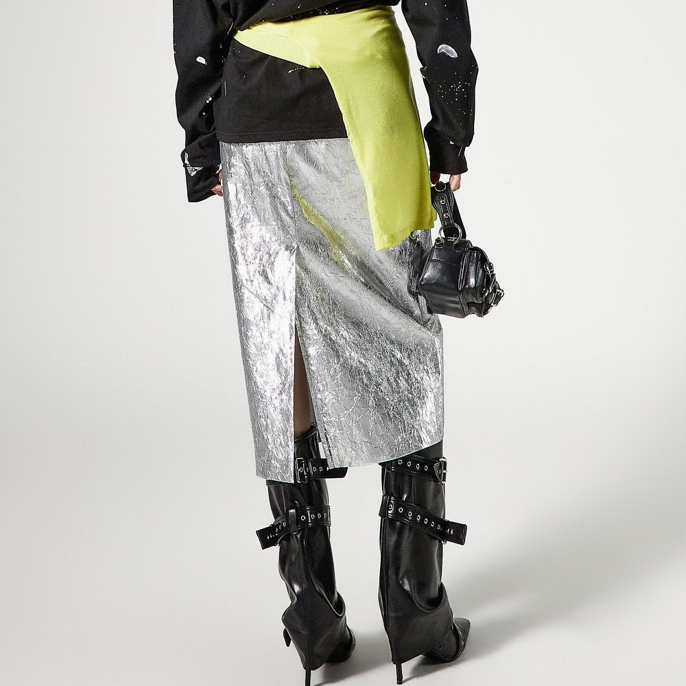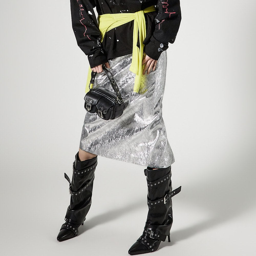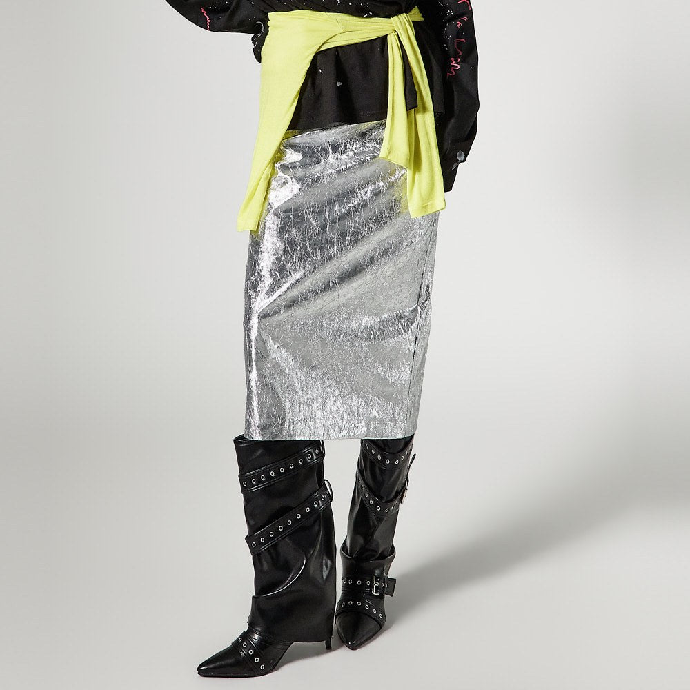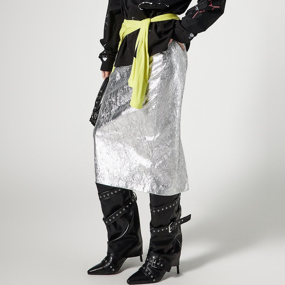 こちらは、独特の雰囲気を持つしわ加工されたメタリックスカートです。