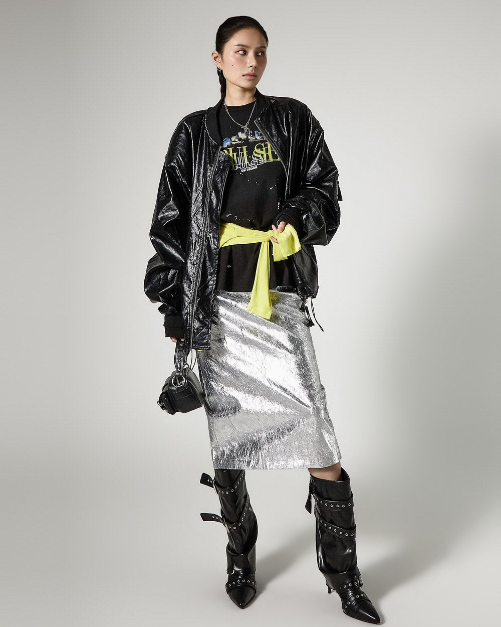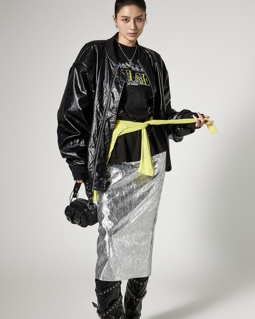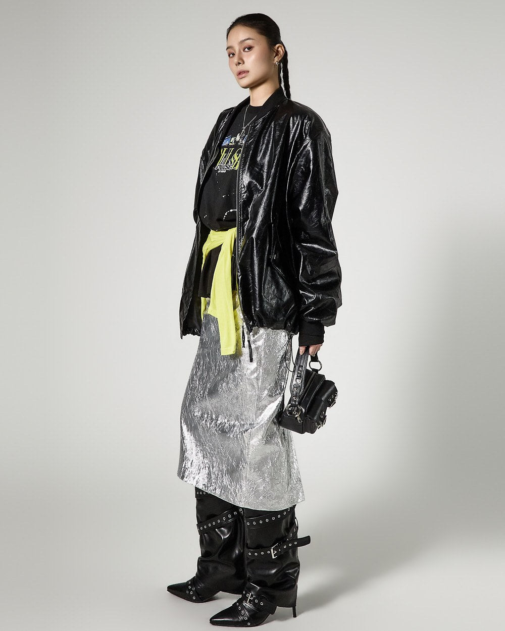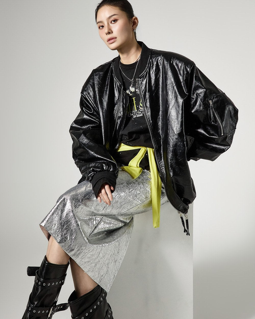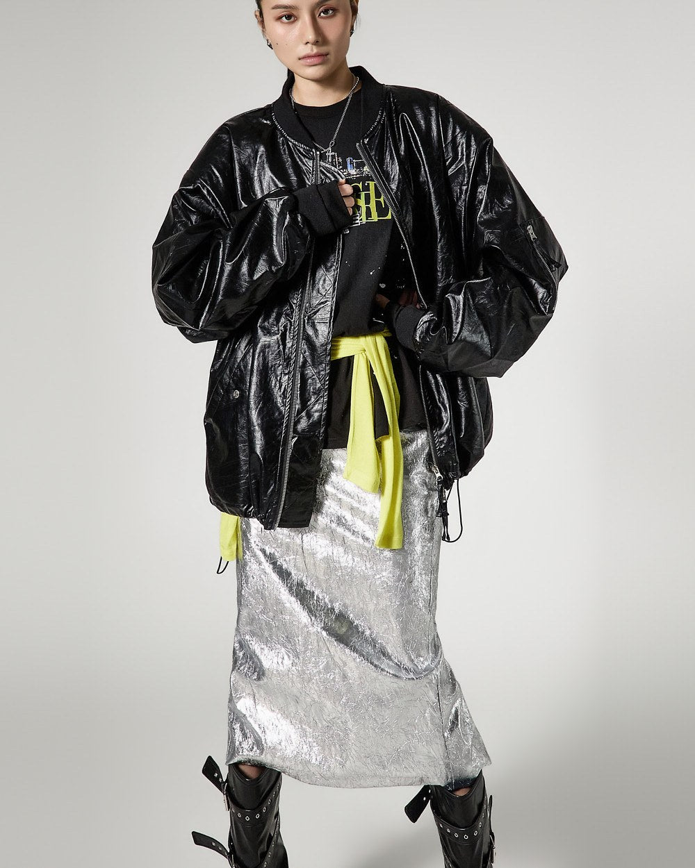 こちらは、独特の雰囲気を持つしわ加工されたメタリックスカートです。