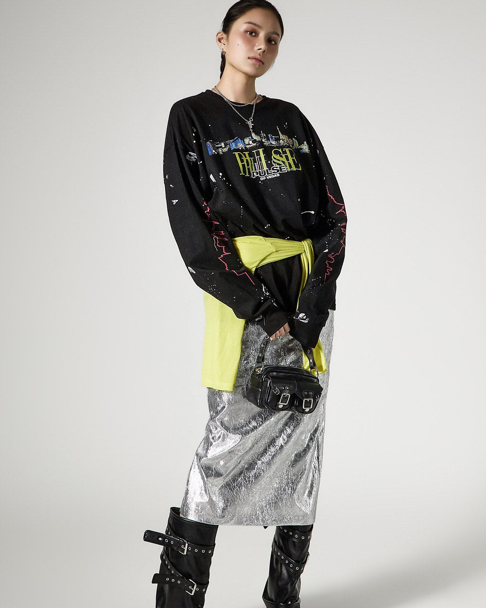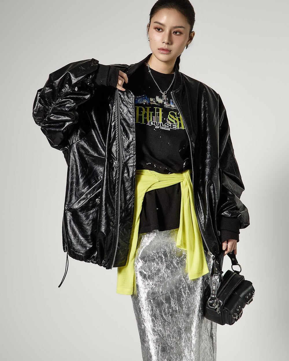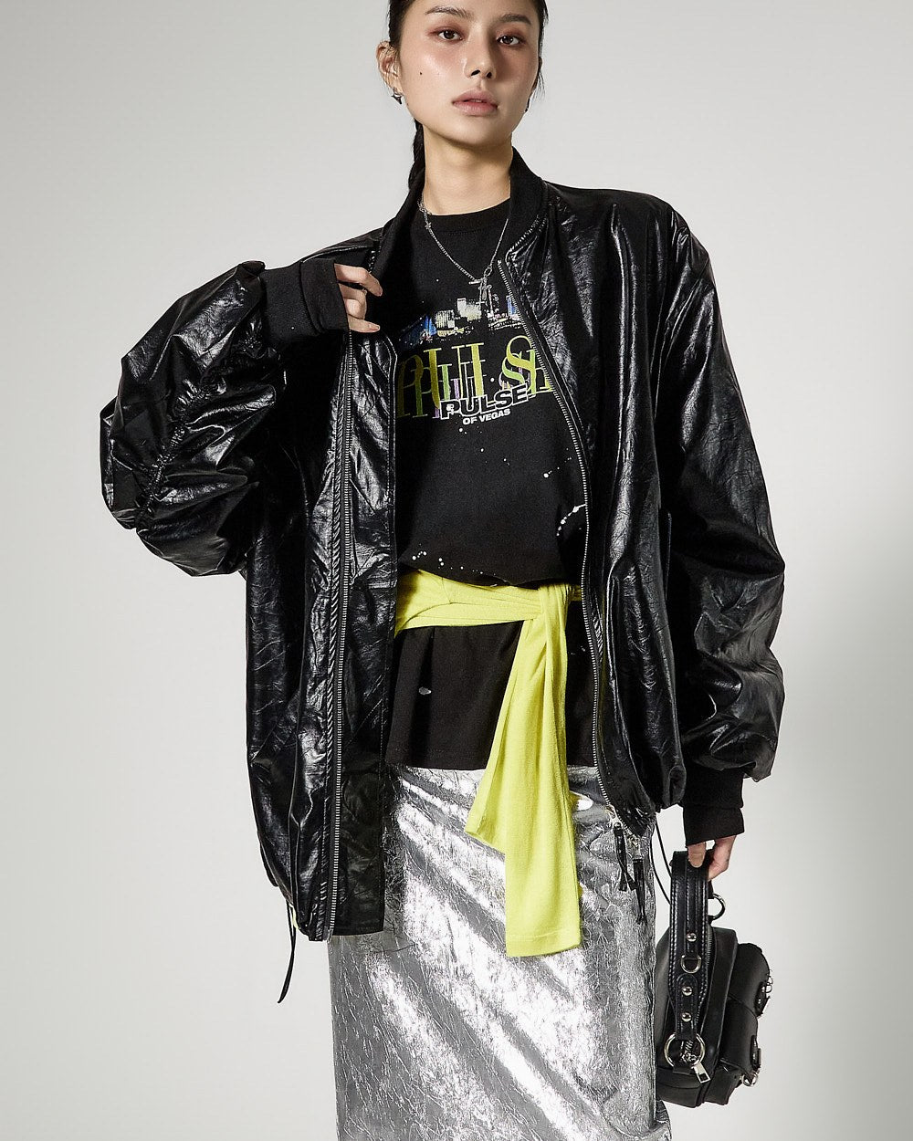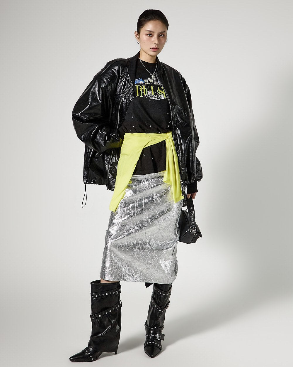 こちらは、独特の雰囲気を持つしわ加工されたメタリックスカートです。