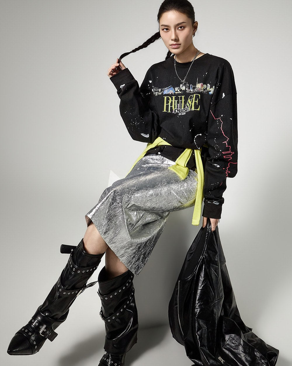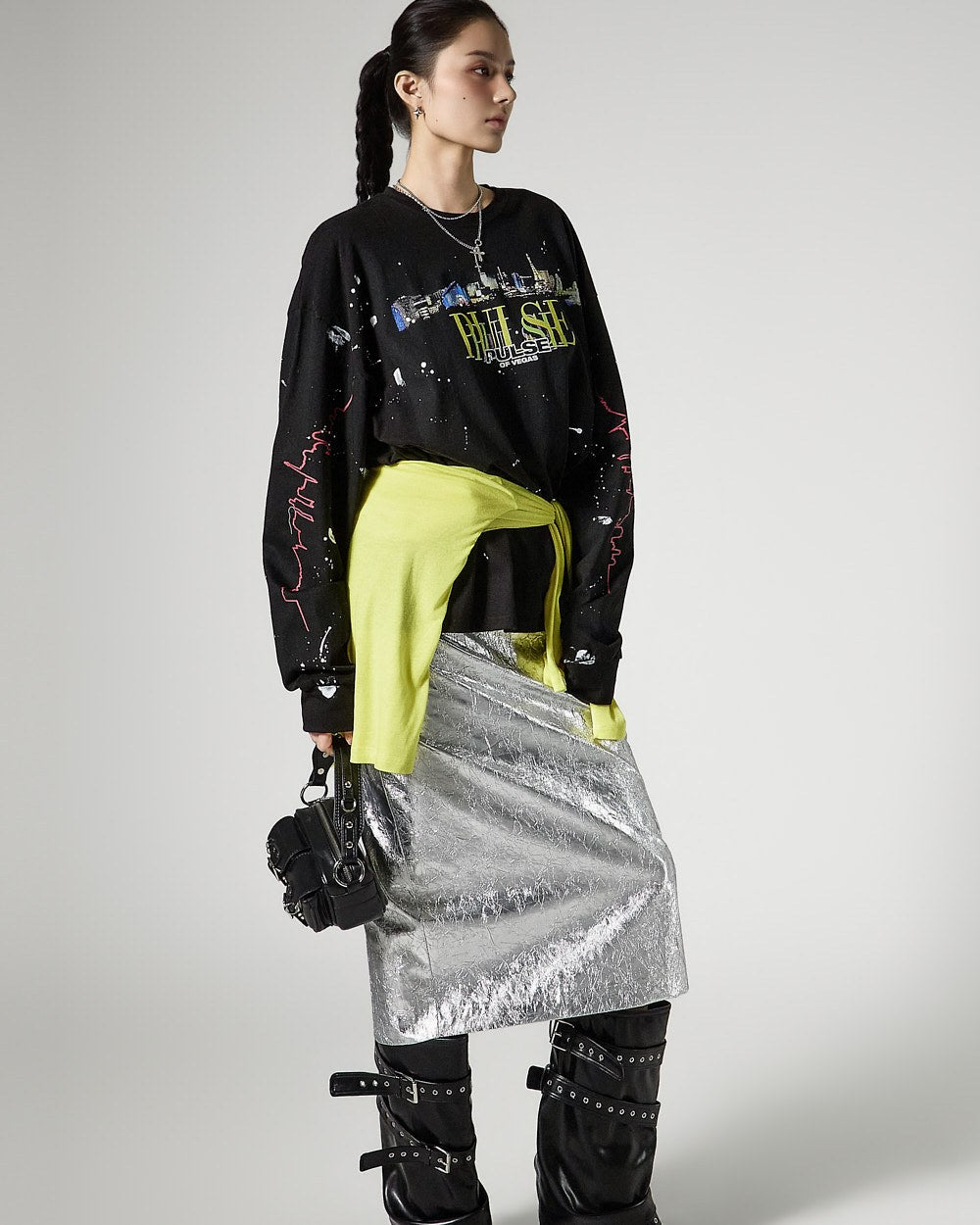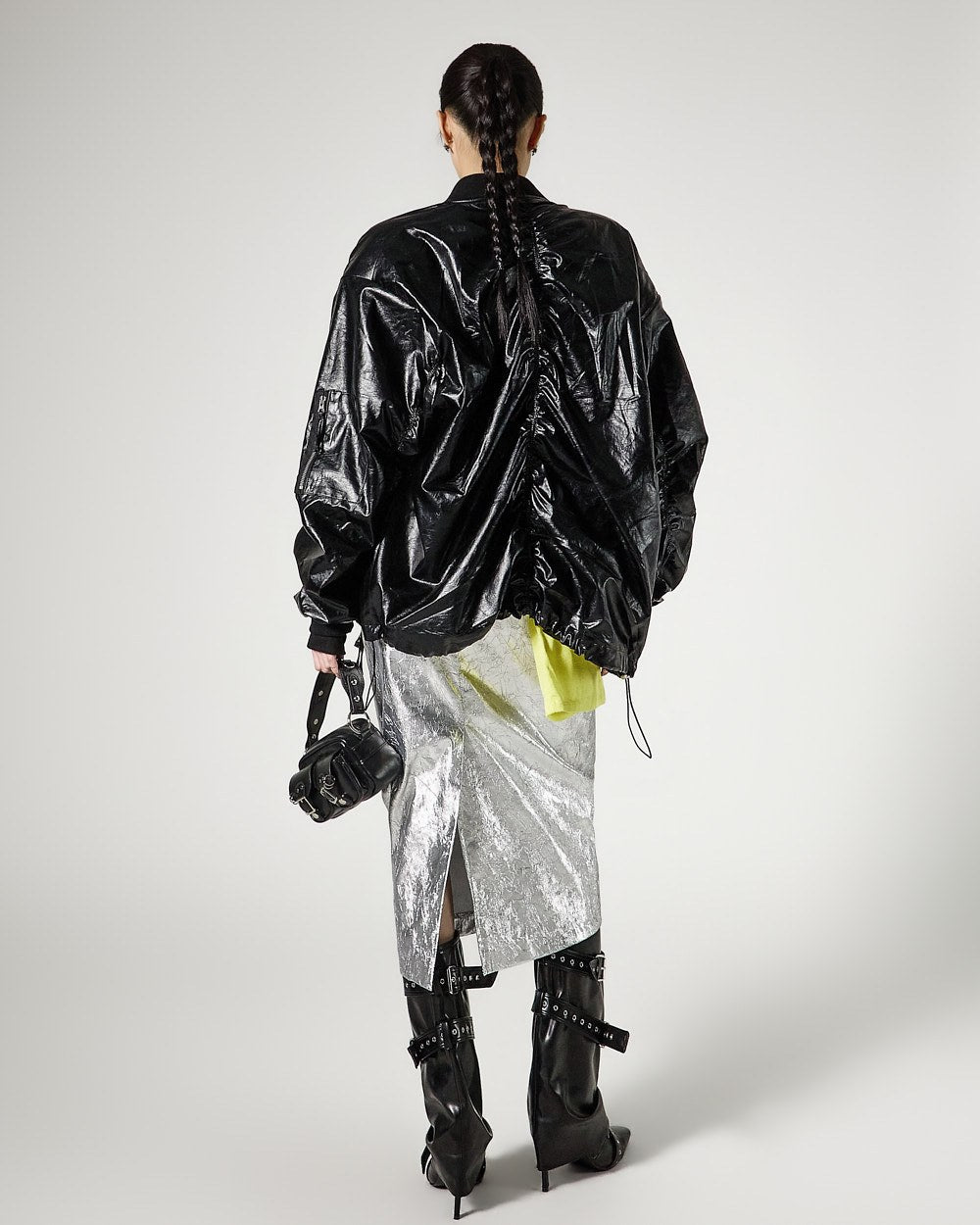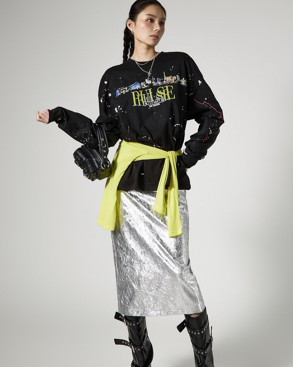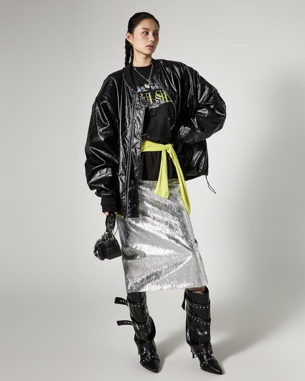 こちらは、独特の雰囲気を持つしわ加工されたメタリックスカートです。