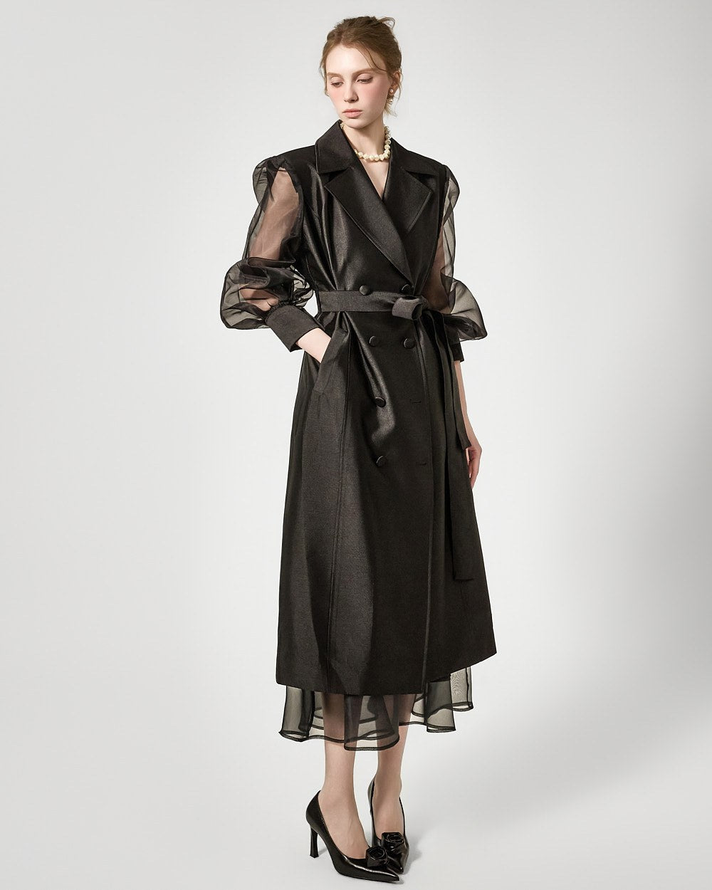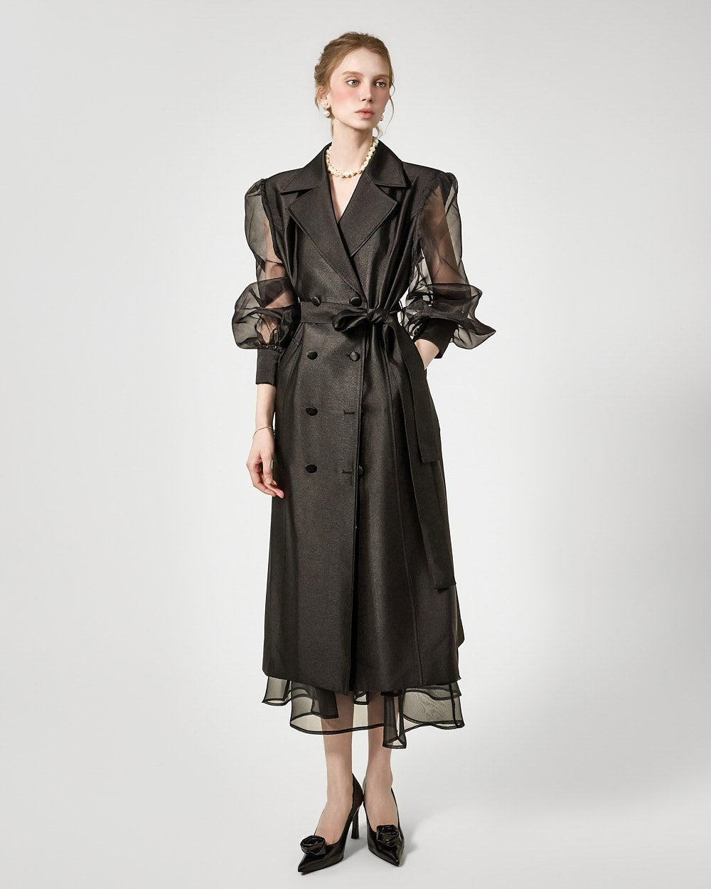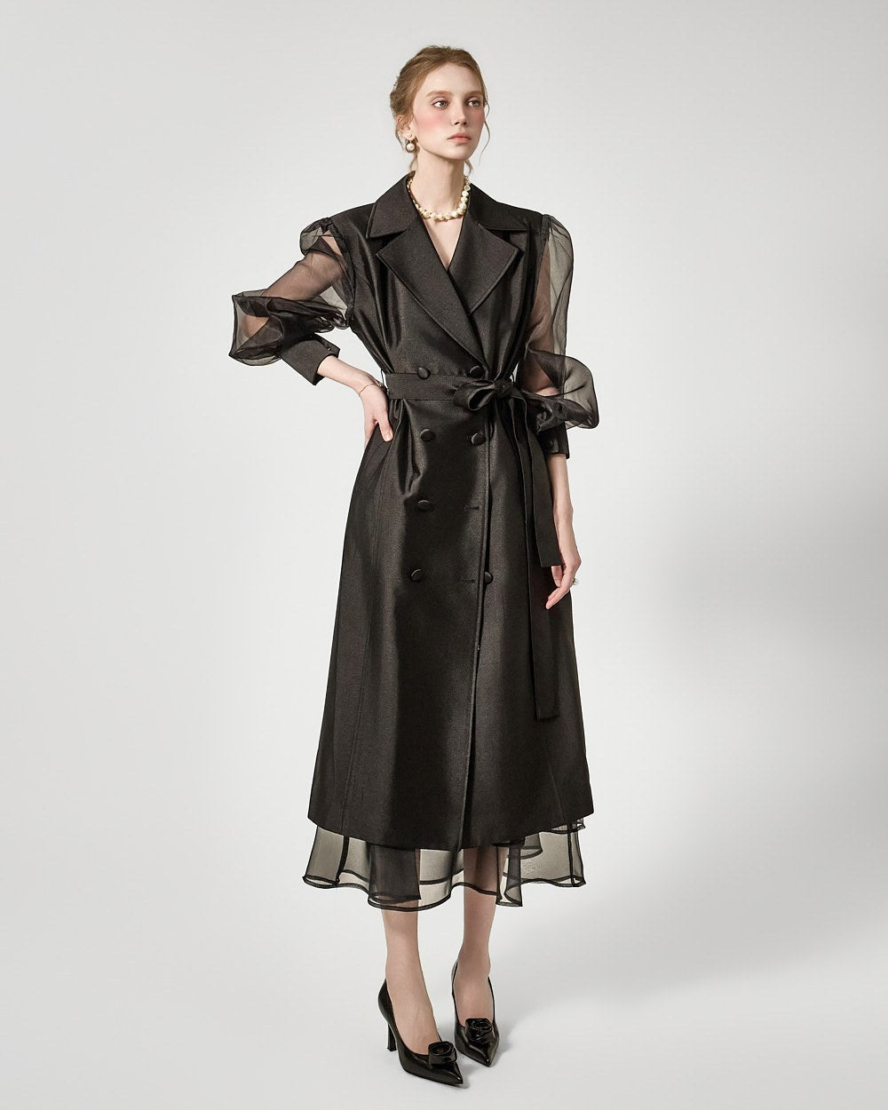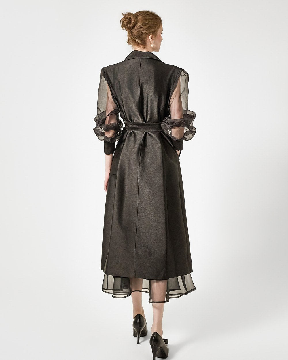 バックジッパーの開閉部には、さりげないシースルーディテールがアクセントになっています。