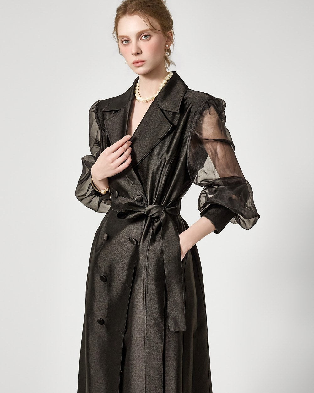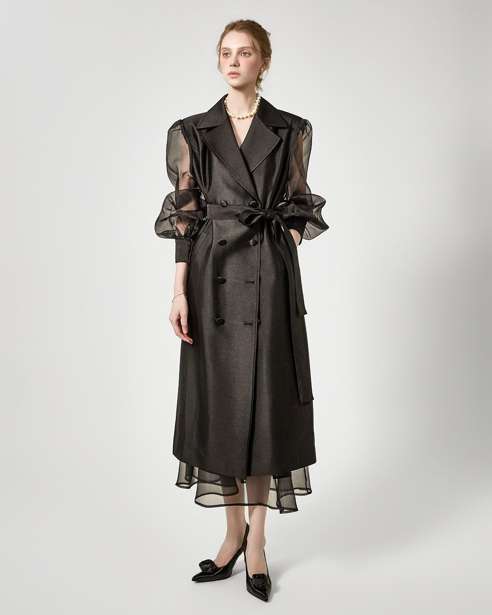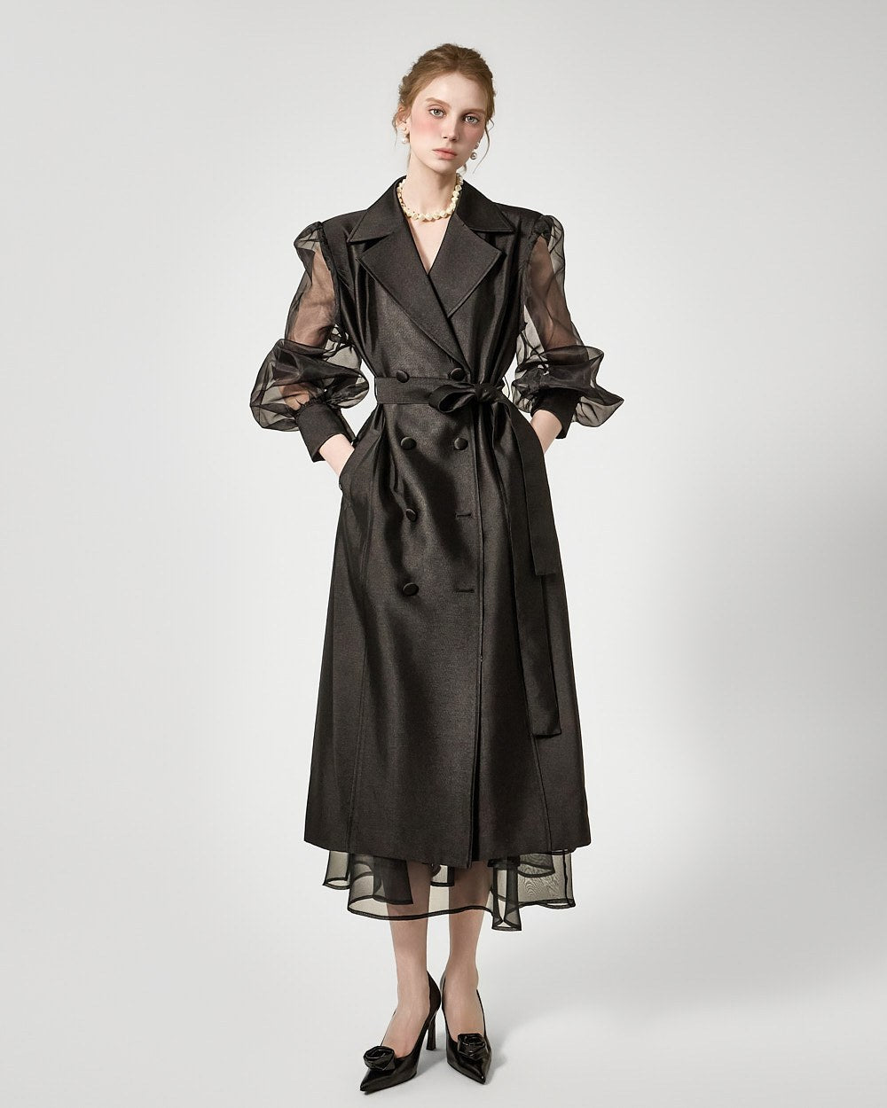 バックジッパーの開閉部には、さりげないシースルーディテールがアクセントになっています。