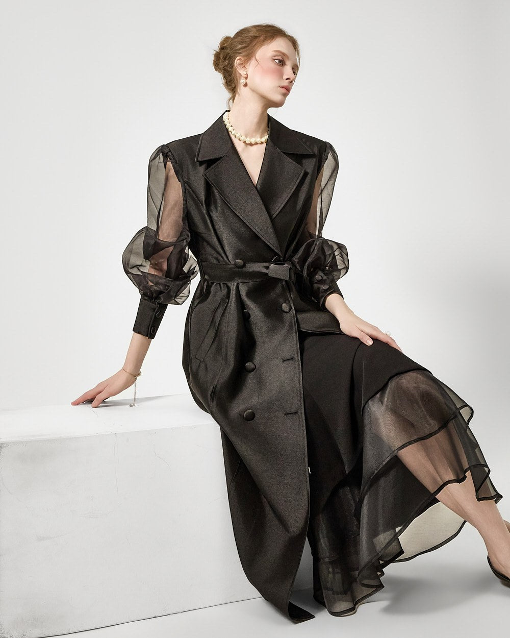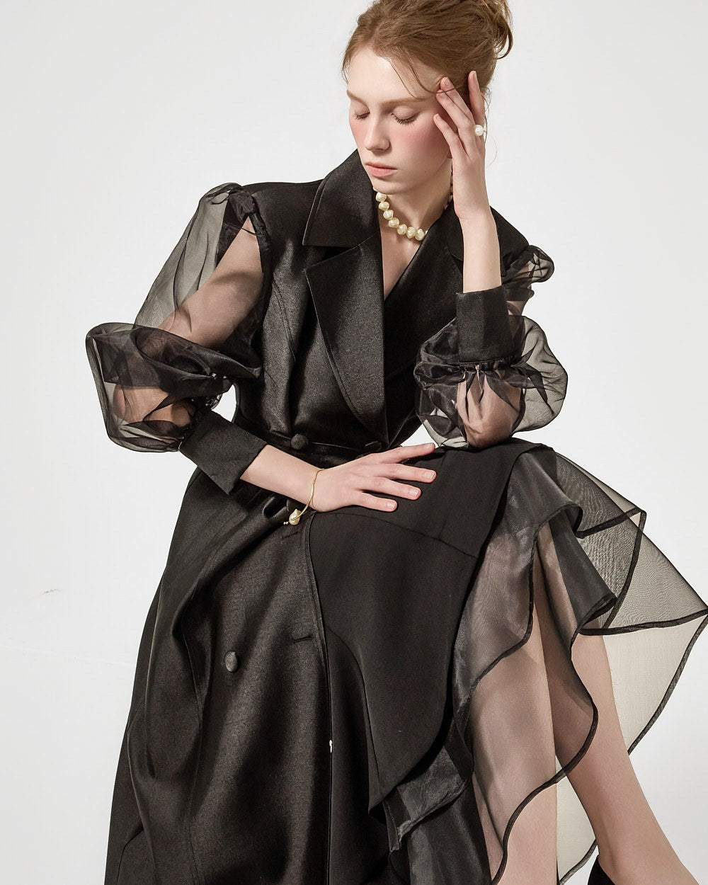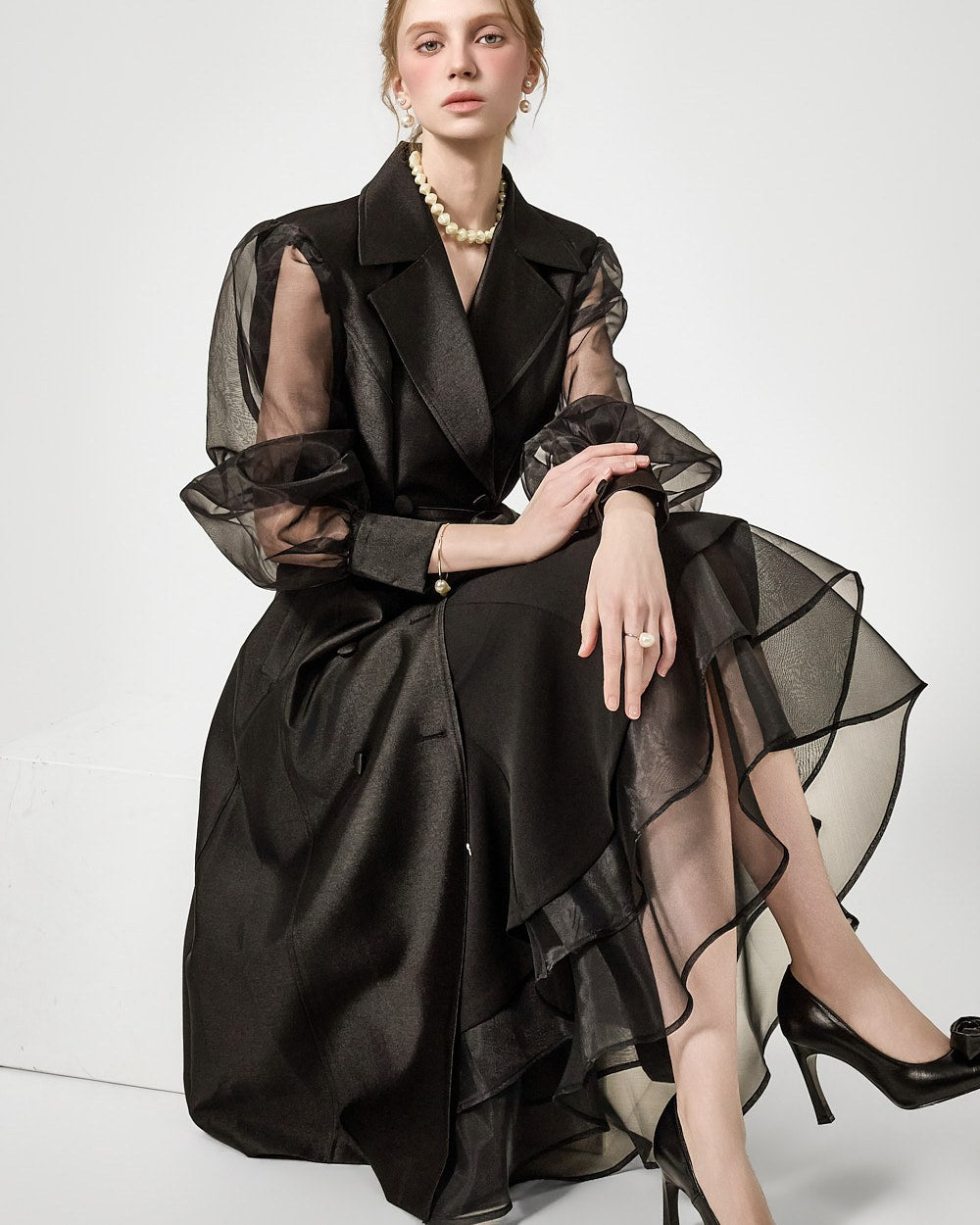 裾の3段フレアがドラマチックなシルエットを演出します。