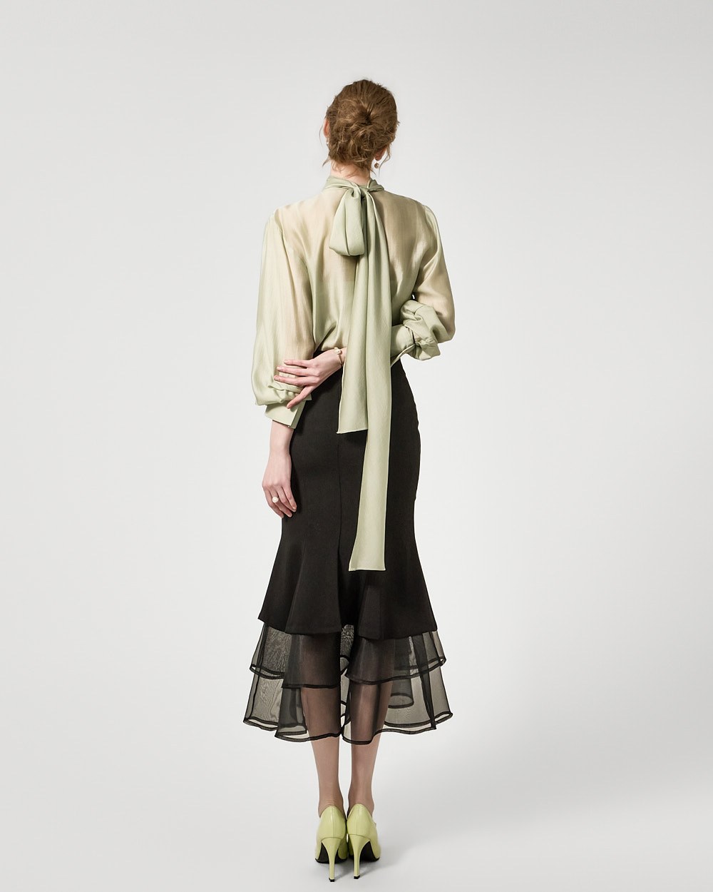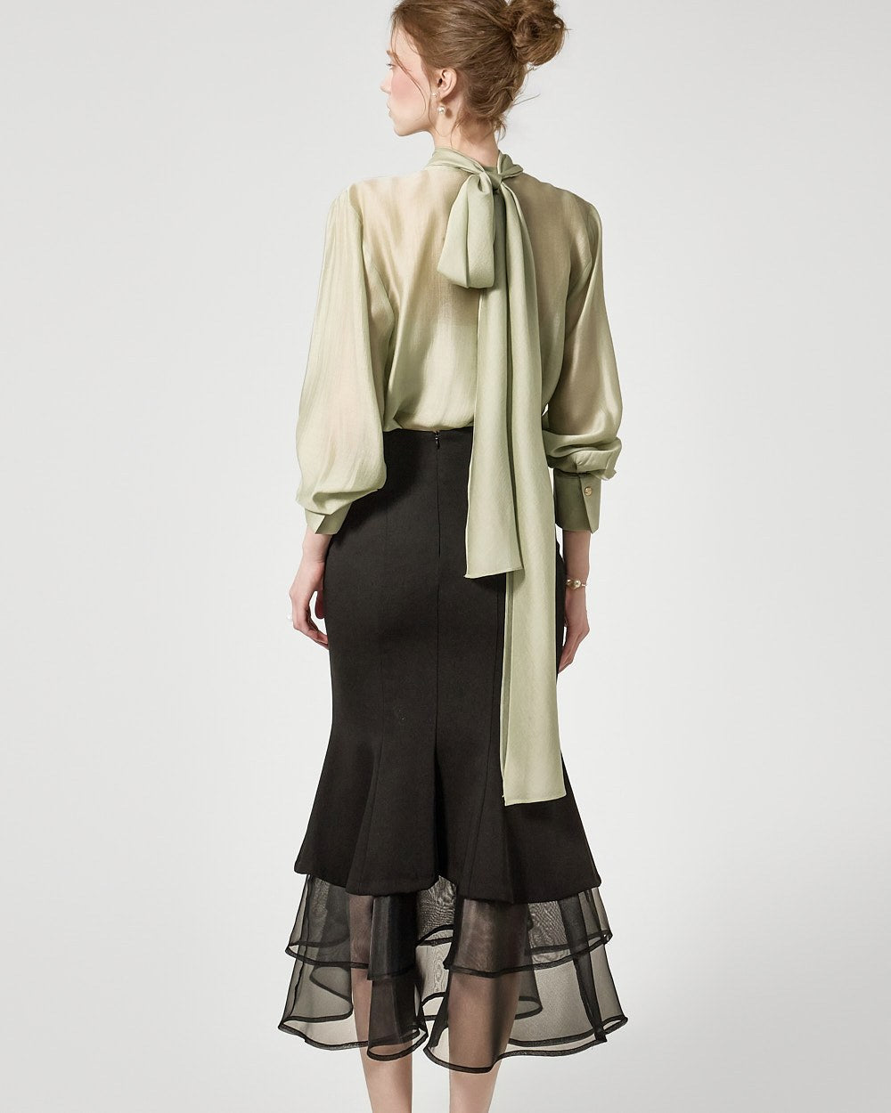 ボディラインに沿ってスリムに落ちるマーメイドフィットのシルエットは、