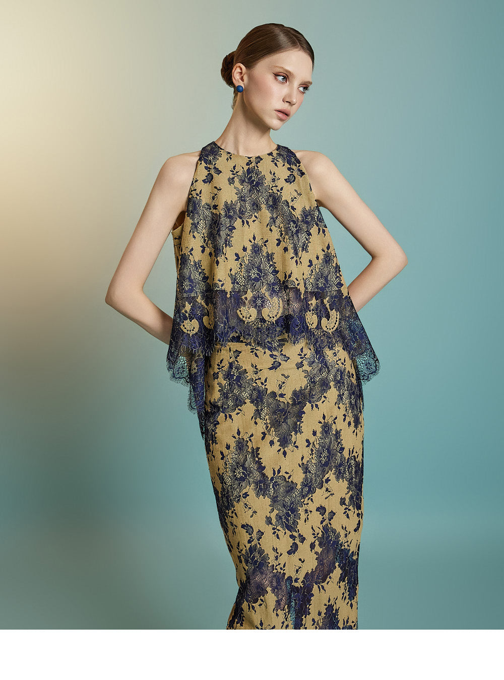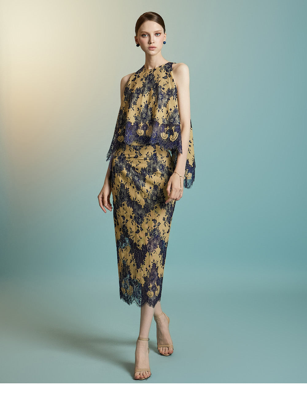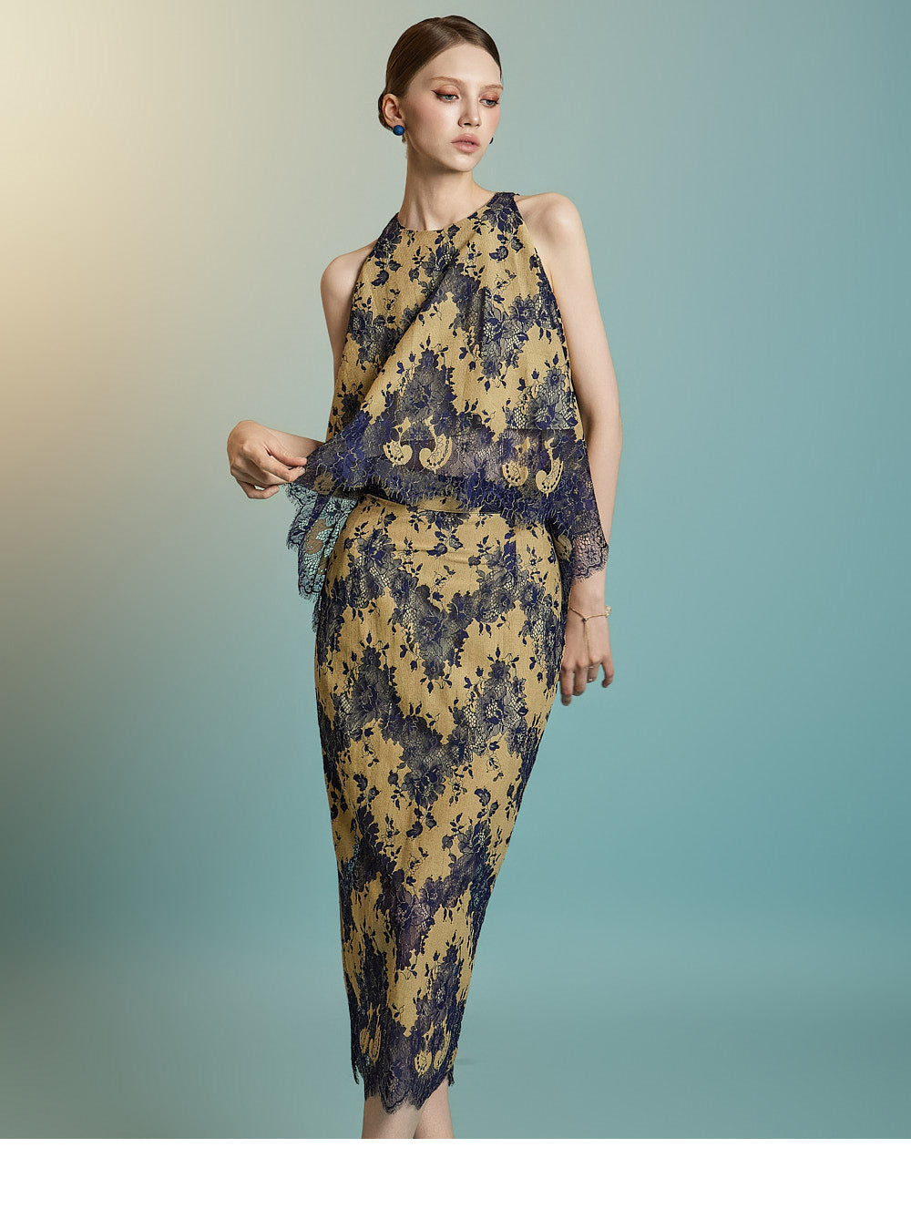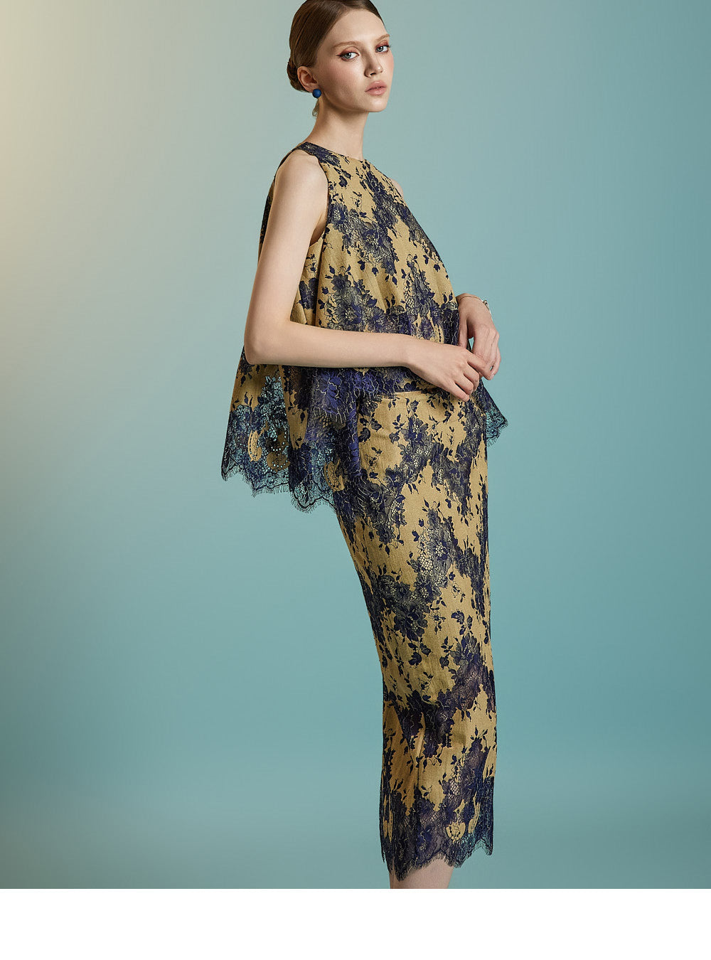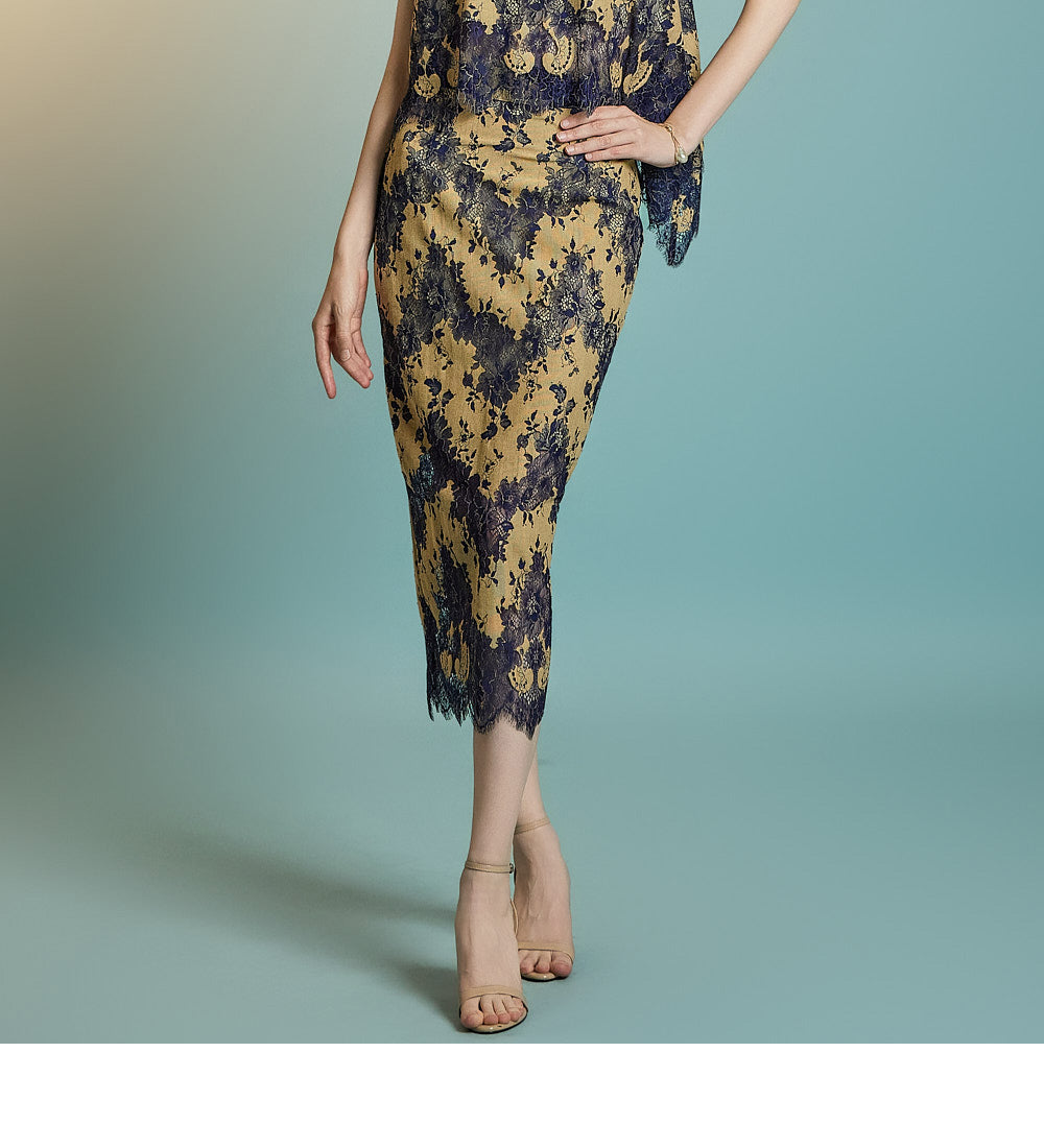 全体に花柄のレース生地を使用し、裾には透け感のあるディテールを施し、さりげないアクセントを添えています。