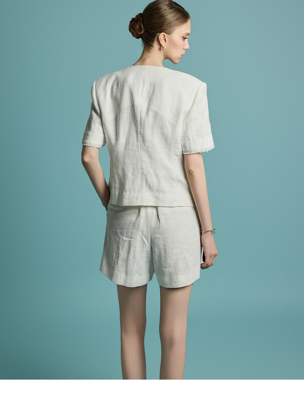 ノーカラージャケットにゆったりとしたハーフパンツを合わせた