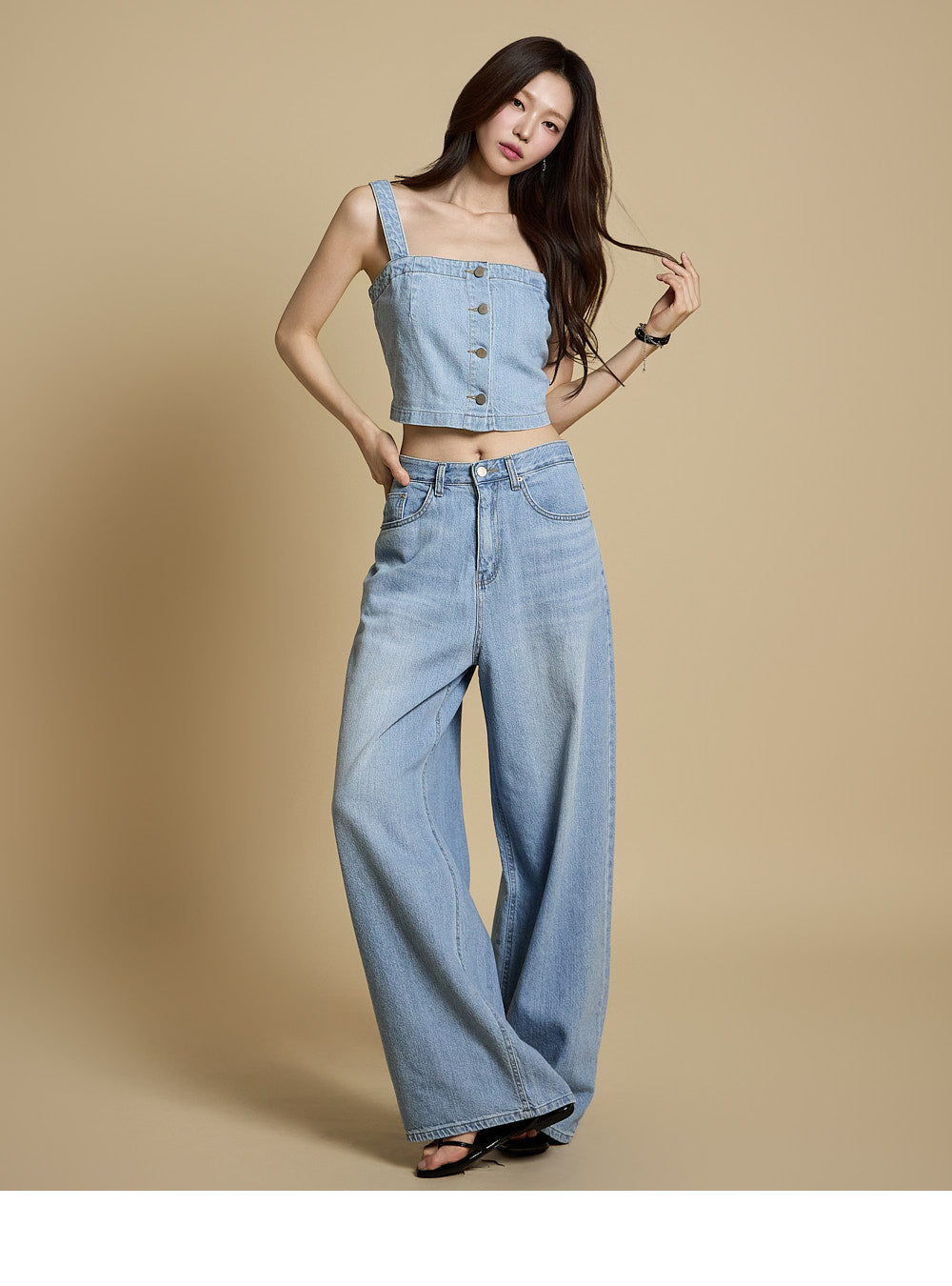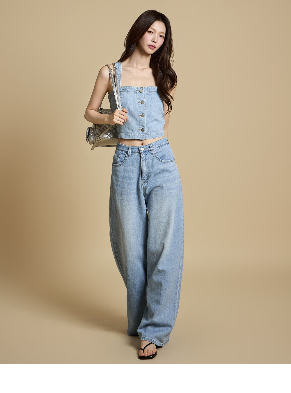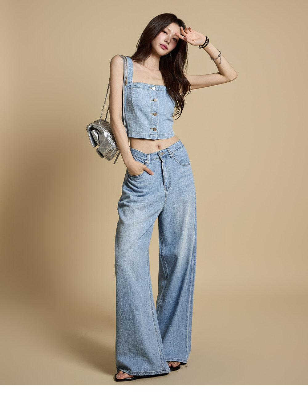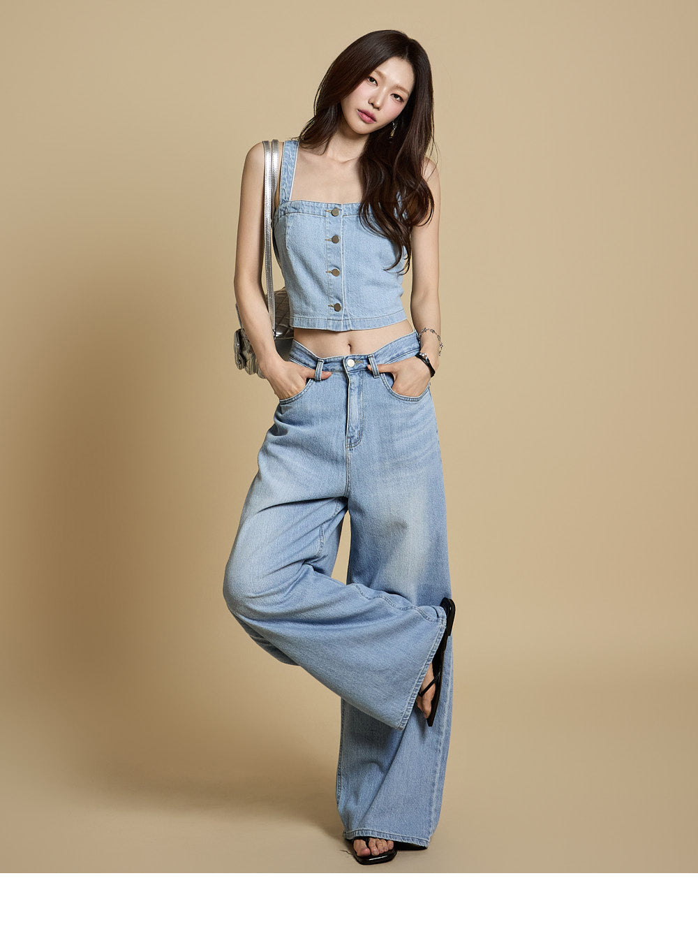 ビスチェとワイドレッグジーンズを組み合わせることで、自然でスタイリッシュなシルエットが生まれます。