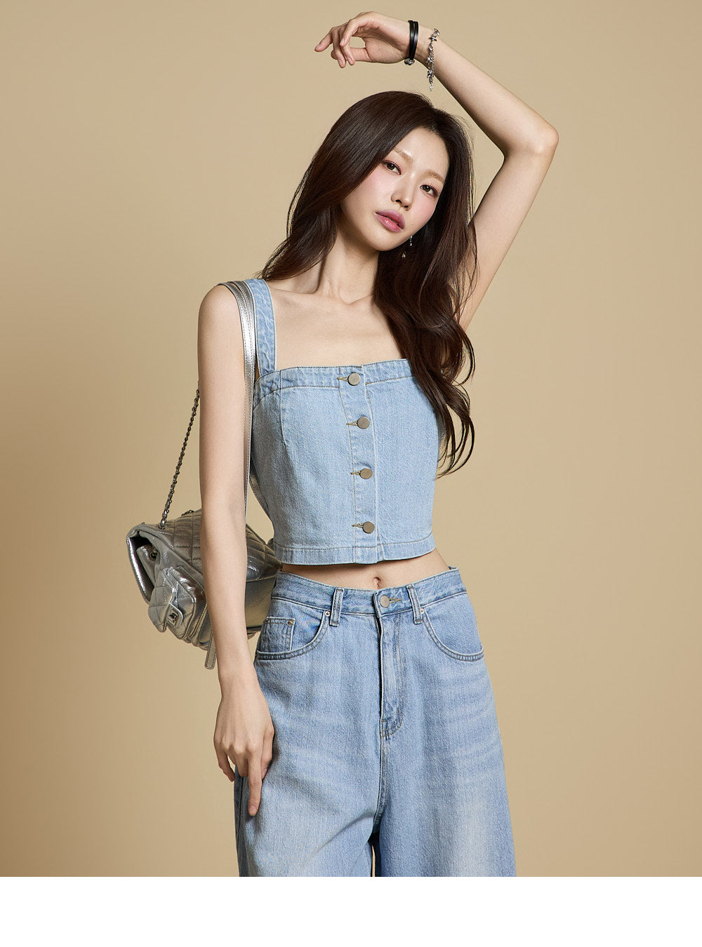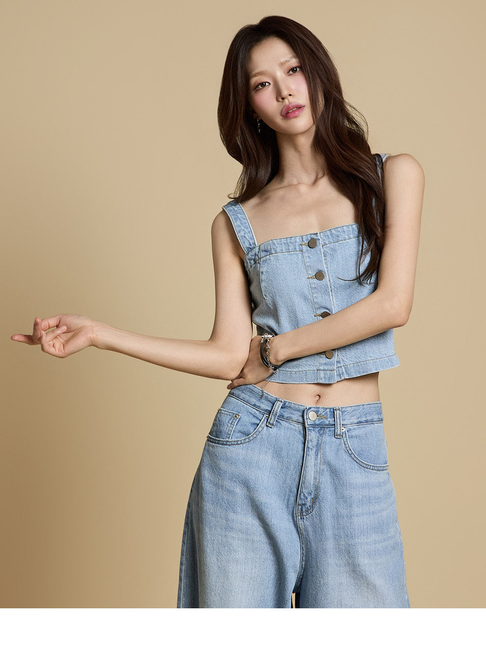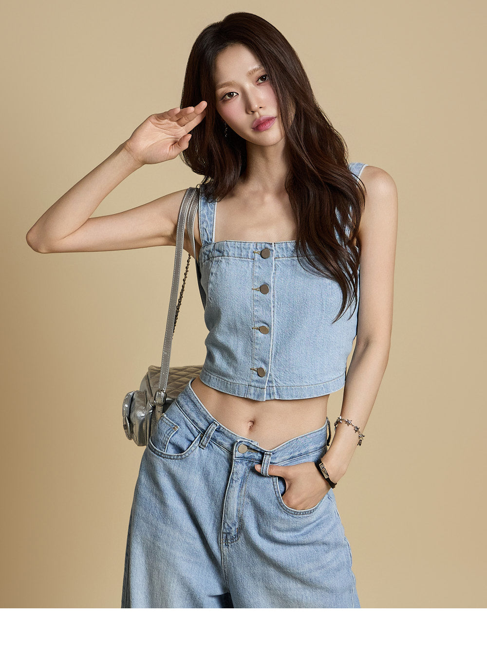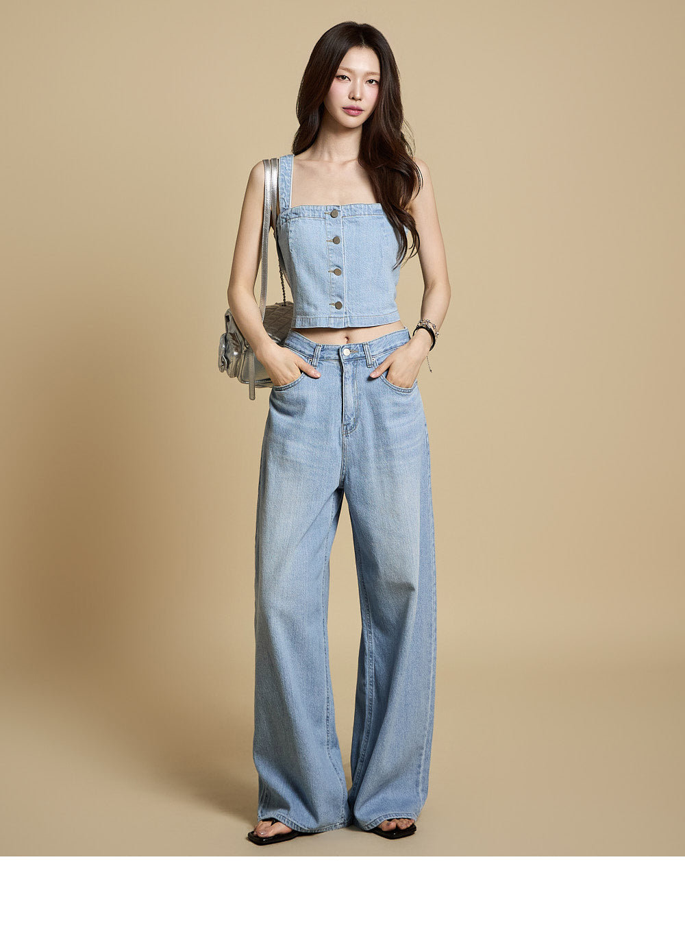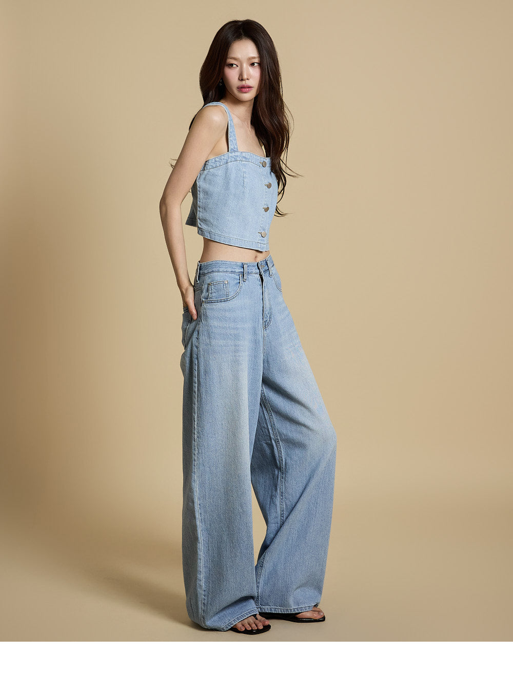 ビスチェとワイドレッグジーンズを組み合わせることで、自然でスタイリッシュなシルエットが生まれます。