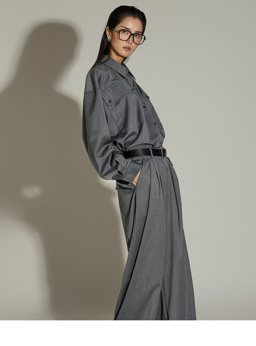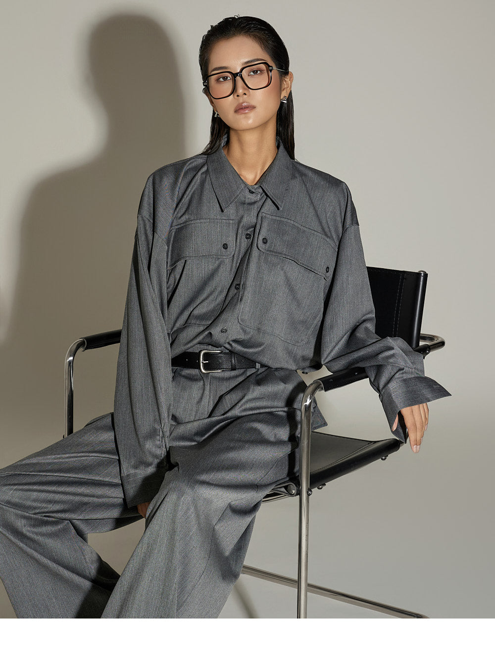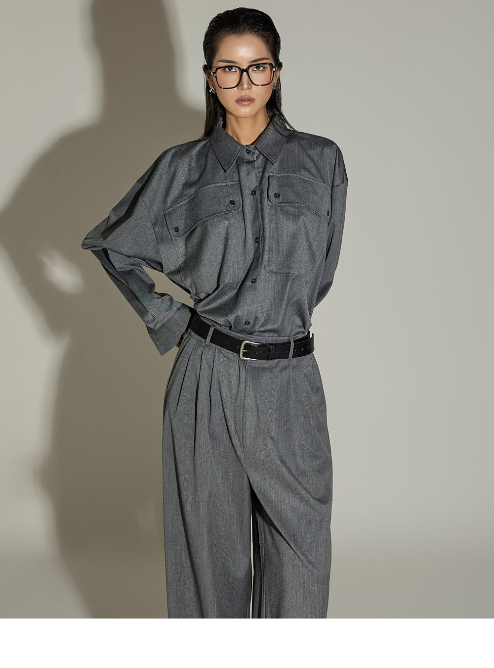 This is a casual shirt and slacks set.