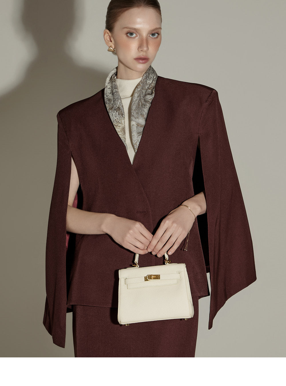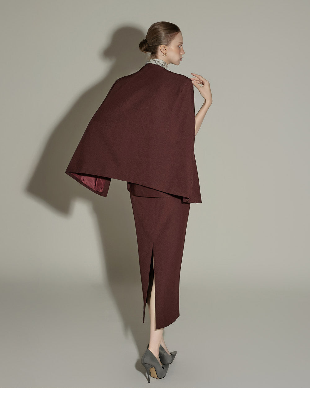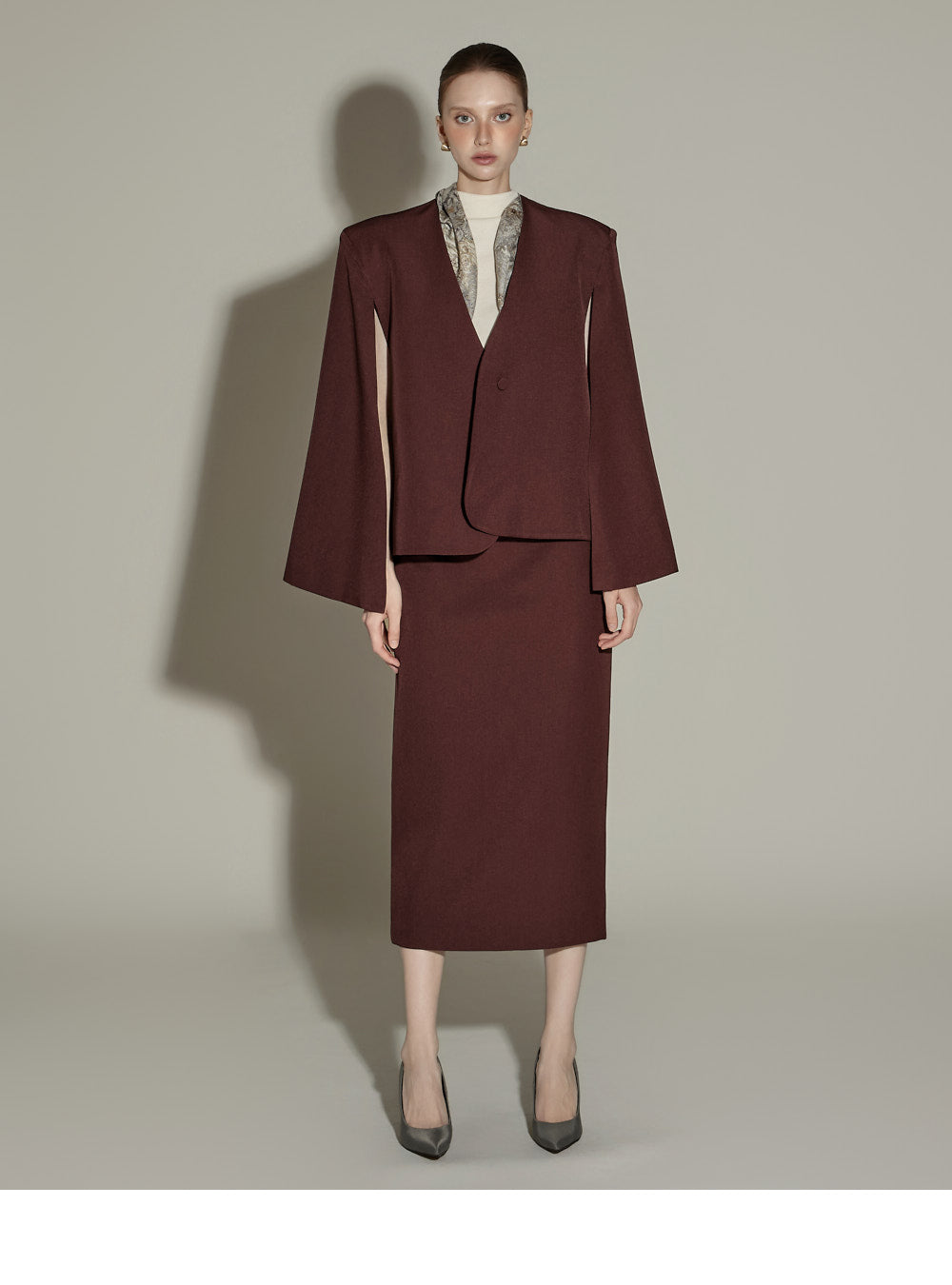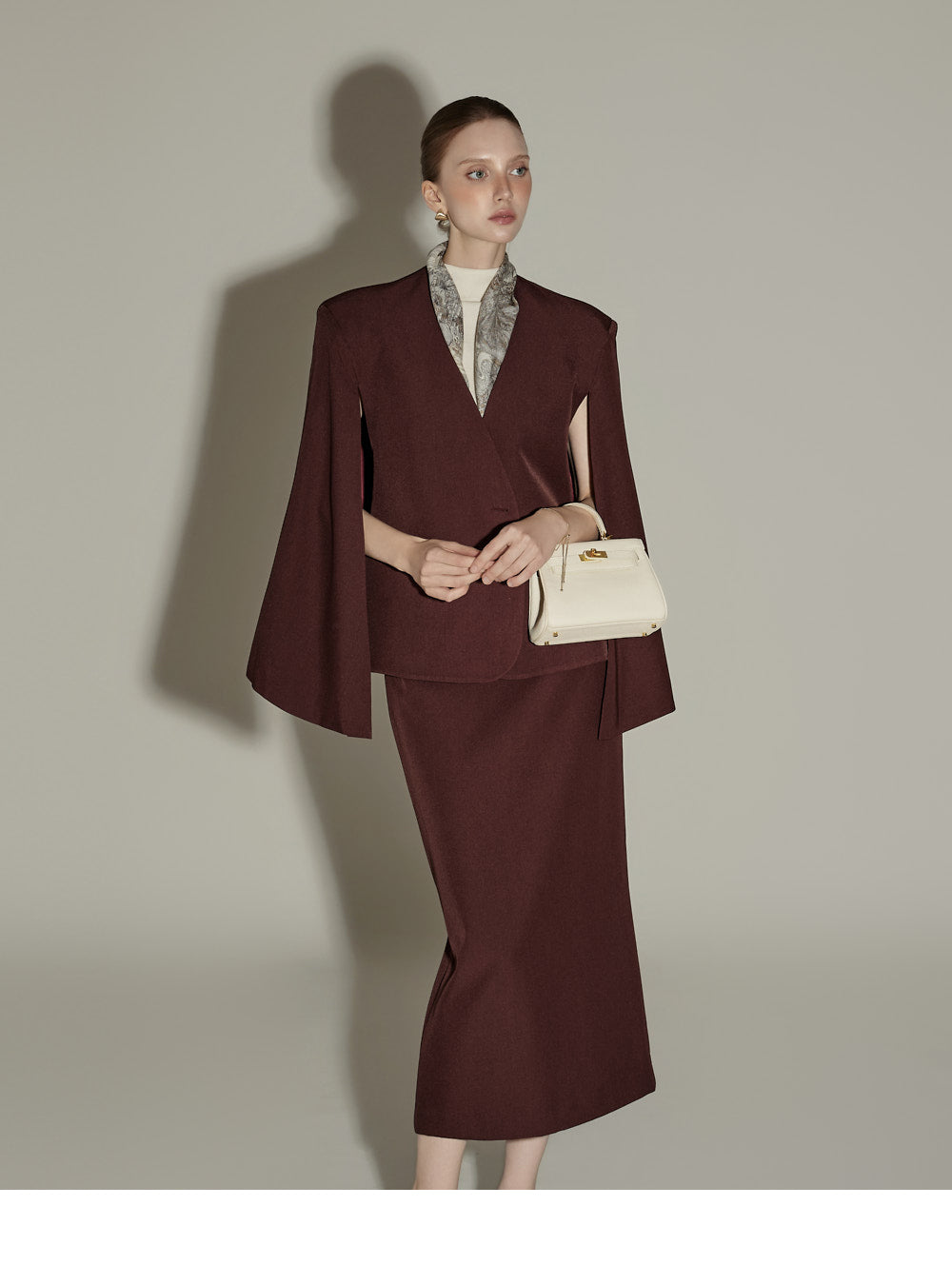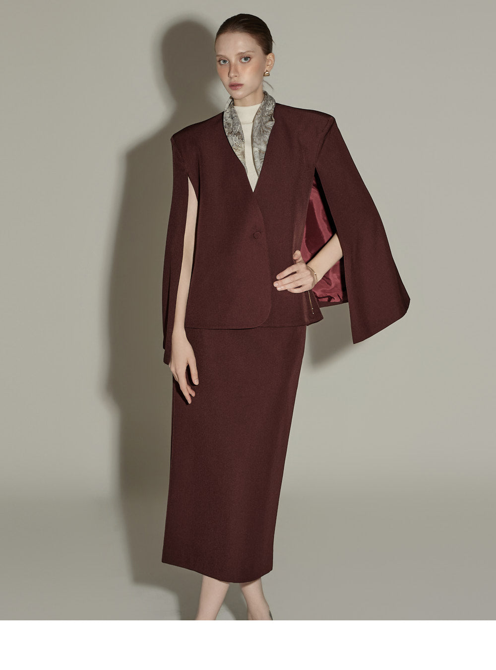 This sophisticated jacket and skirt set is crafted from a polyester and spandex blend,