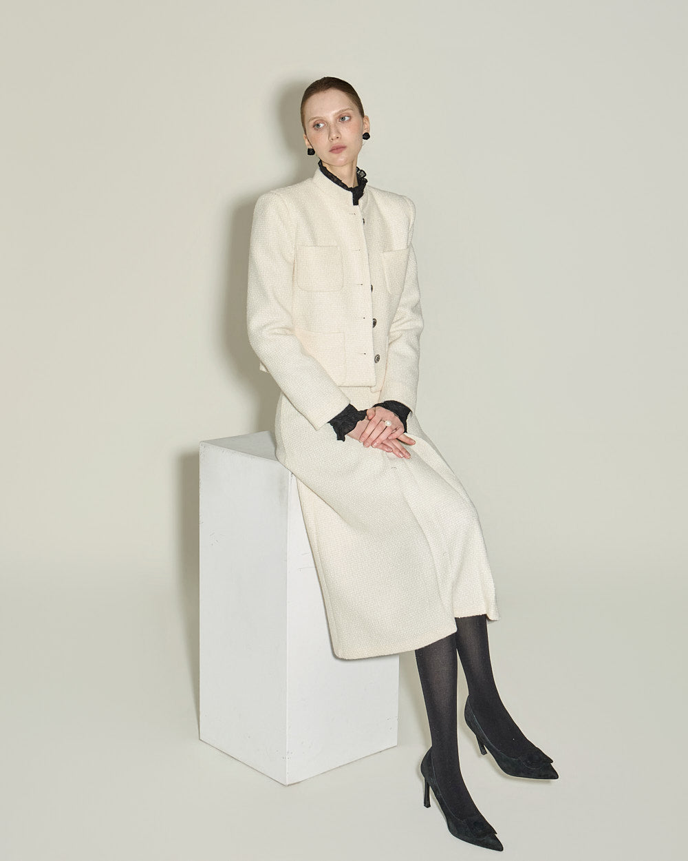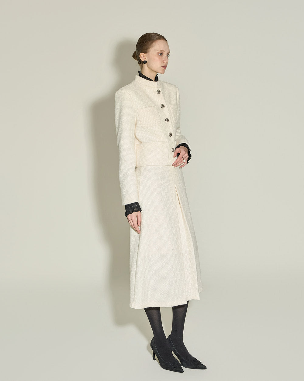 This jacket and skirt set exudes a modern vibe.