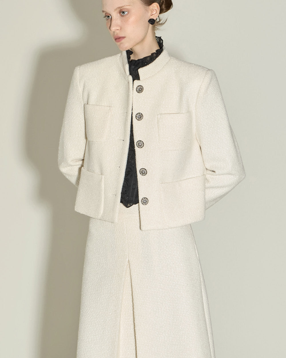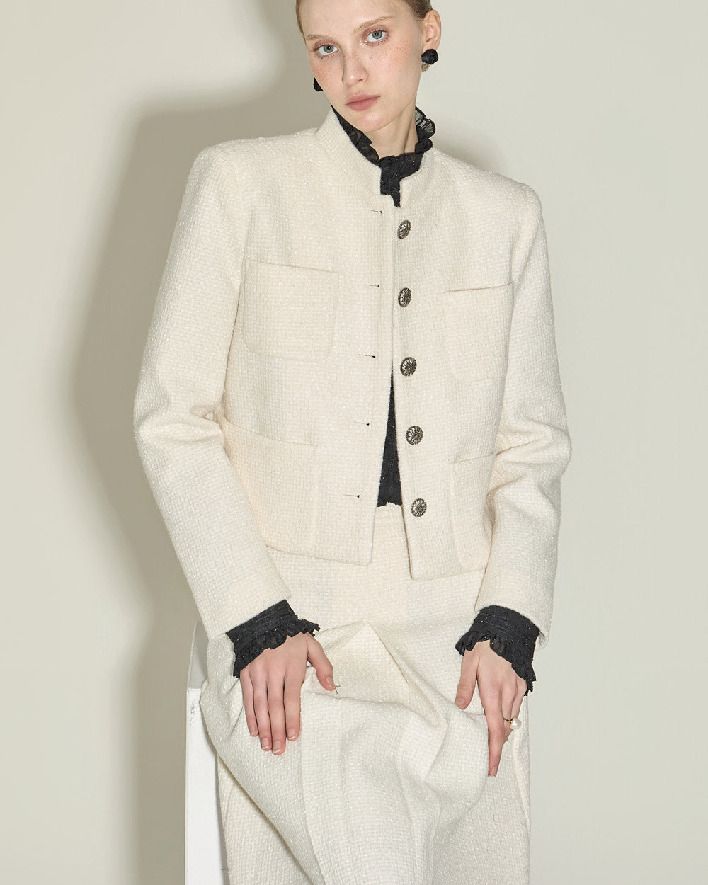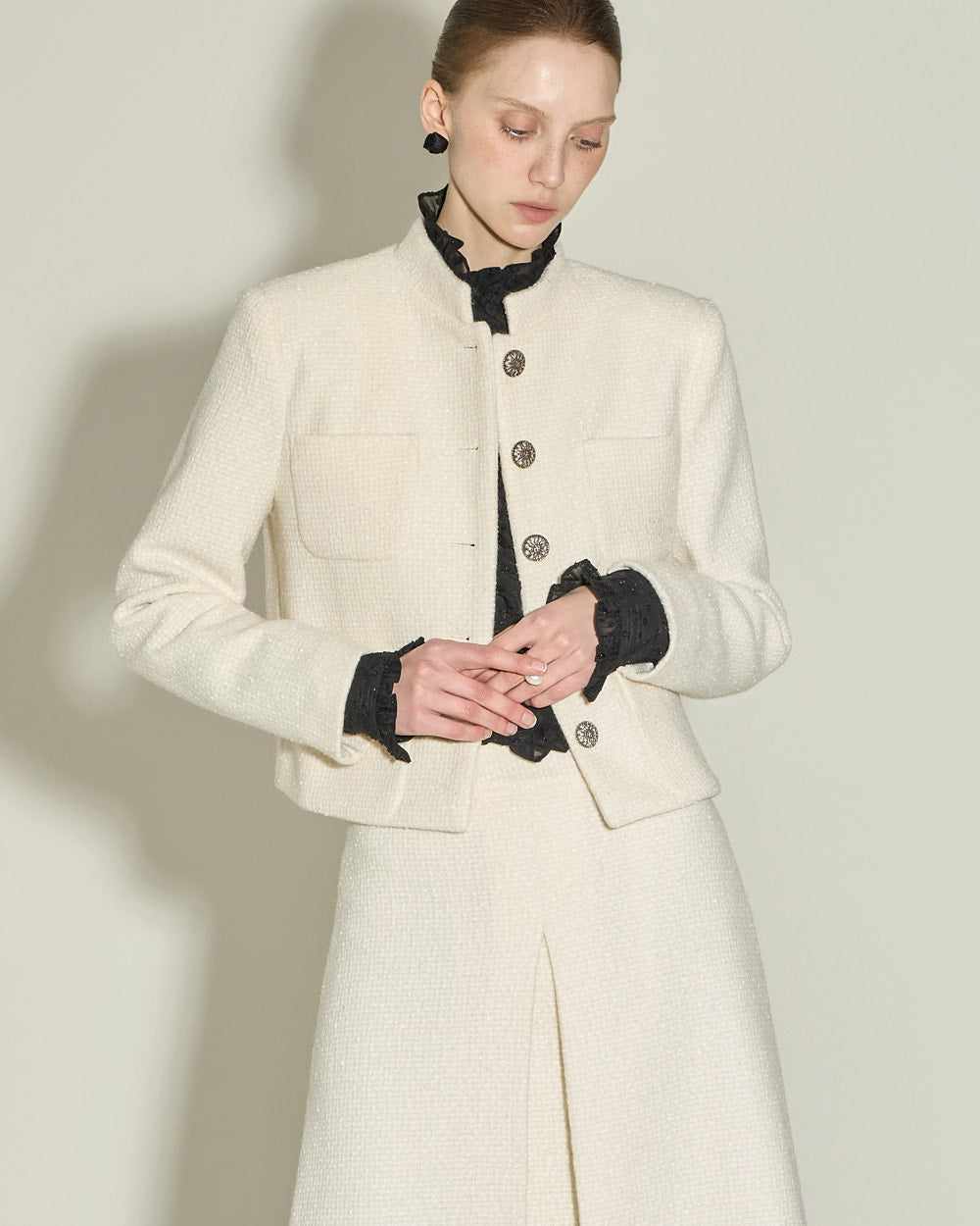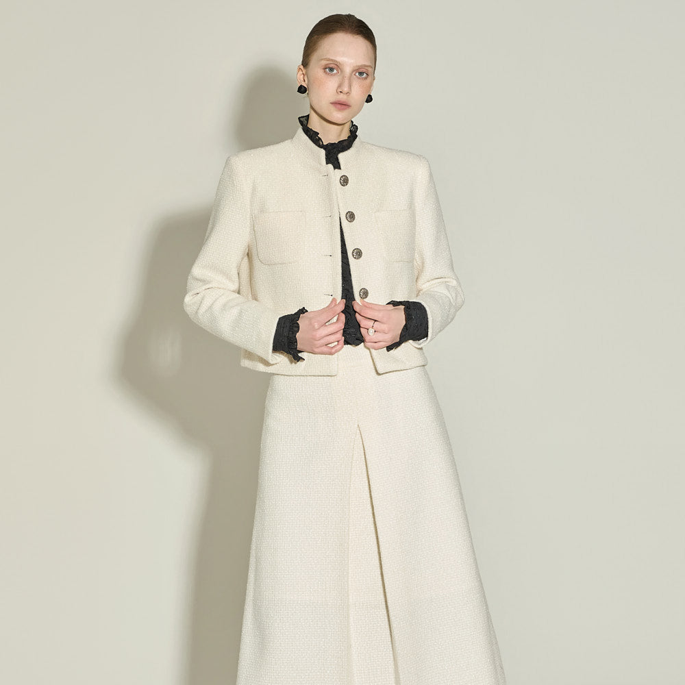 The jacket has a short, fitted length and a Chinese collar,
