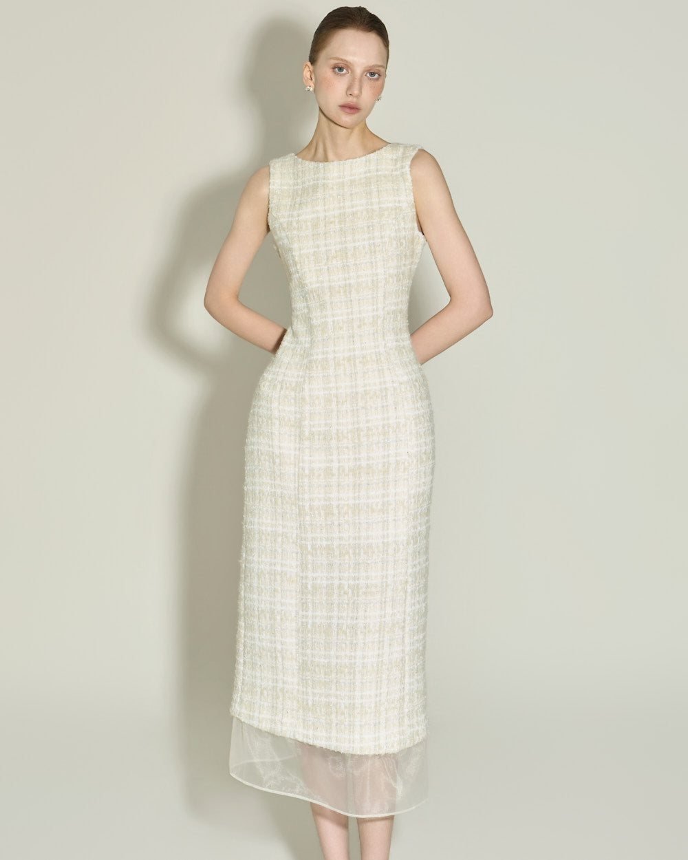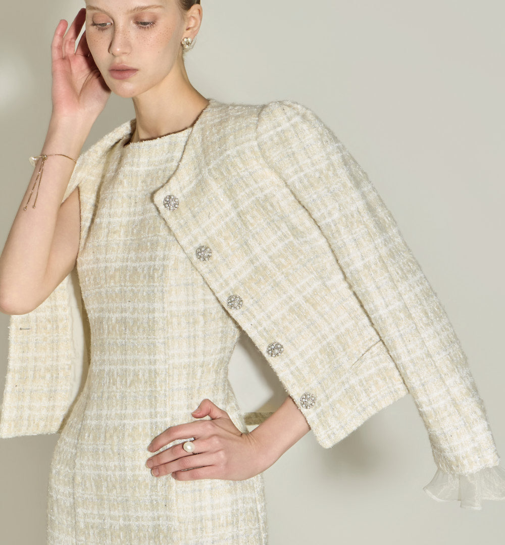 The jacket is fully lined, while the dress is partially lined for a clean, streamlined look.