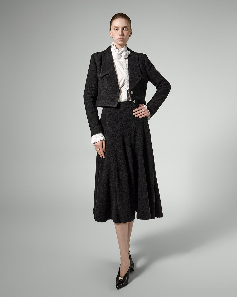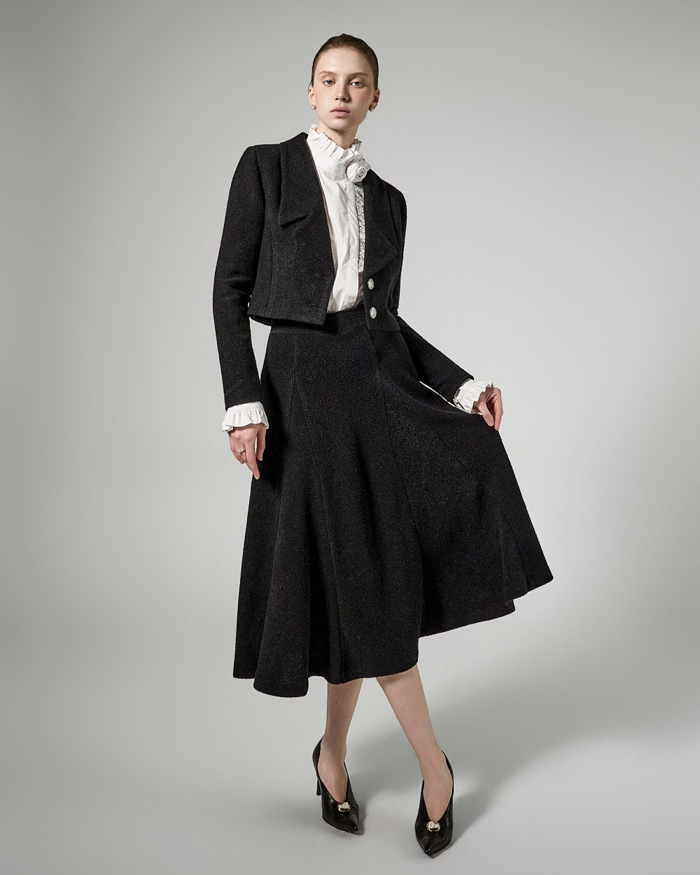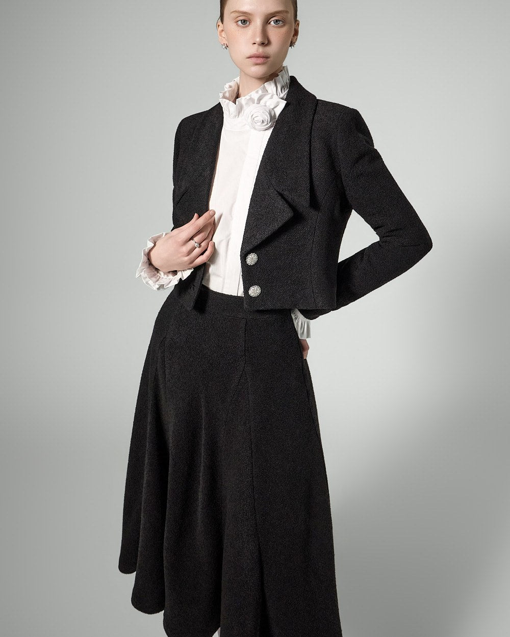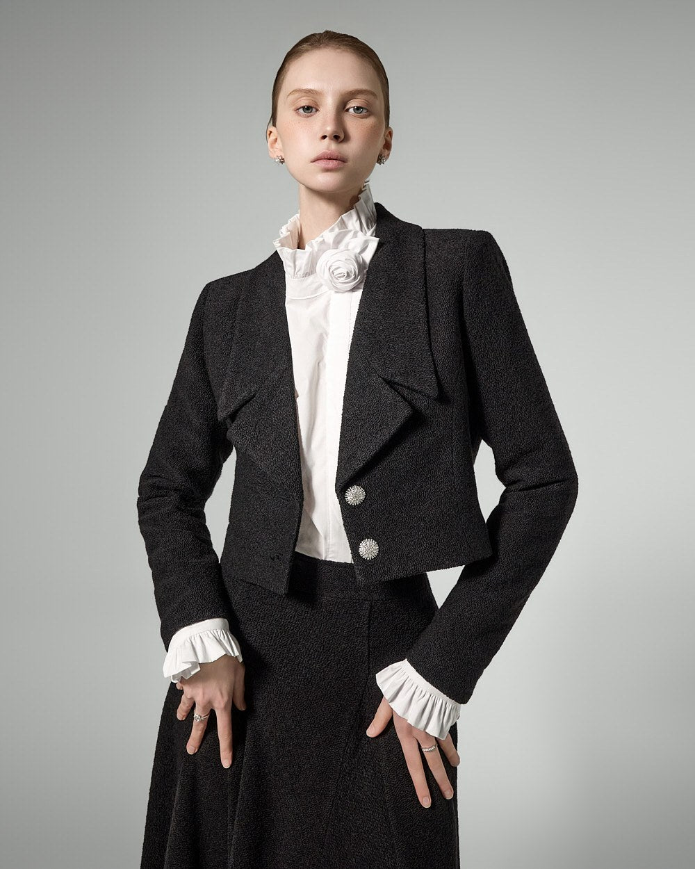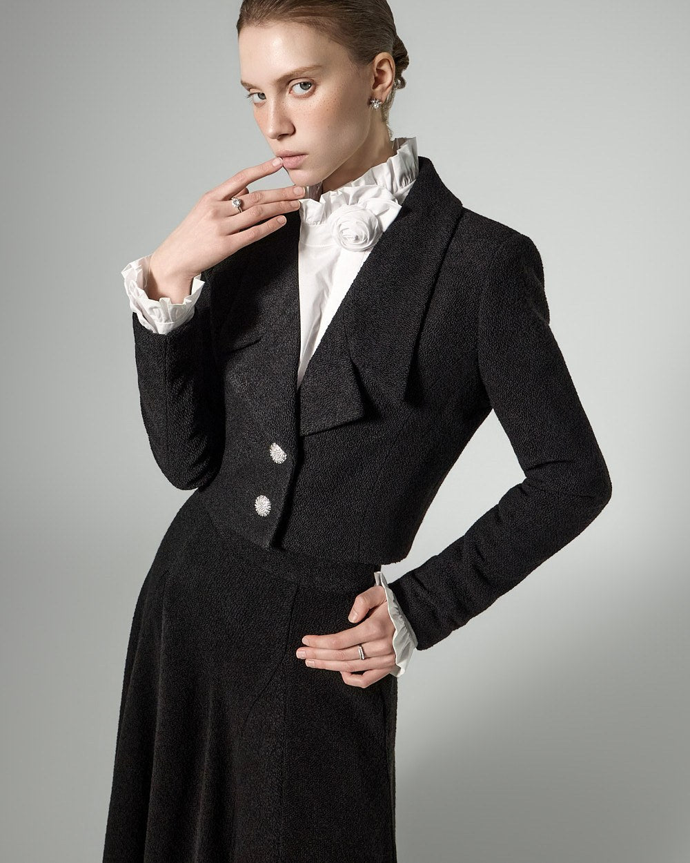 The jacket features a cropped length, long lapels, and