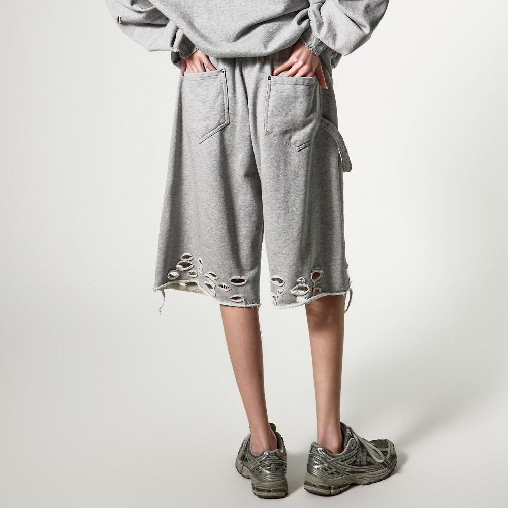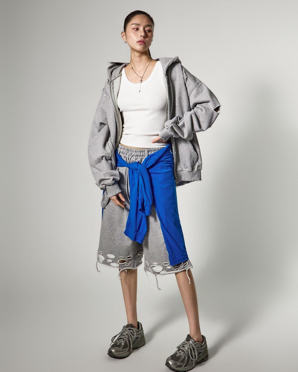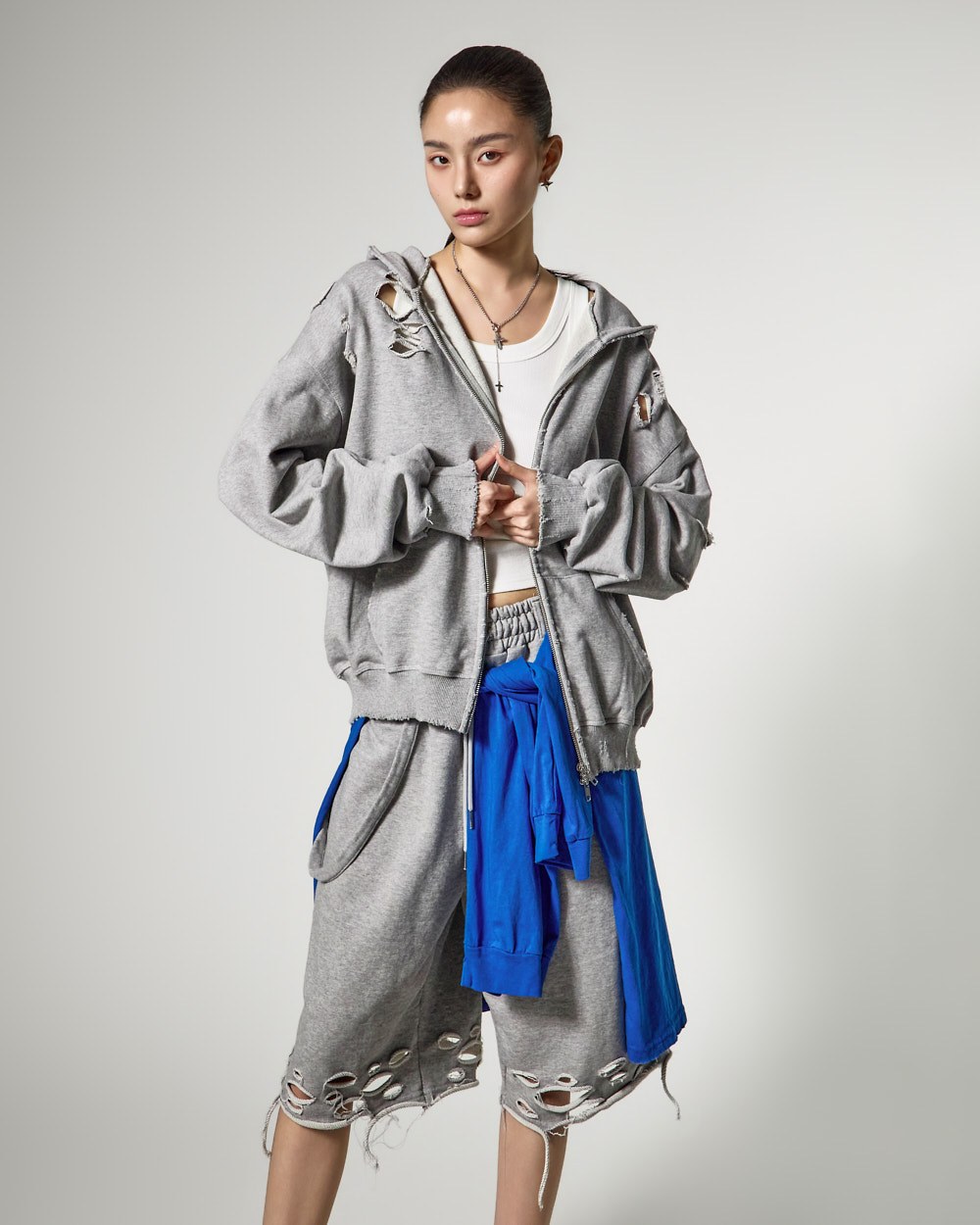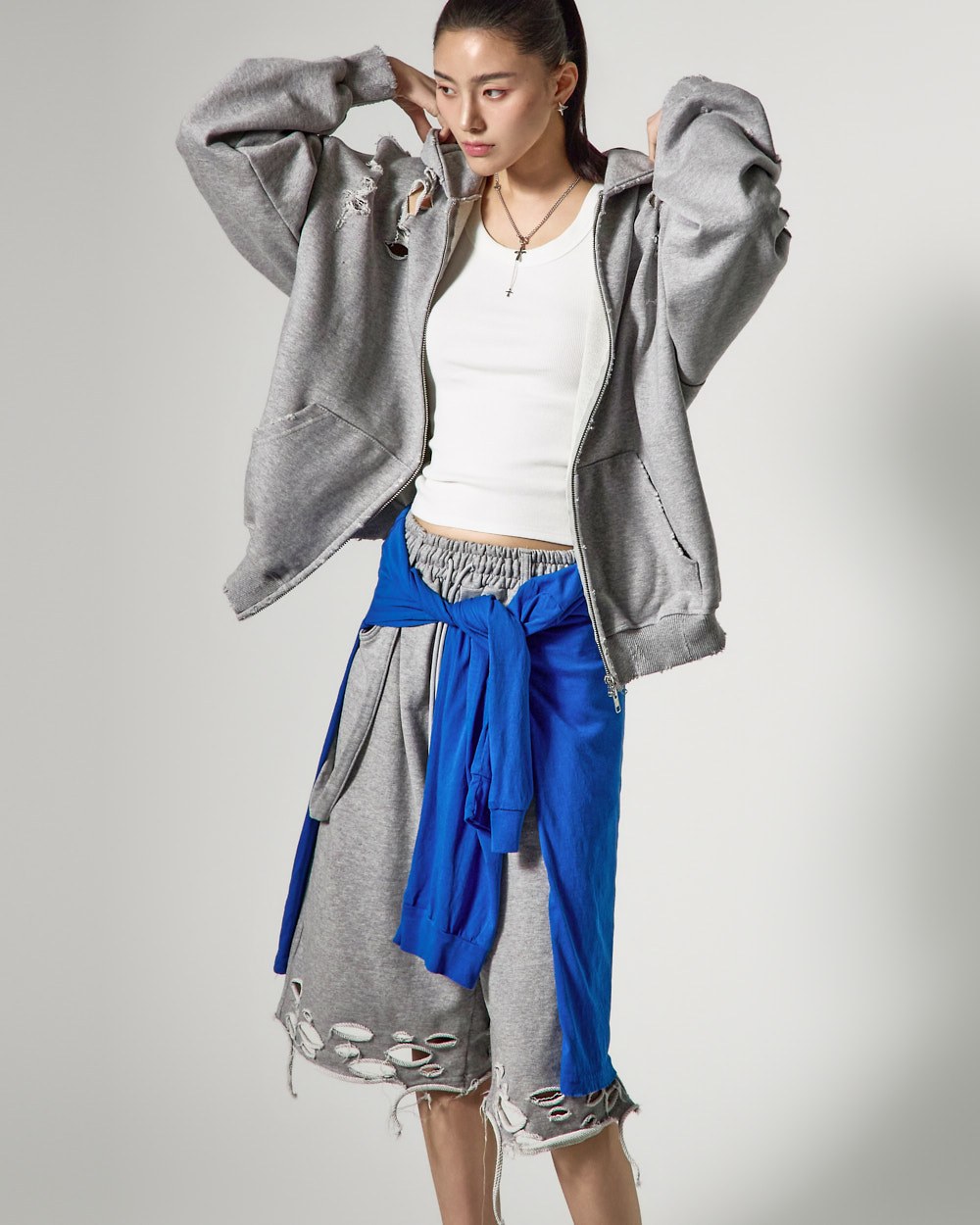 ナチュラルなカッティングとダメージディテールがユニークな魅力を強調し、サイドとバックポケットが実用性を高めます。このアイテムは、単独でスタイリッシュなルックを演出できるだけでなく、