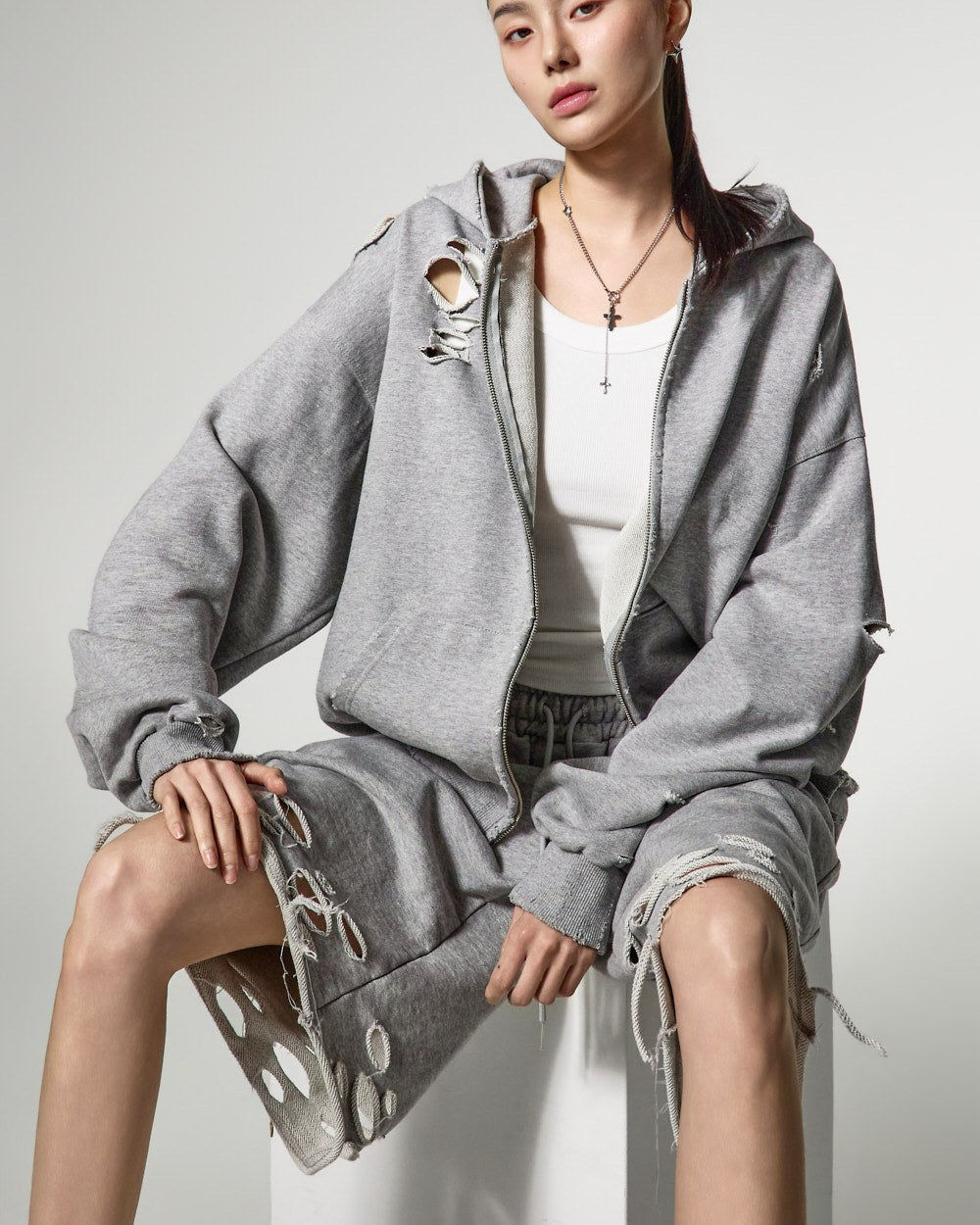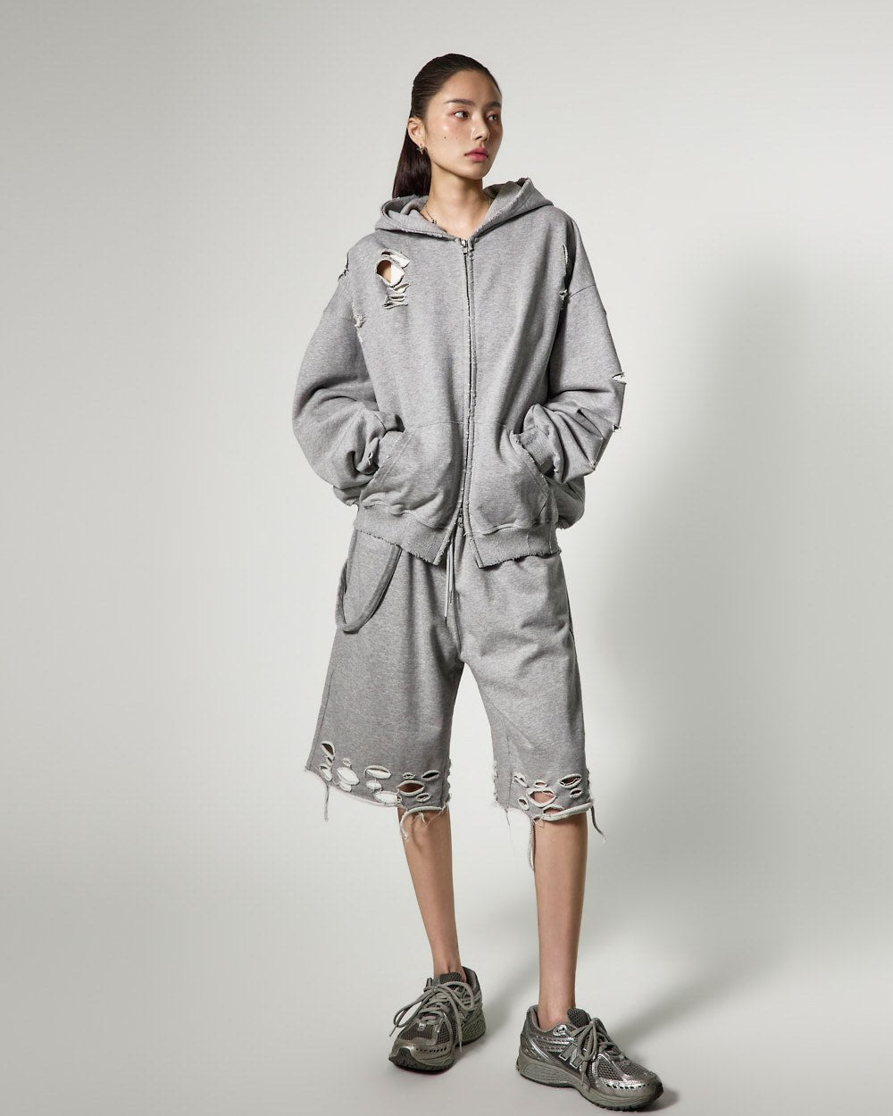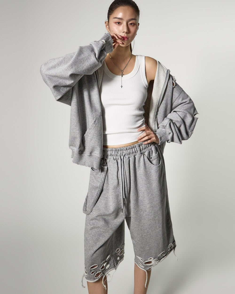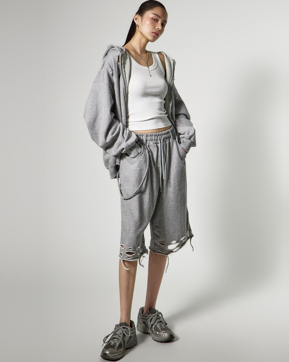 ナチュラルなカッティングとダメージディテールがユニークな魅力を強調し、サイドとバックポケットが実用性を高めます。このアイテムは、単独でスタイリッシュなルックを演出できるだけでなく、