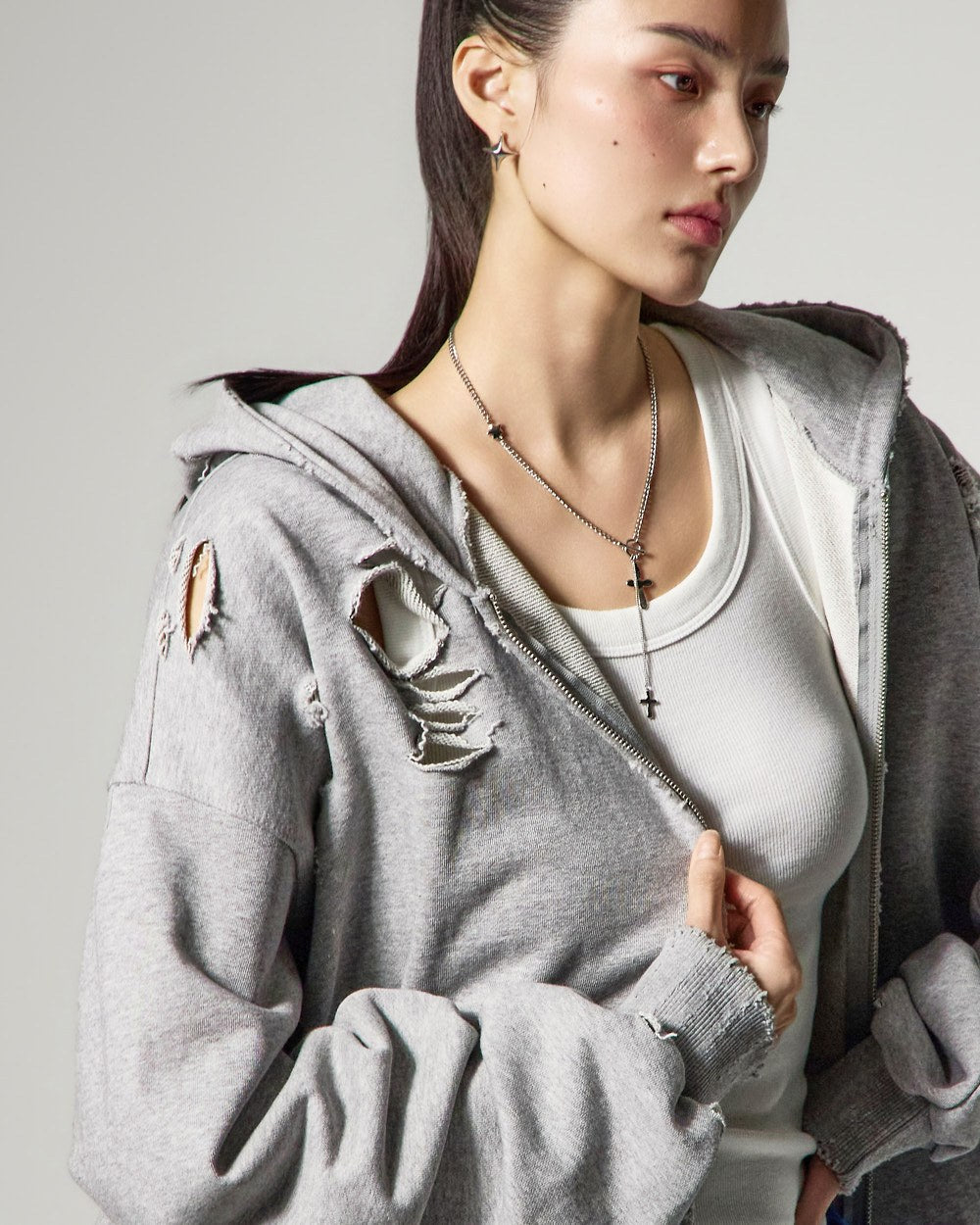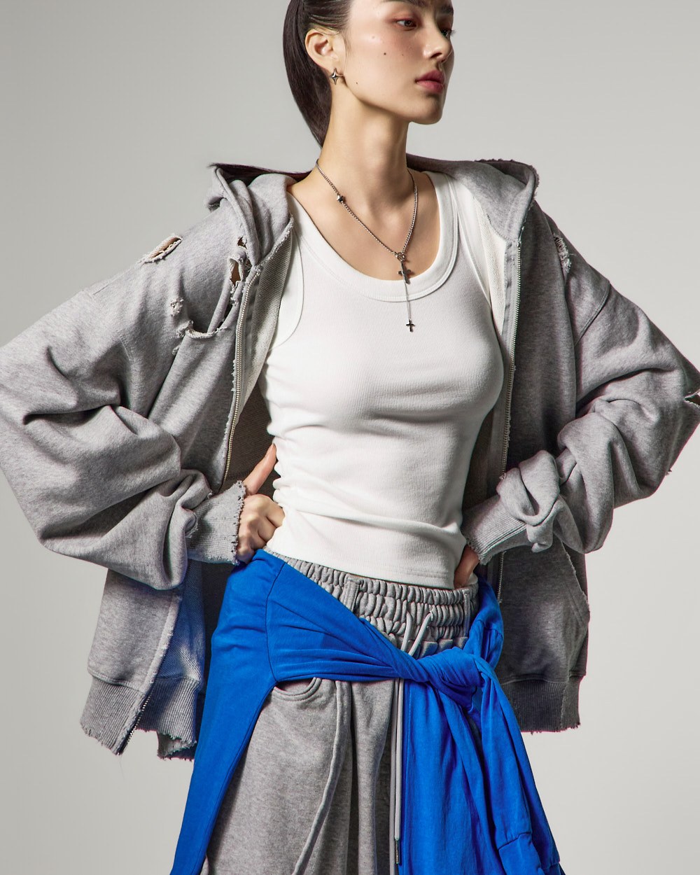 ゆったりとしたフィット感で、イージーなスタイリングを完成させ、自然に加えられたダメージディテールがおしゃれなアクセントとなり、トレンディなムードを演出します。