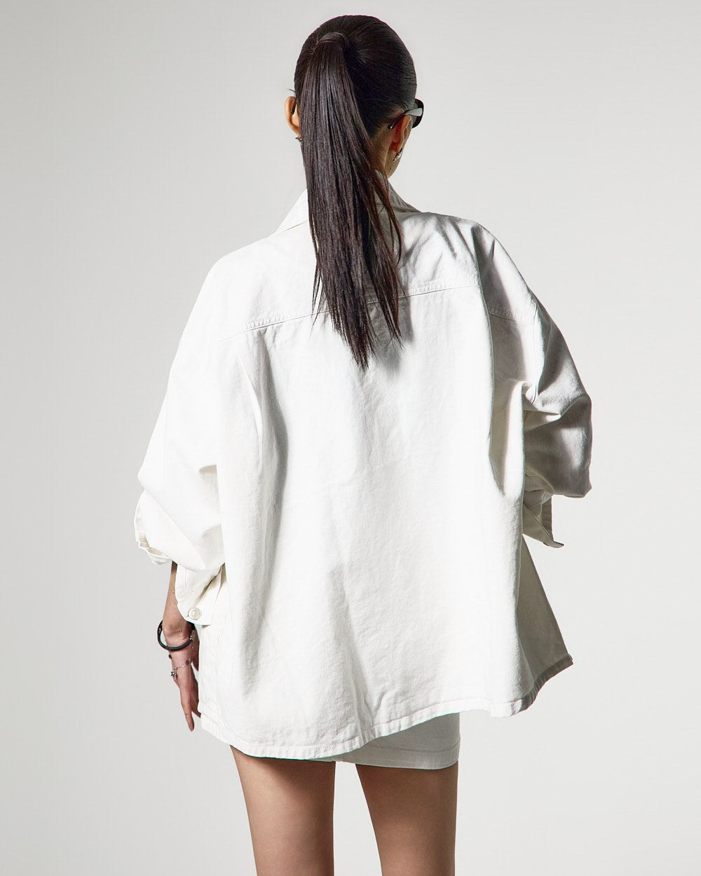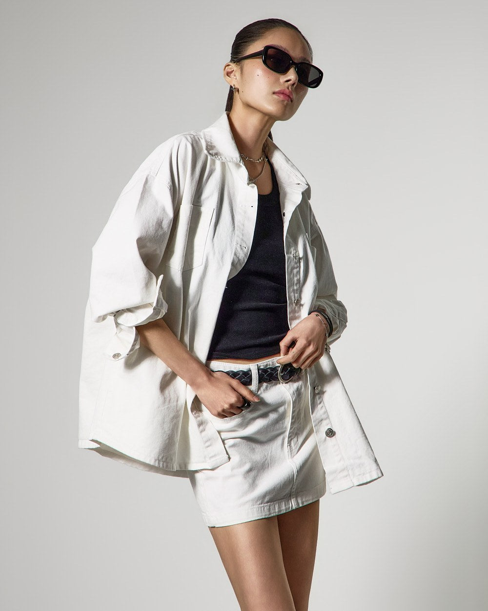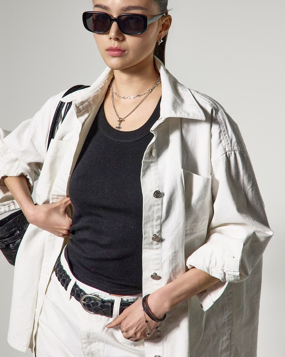 ジャケットは、オーバーサイズのシルエットと構築的なラインで洗練された印象を与え、