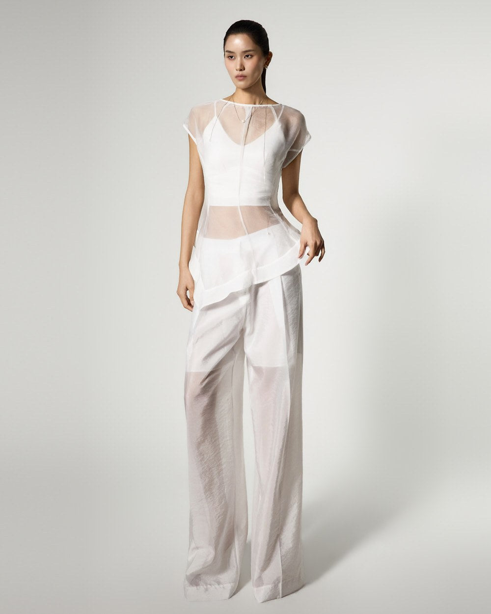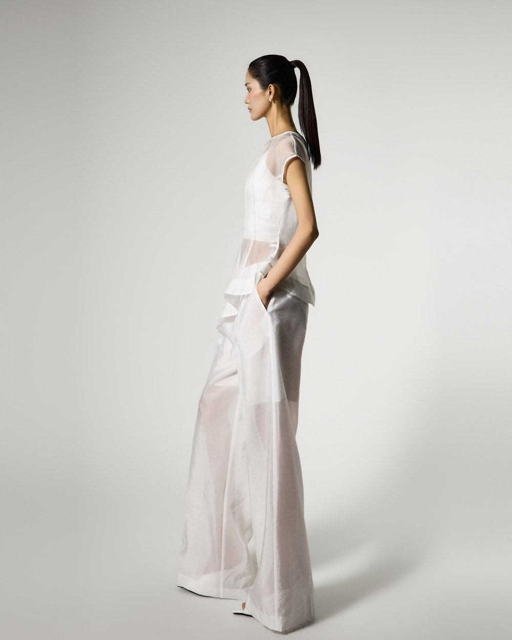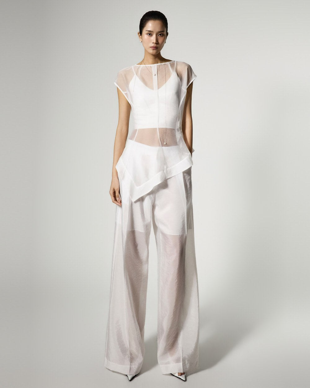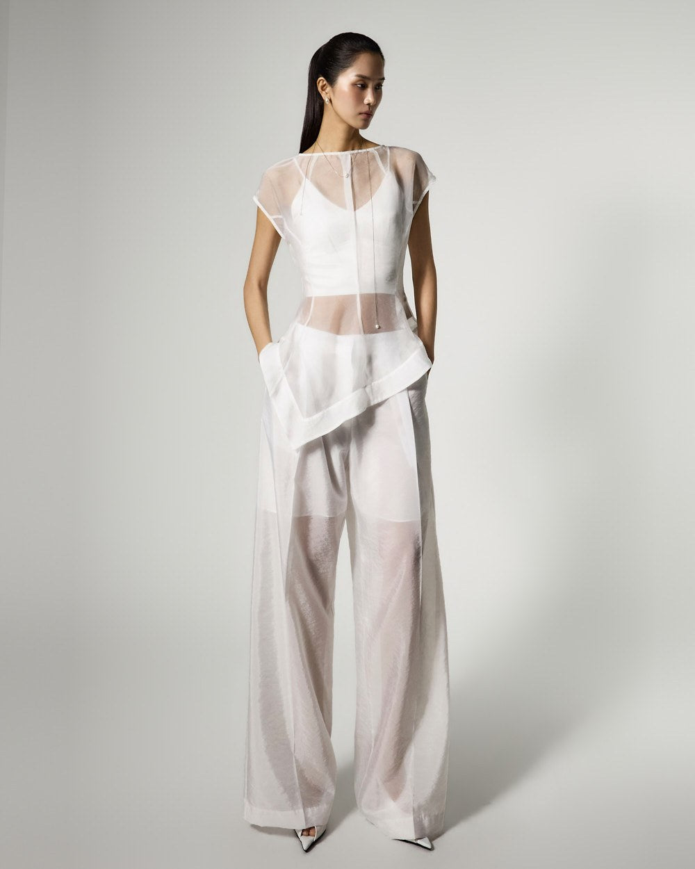 こちらは、モダンなスタイルのオーガンジーブラウスとスラックスのセットアップです。