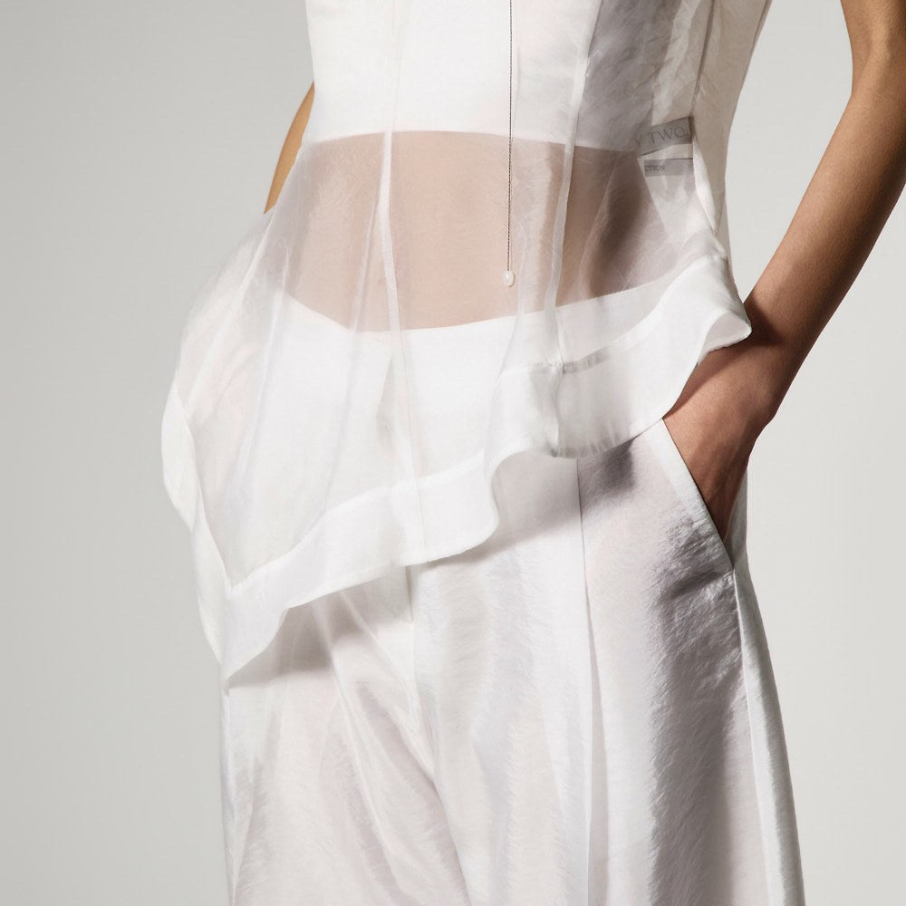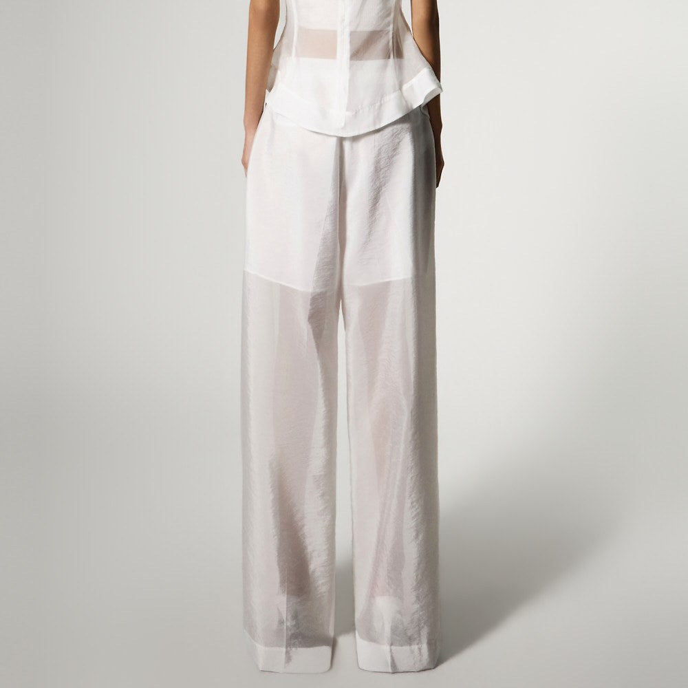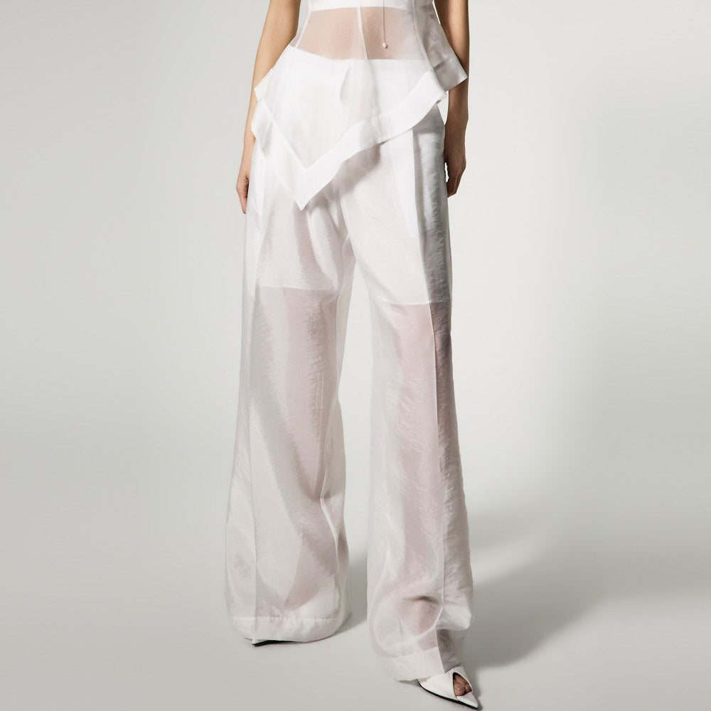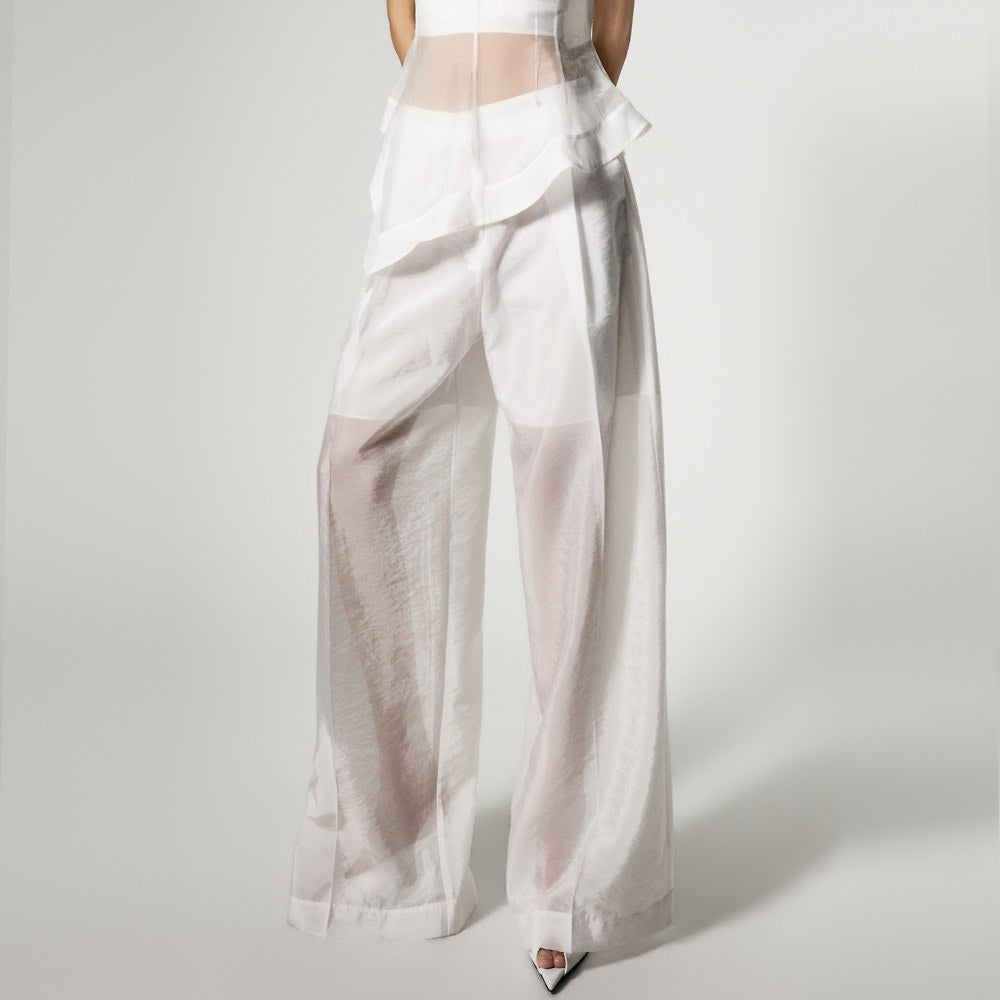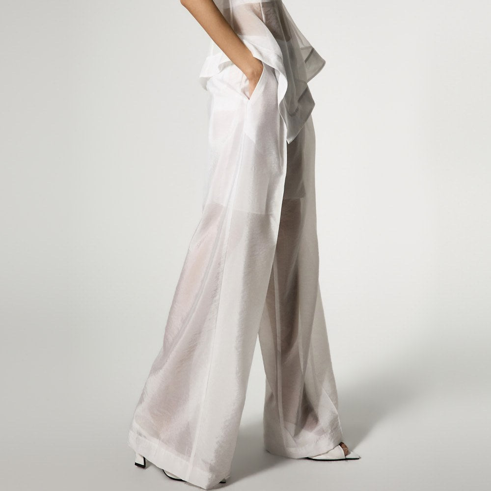 こちらは、モダンなスタイルのオーガンジーブラウスとスラックスのセットアップです。
