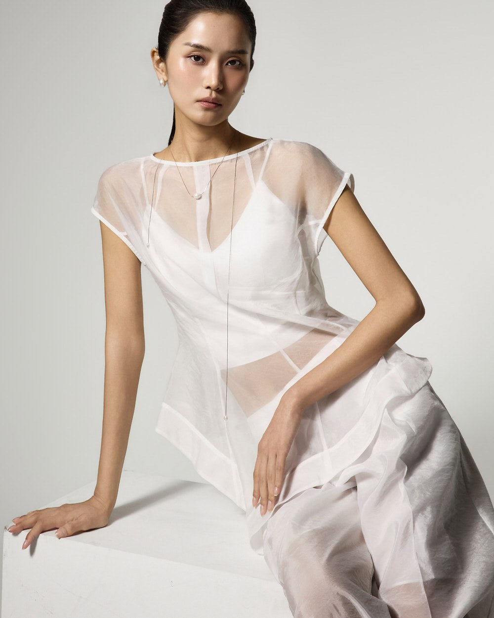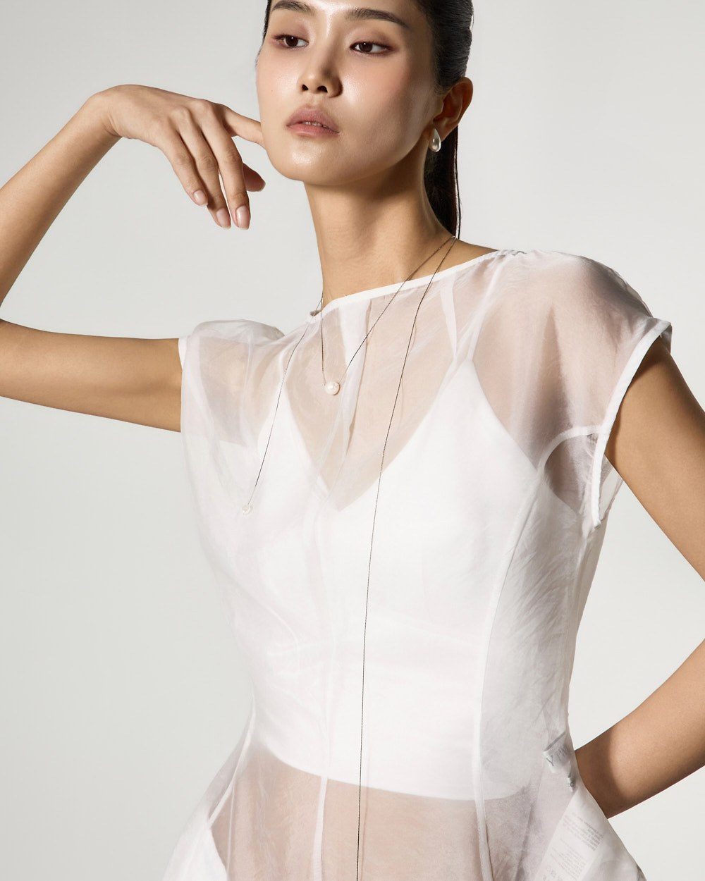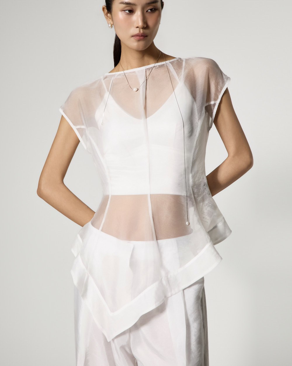 トップスは、ボディラインをすっきりと強調するスリムフィットのオーガンジーブラウスで、