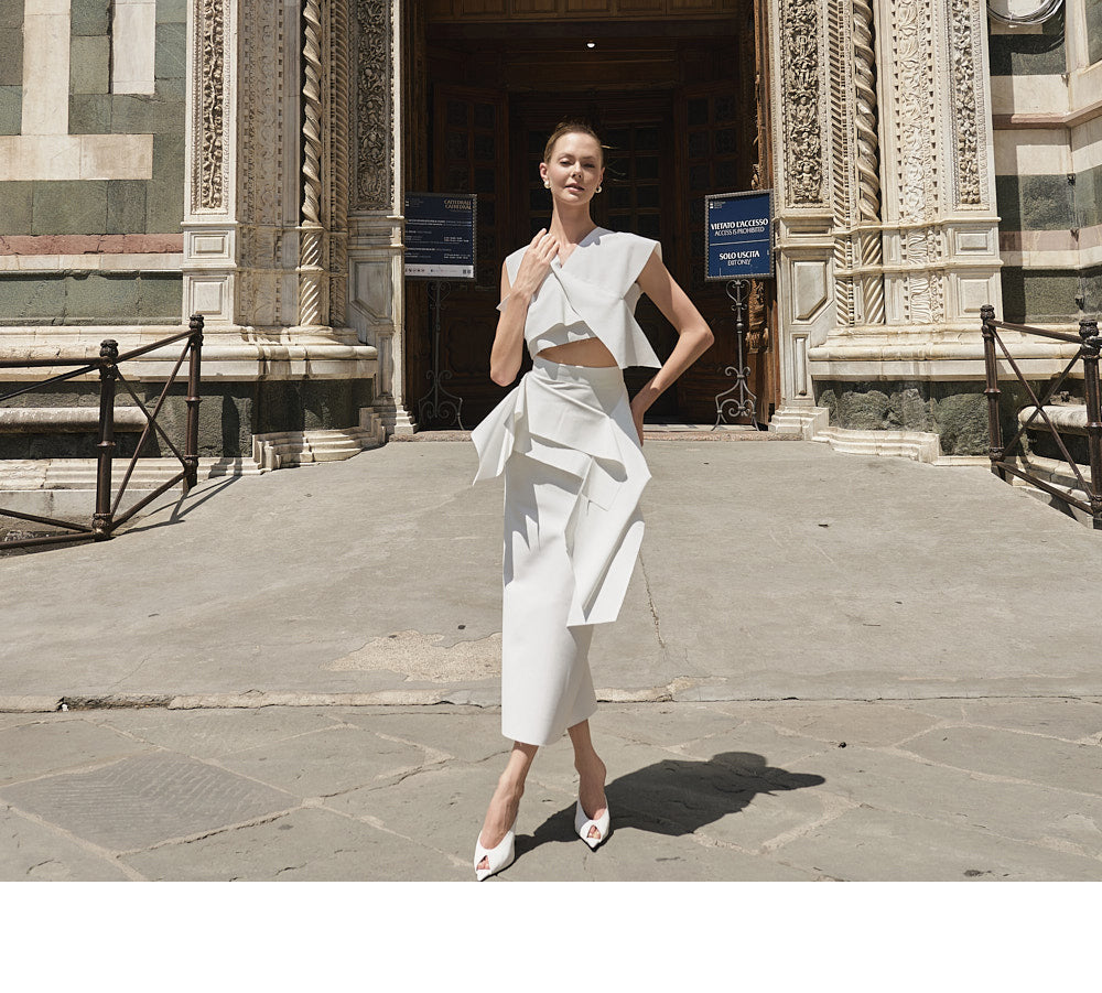 ブラウスはクロップド丈とアシンメトリーなショルダーディテールが特徴で、