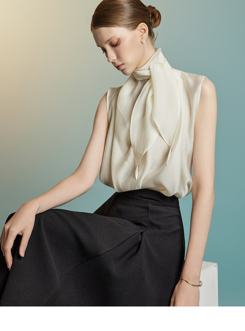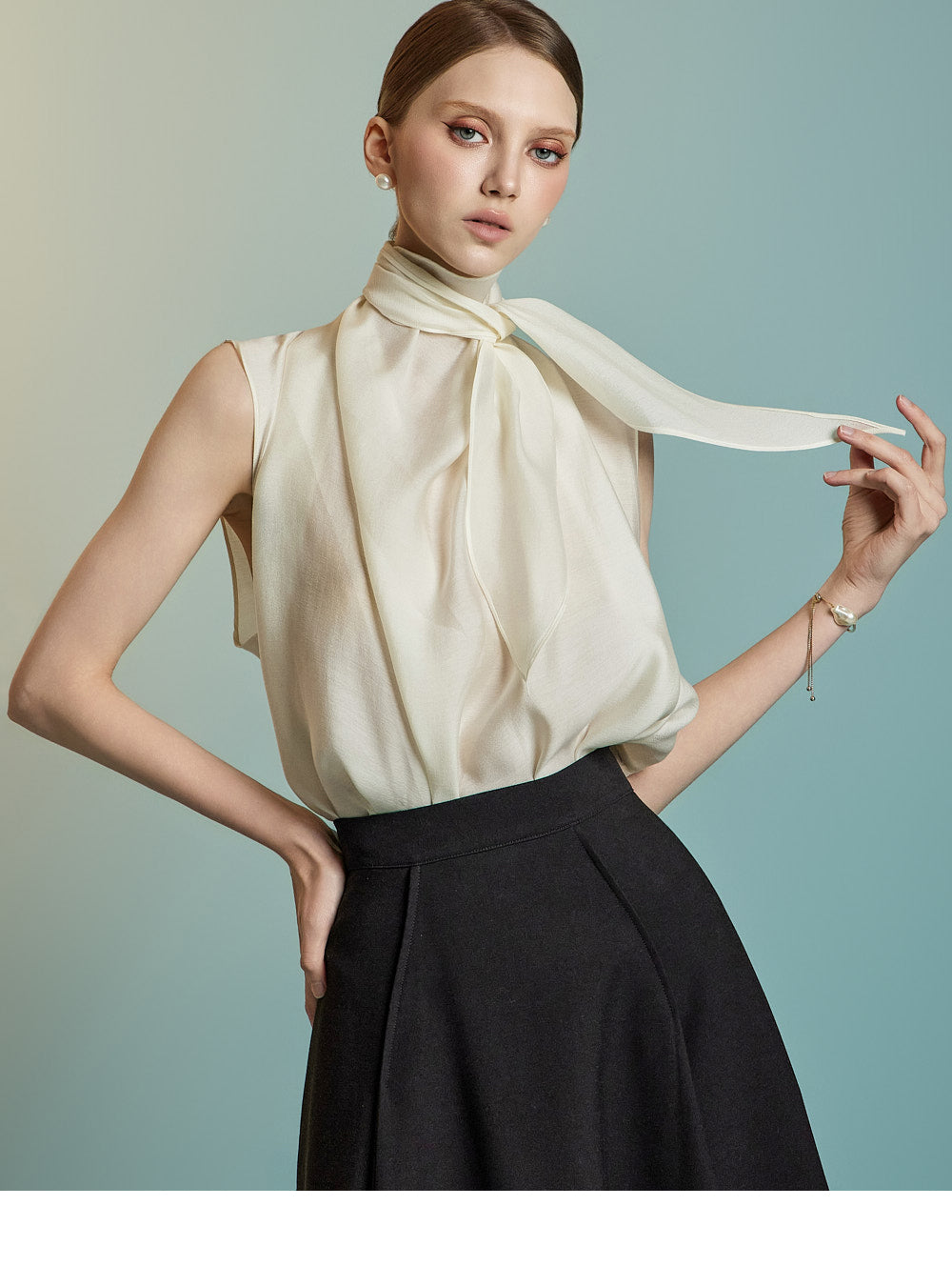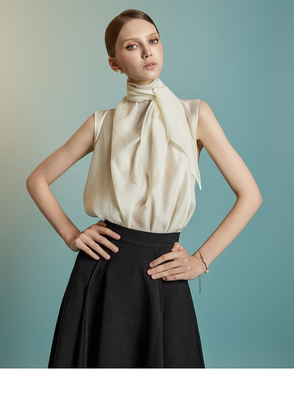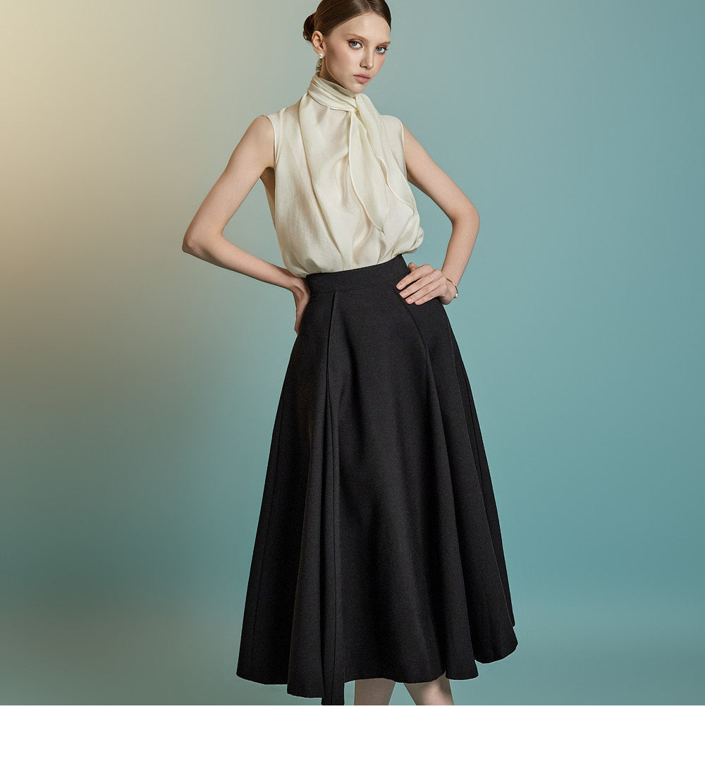 This sleeveless blouse exudes feminine elegance with a modern touch.