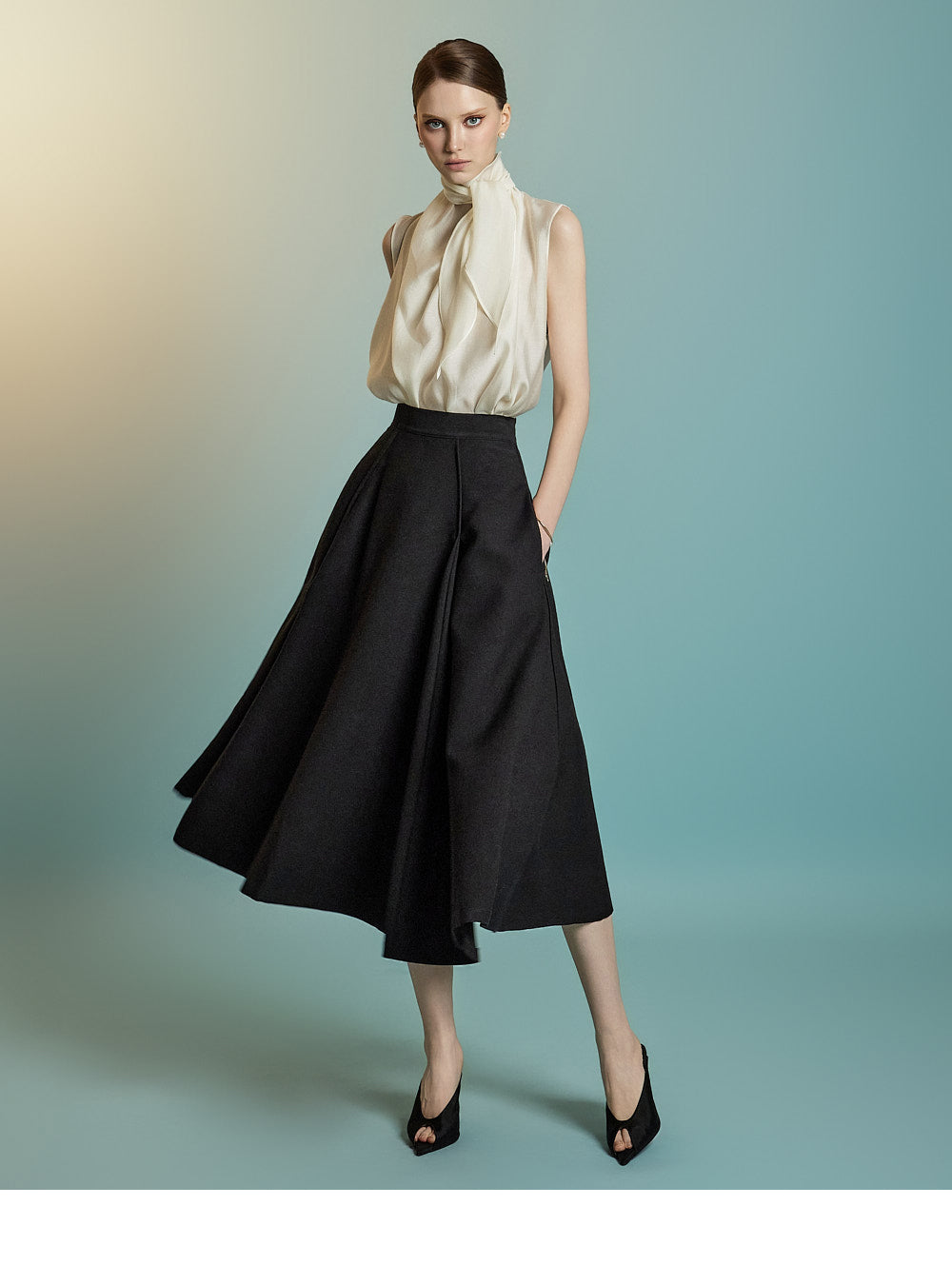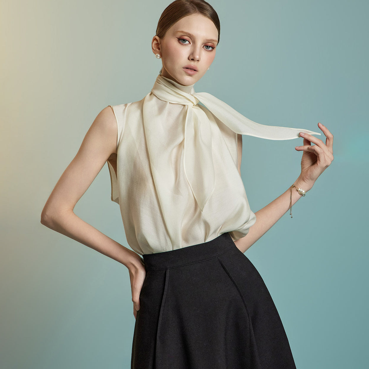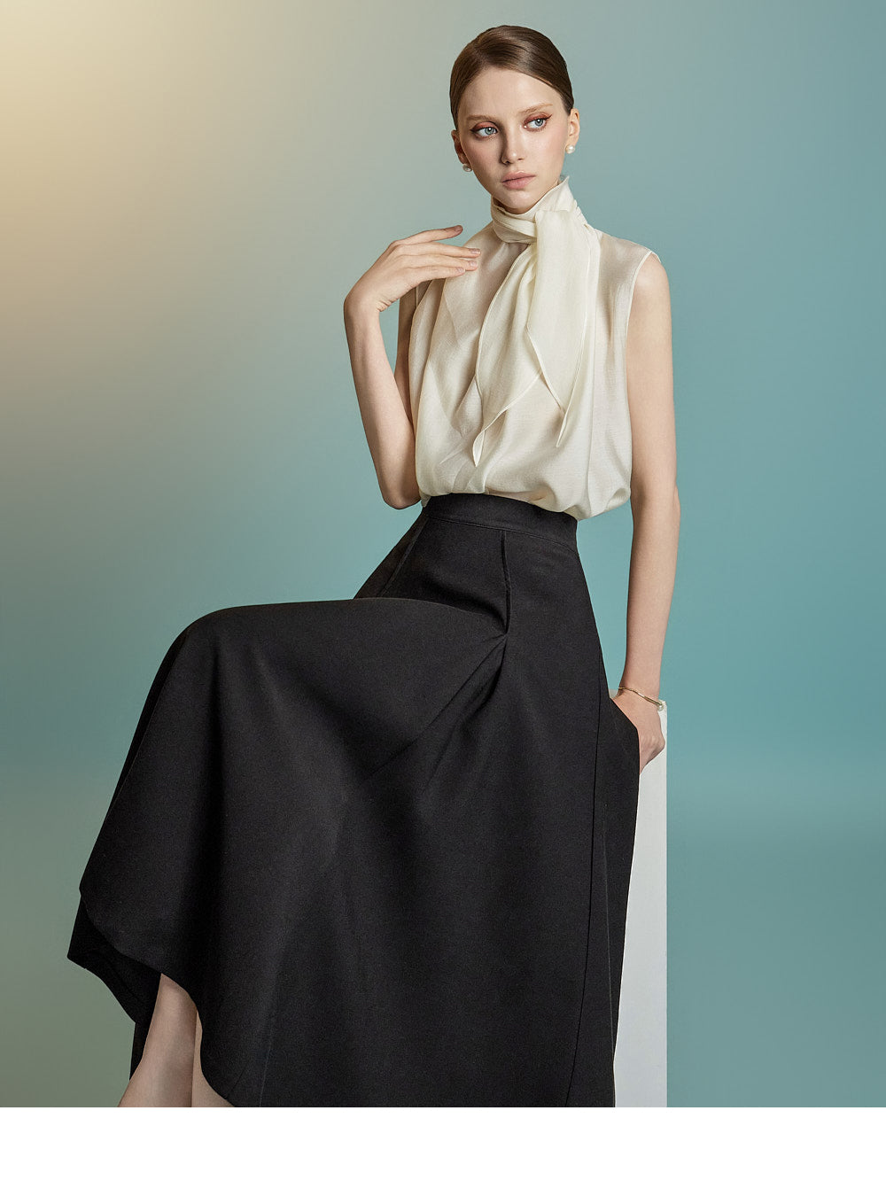 This sleeveless blouse exudes feminine elegance with a modern touch.