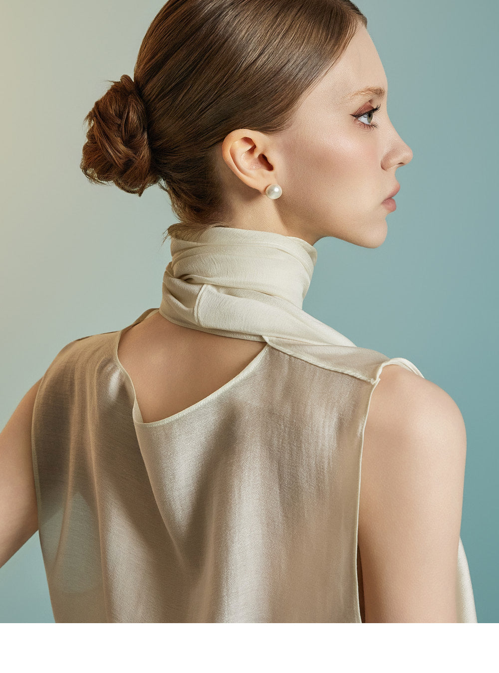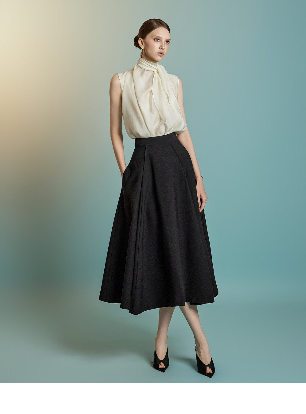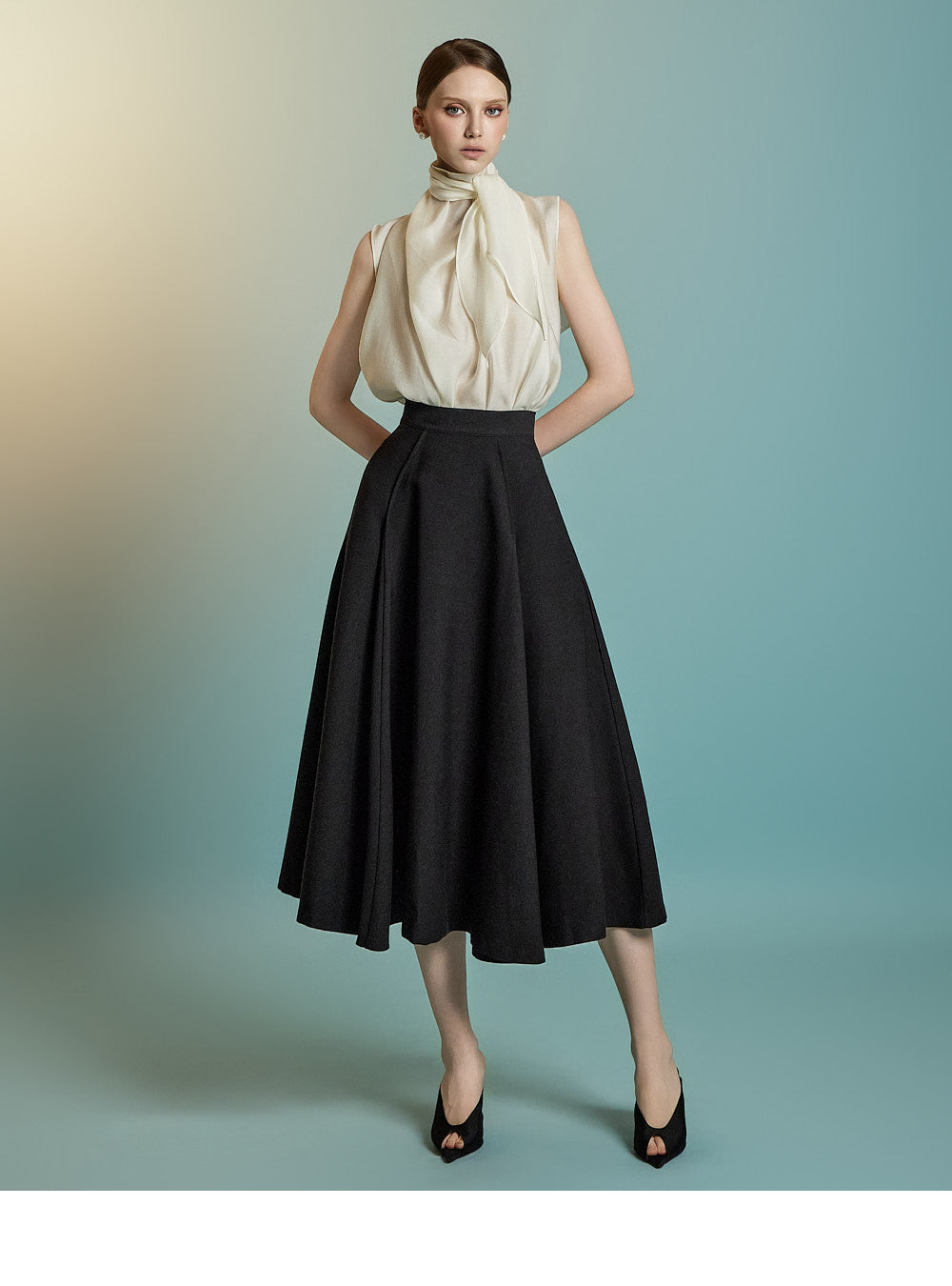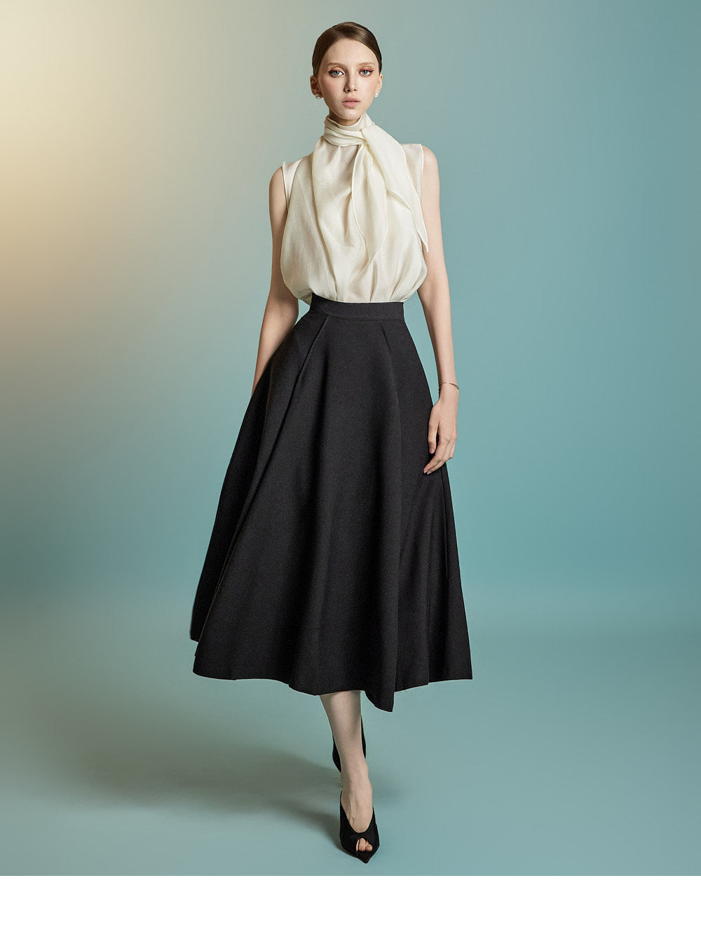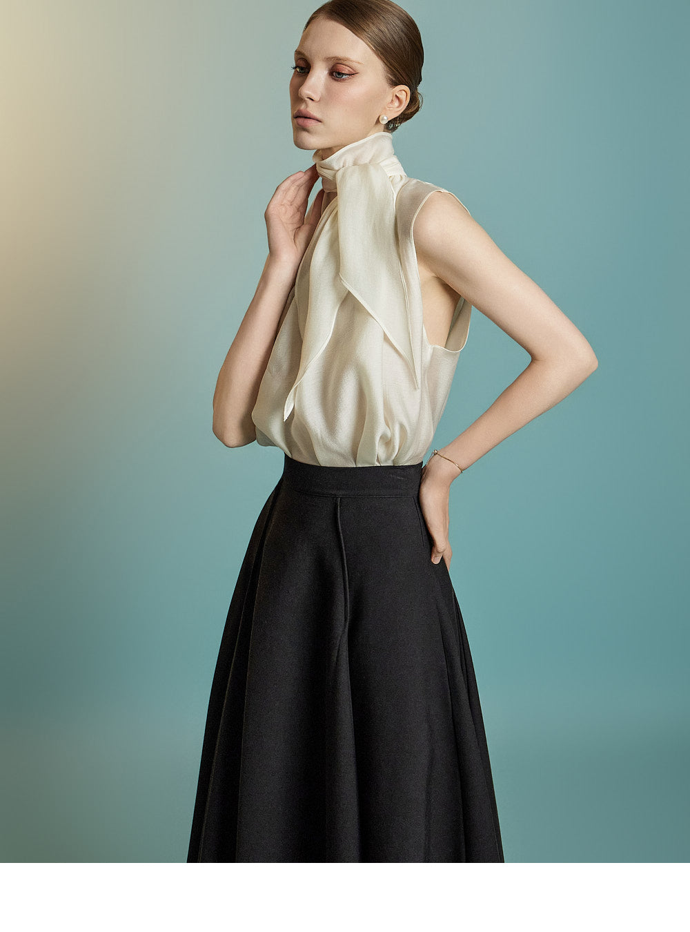 and the sleeveless cut enhances the delicate femininity of the look.