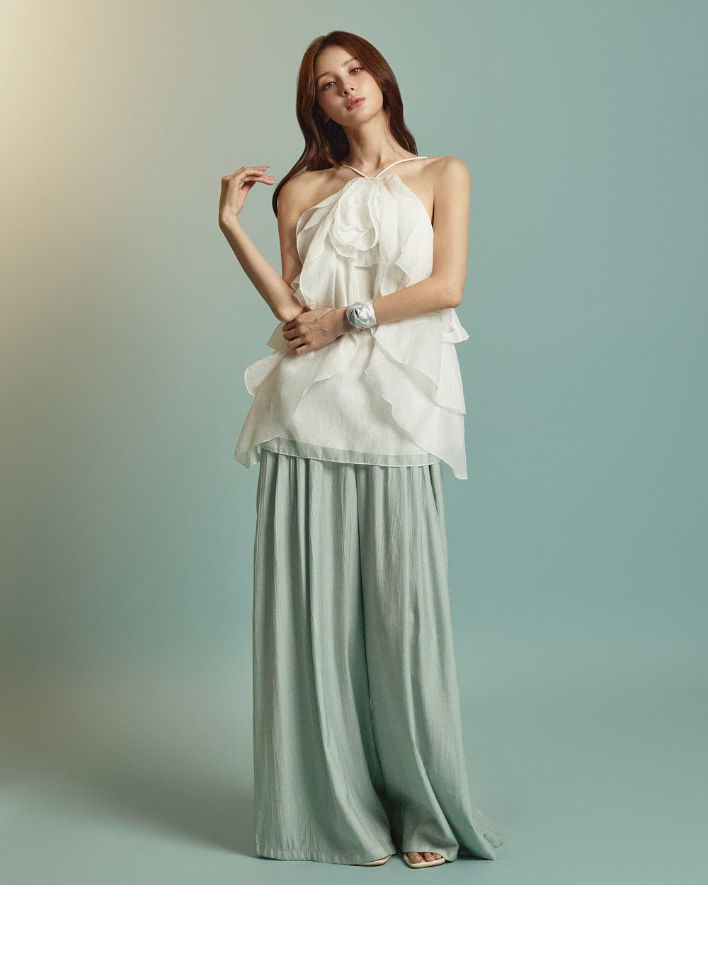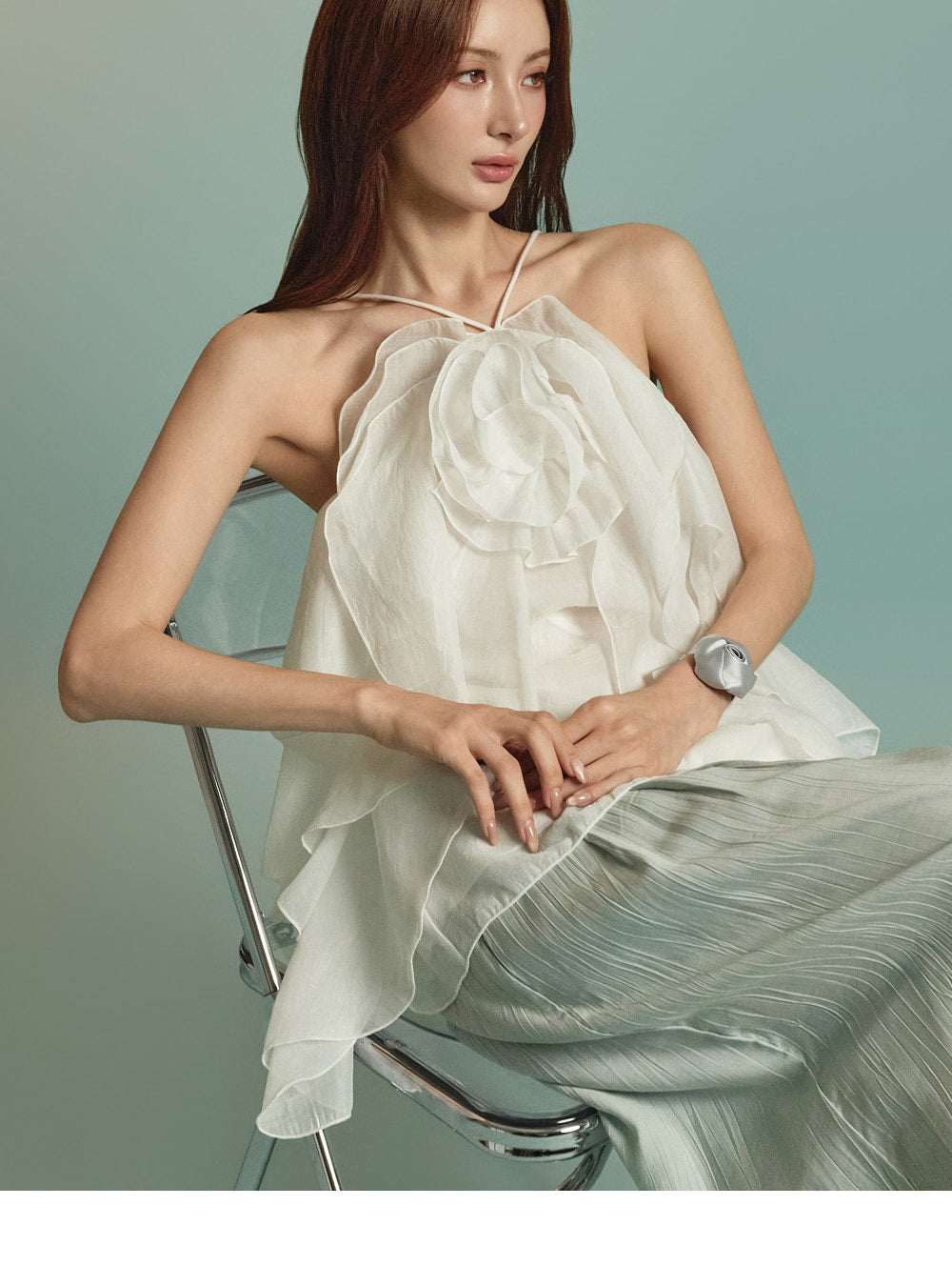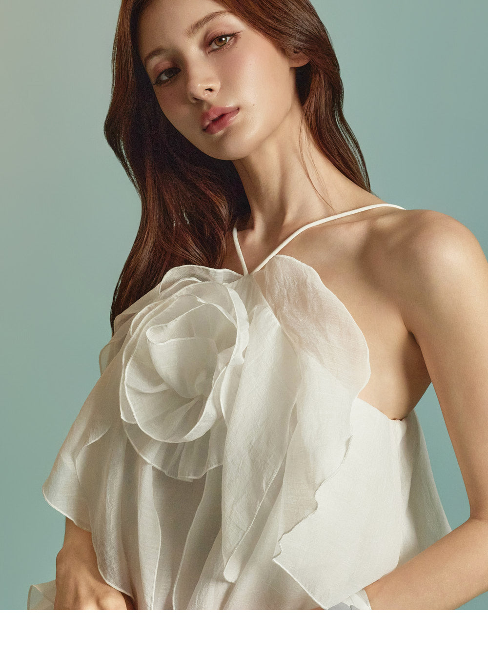 The halter neck design highlights the neckline,