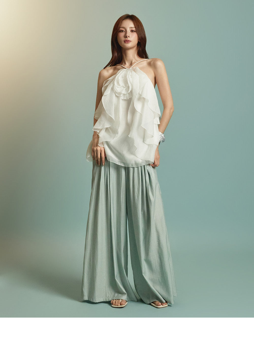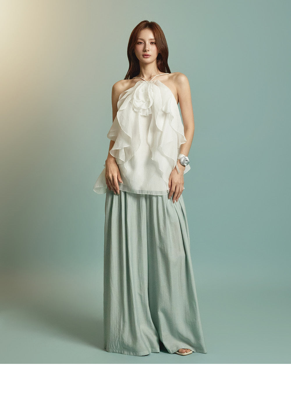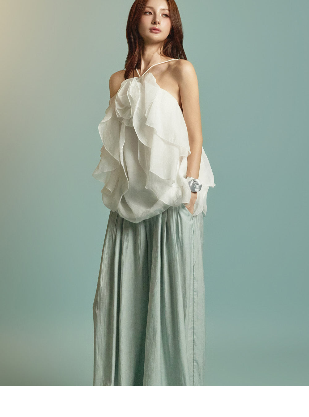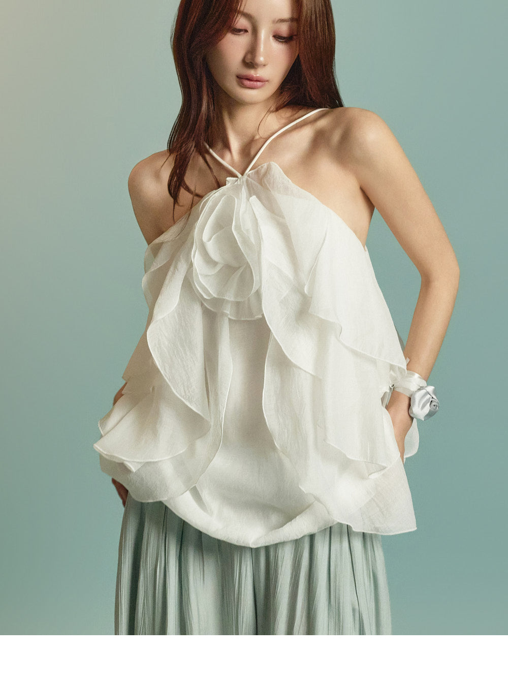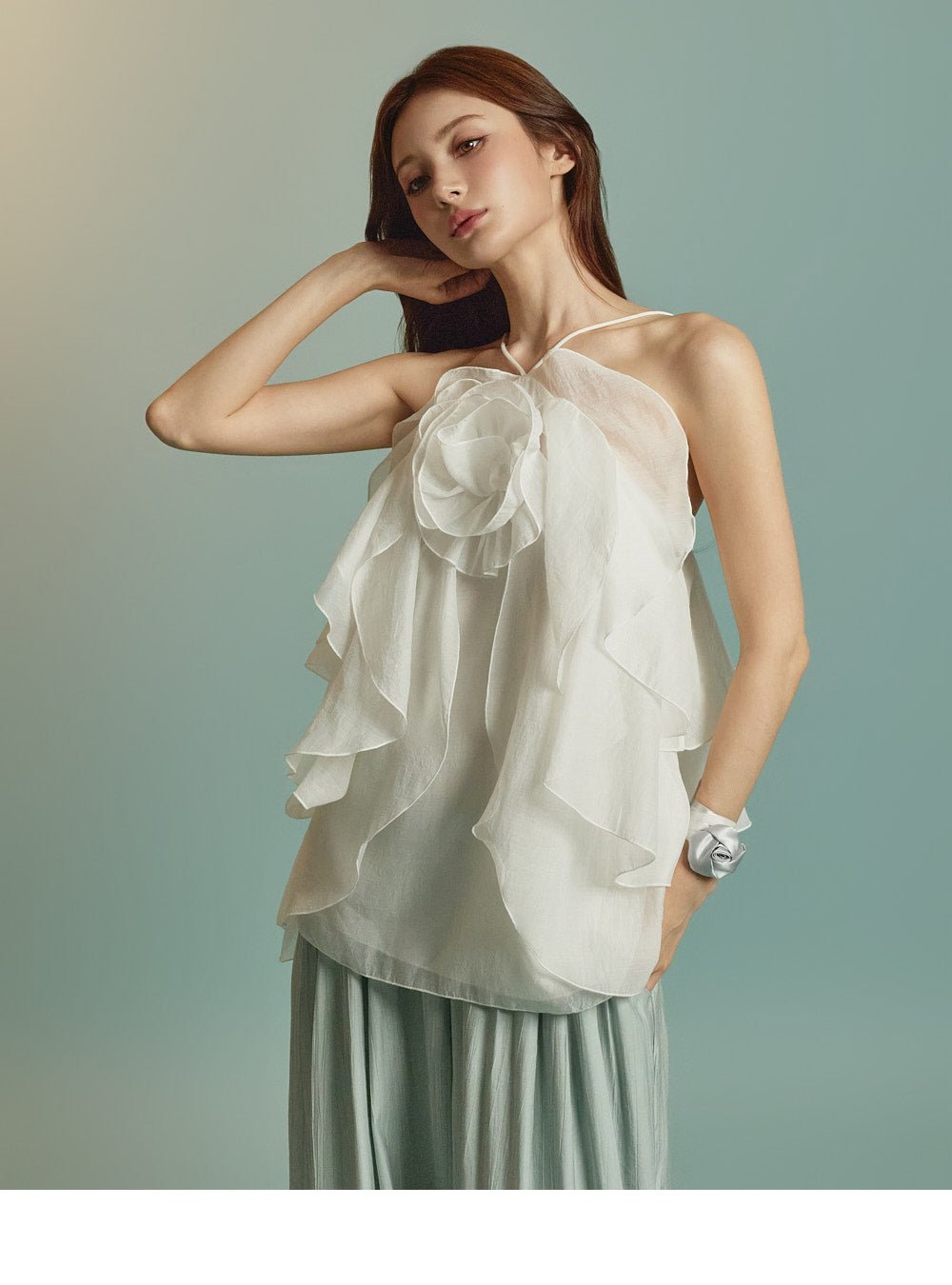 This is a ruffle halter blouse with a resort-inspired vibe.