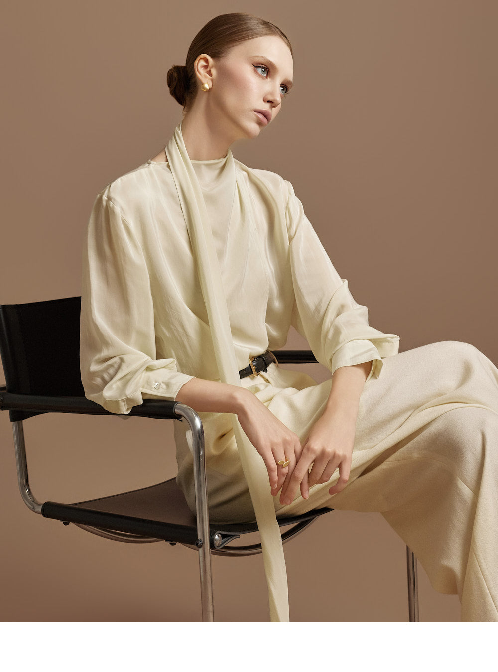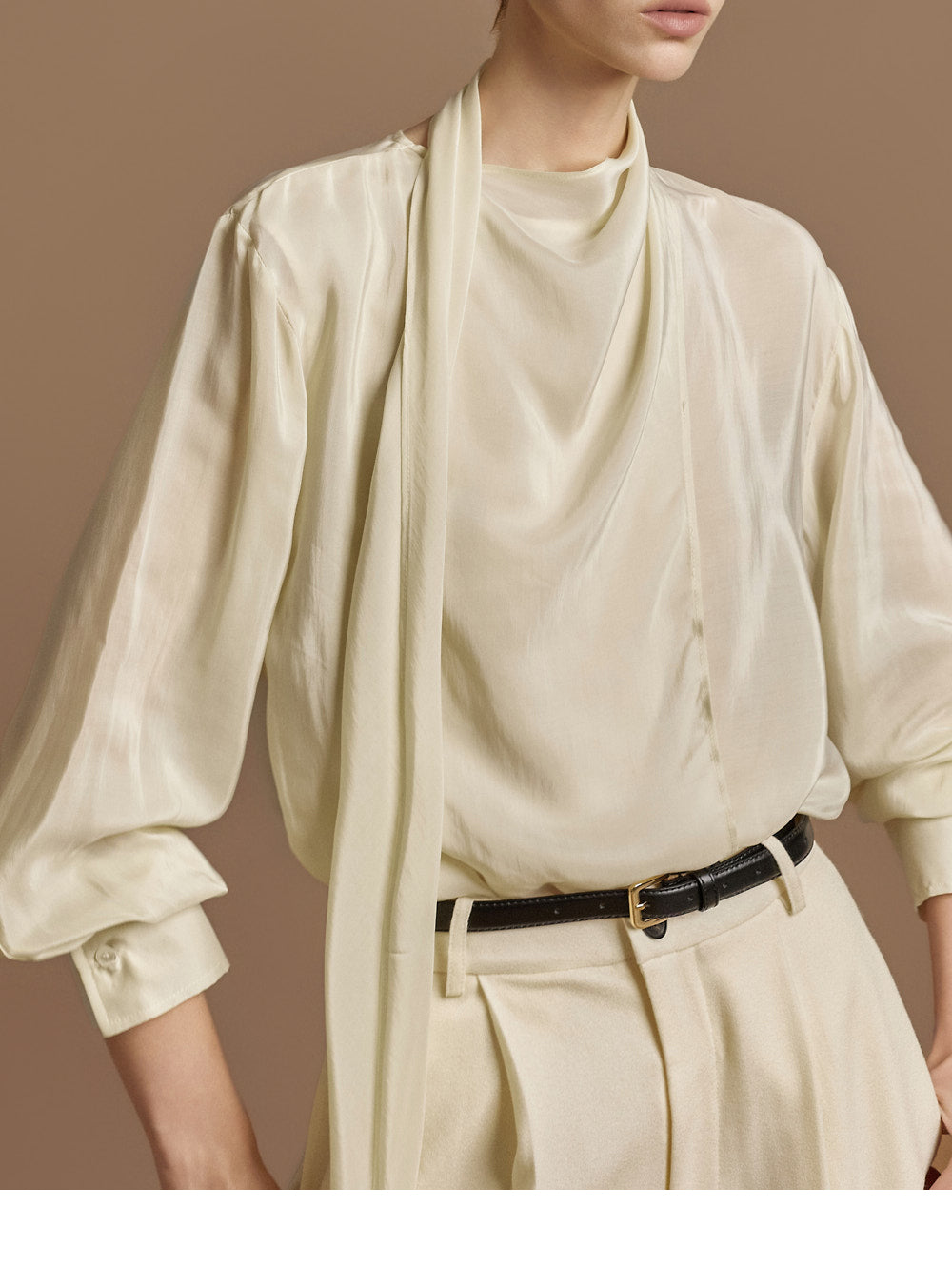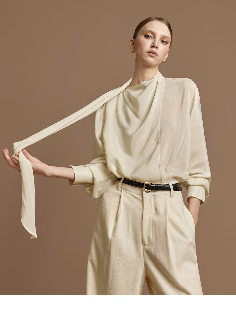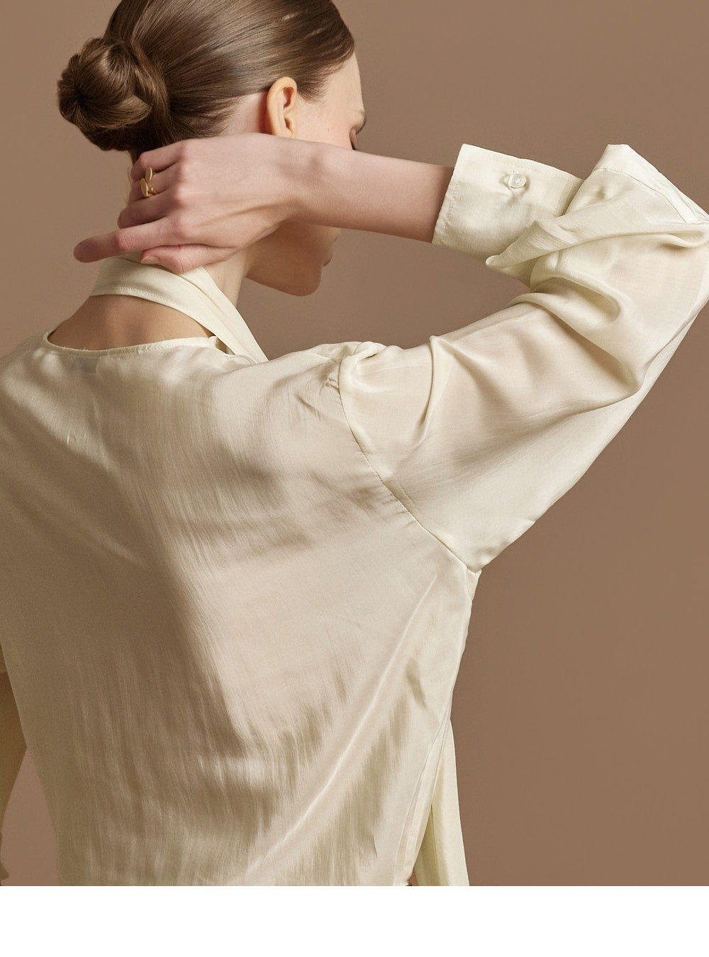 and the loose silhouette and unbalanced length add a sophisticated touch.