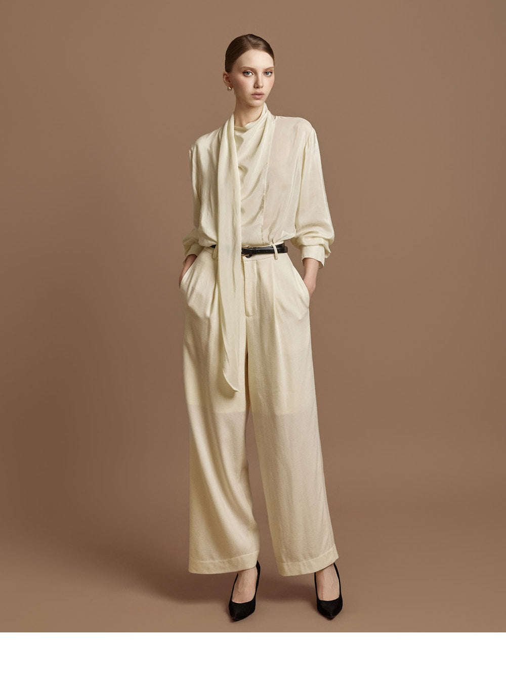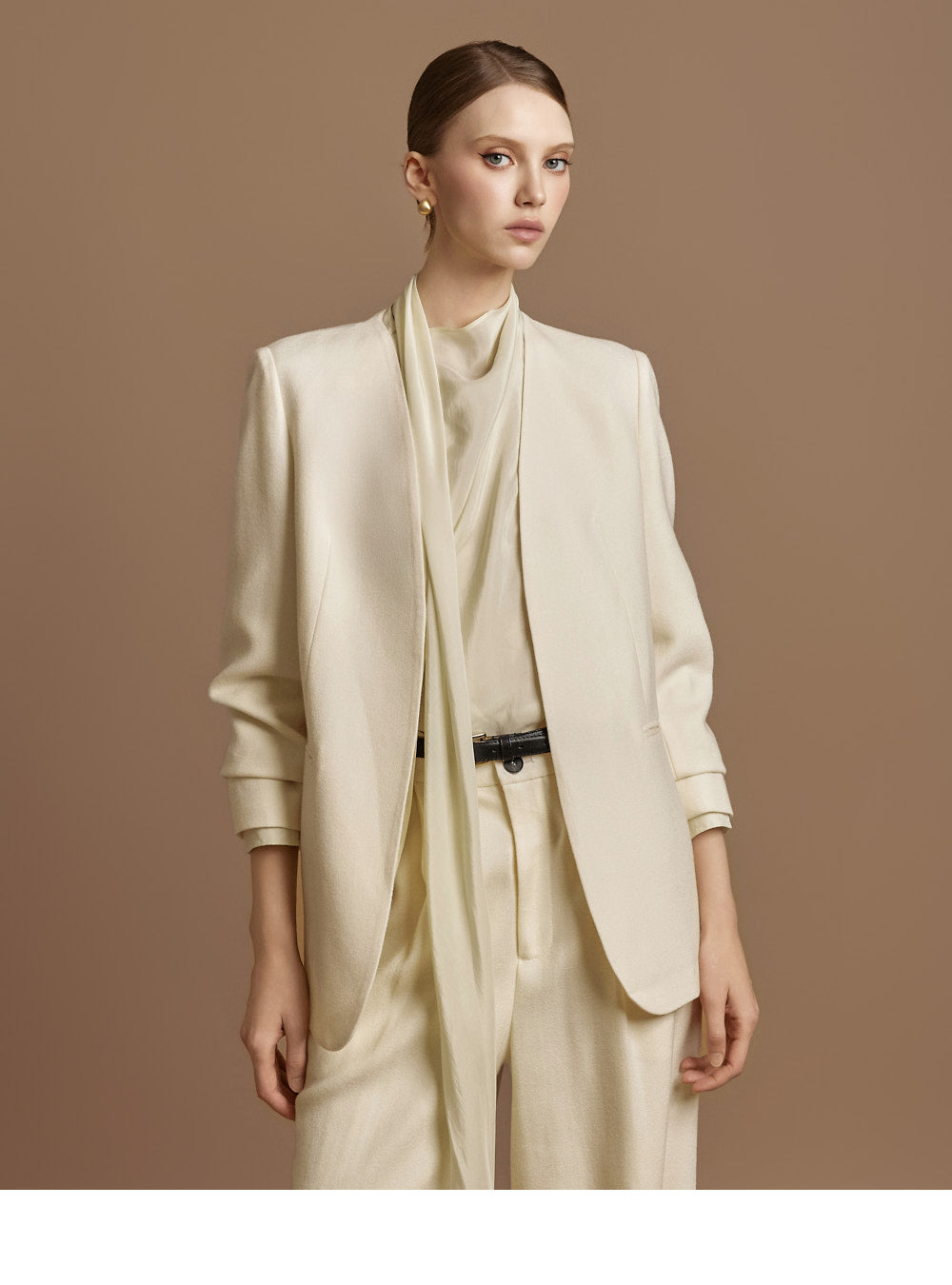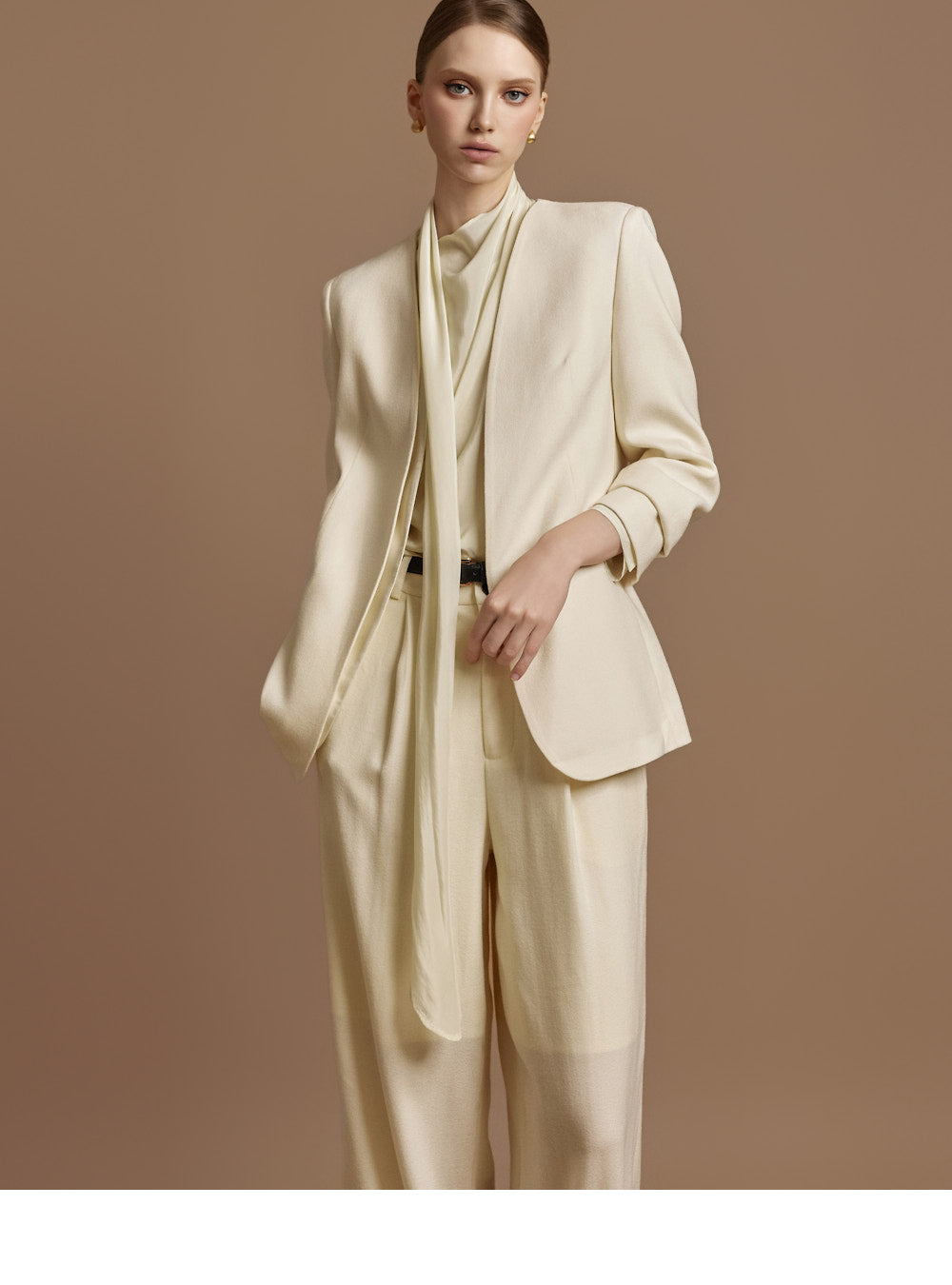 and the loose silhouette and unbalanced length add a sophisticated touch.
