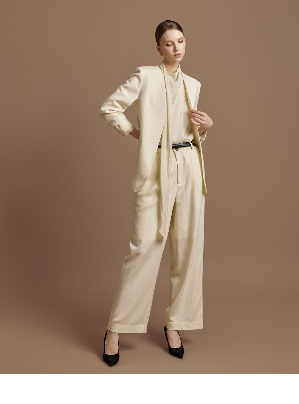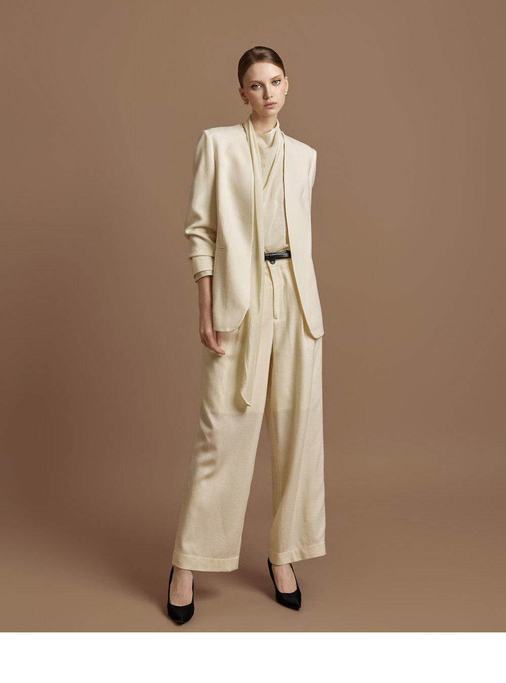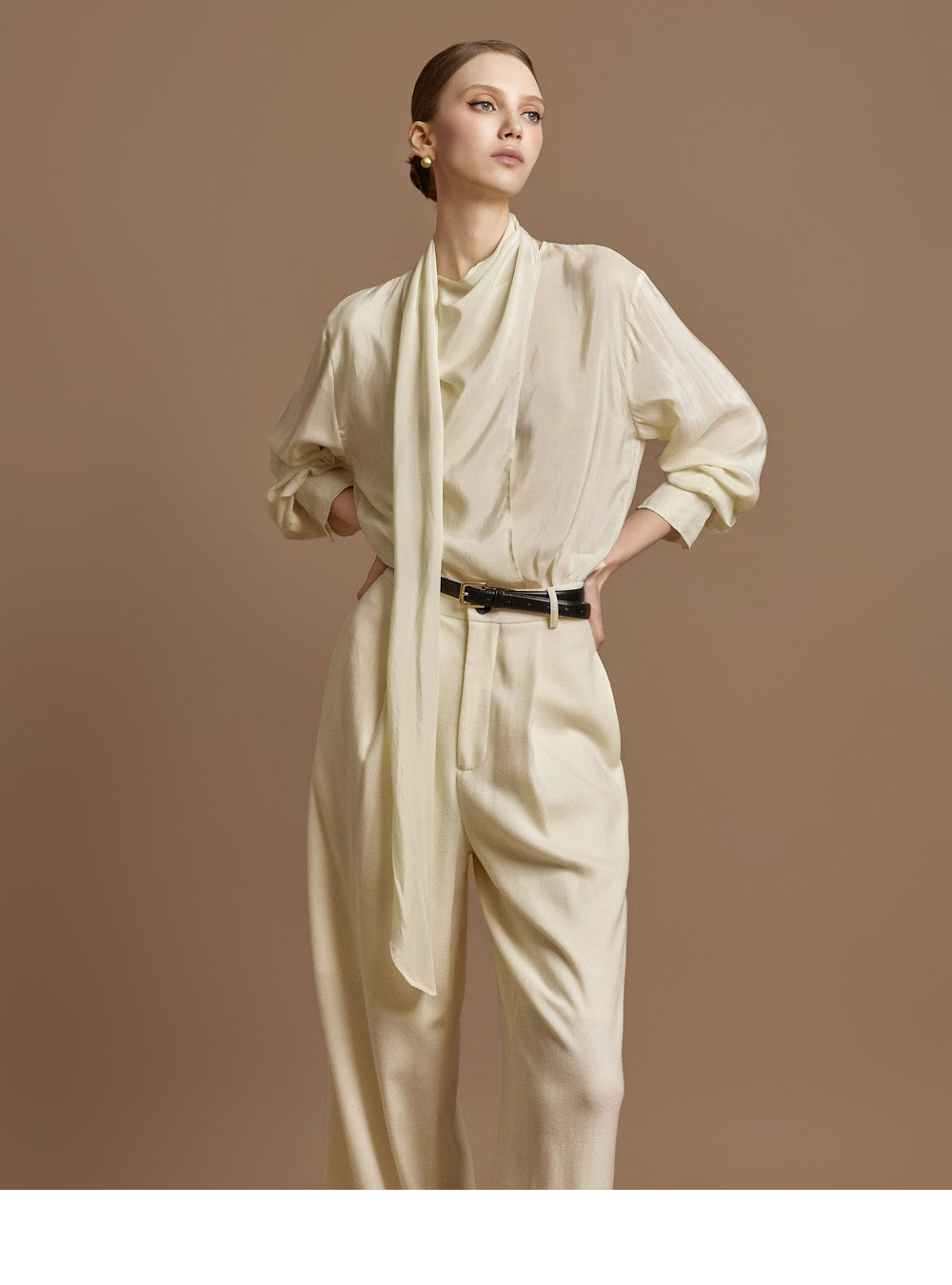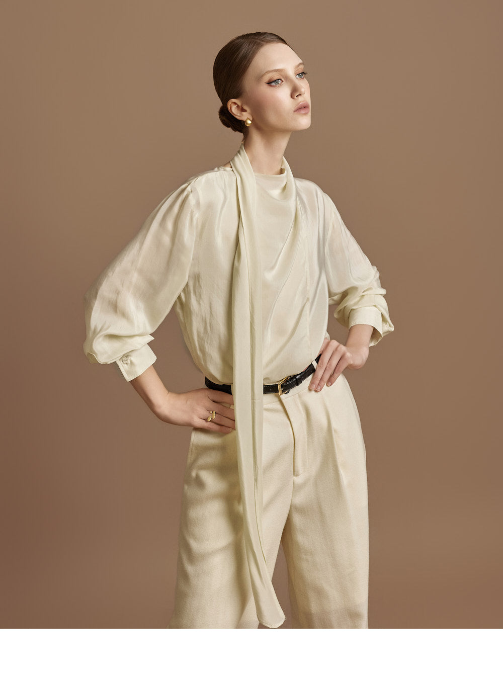 and the loose silhouette and unbalanced length add a sophisticated touch.
