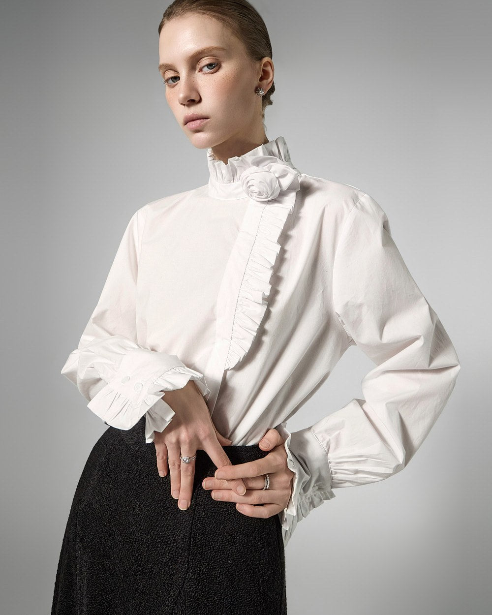 The high neck and frill details on the neck and sleeves,