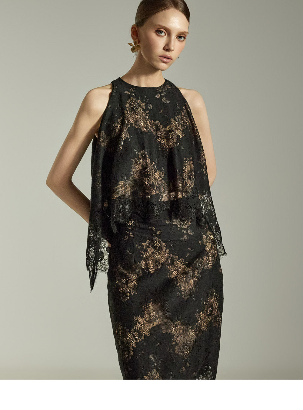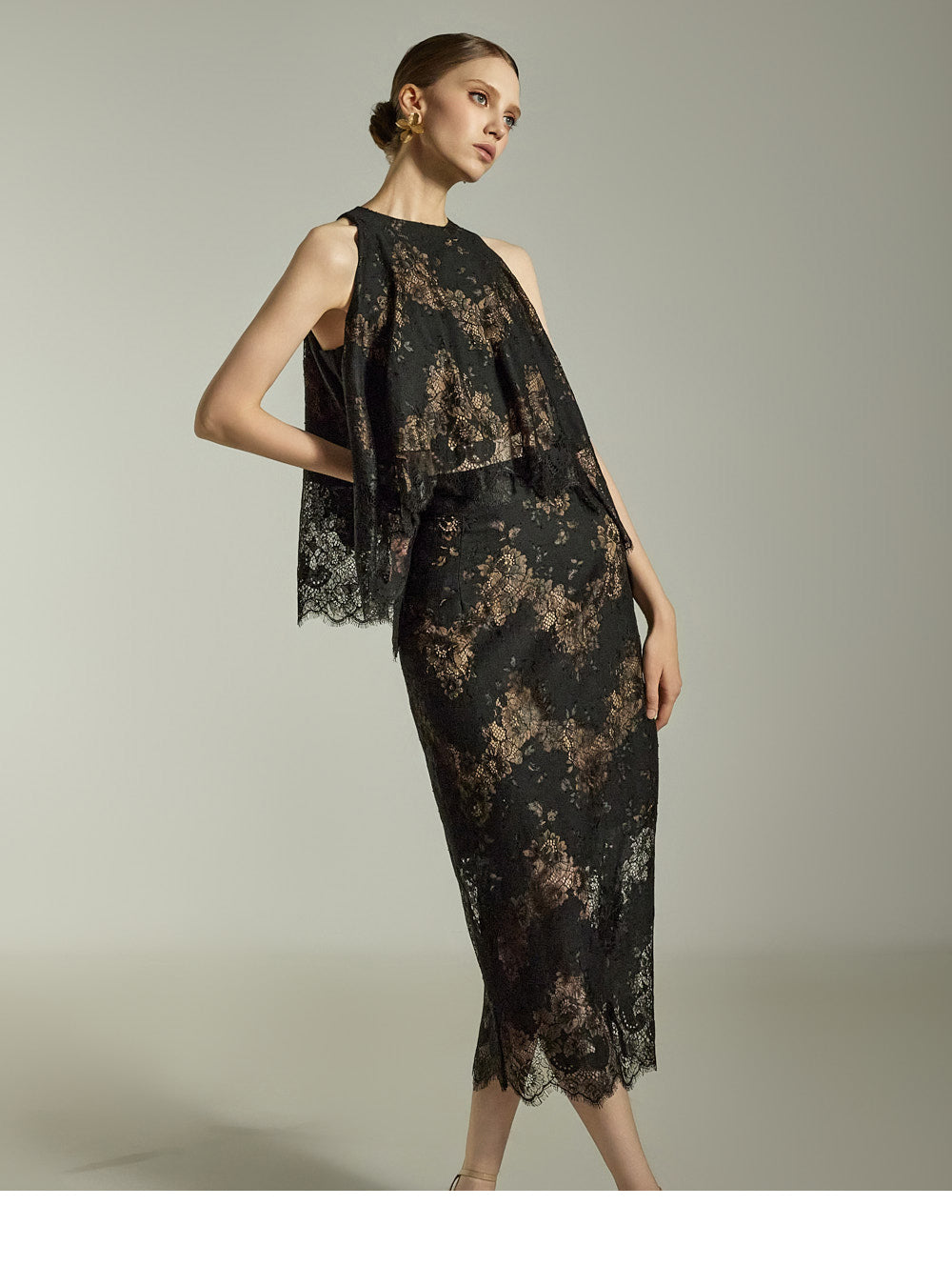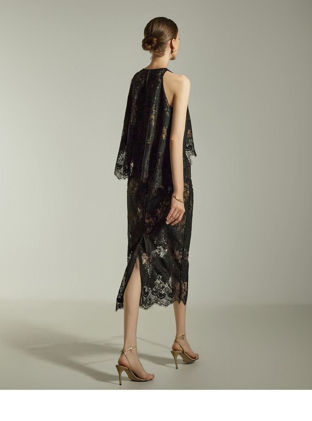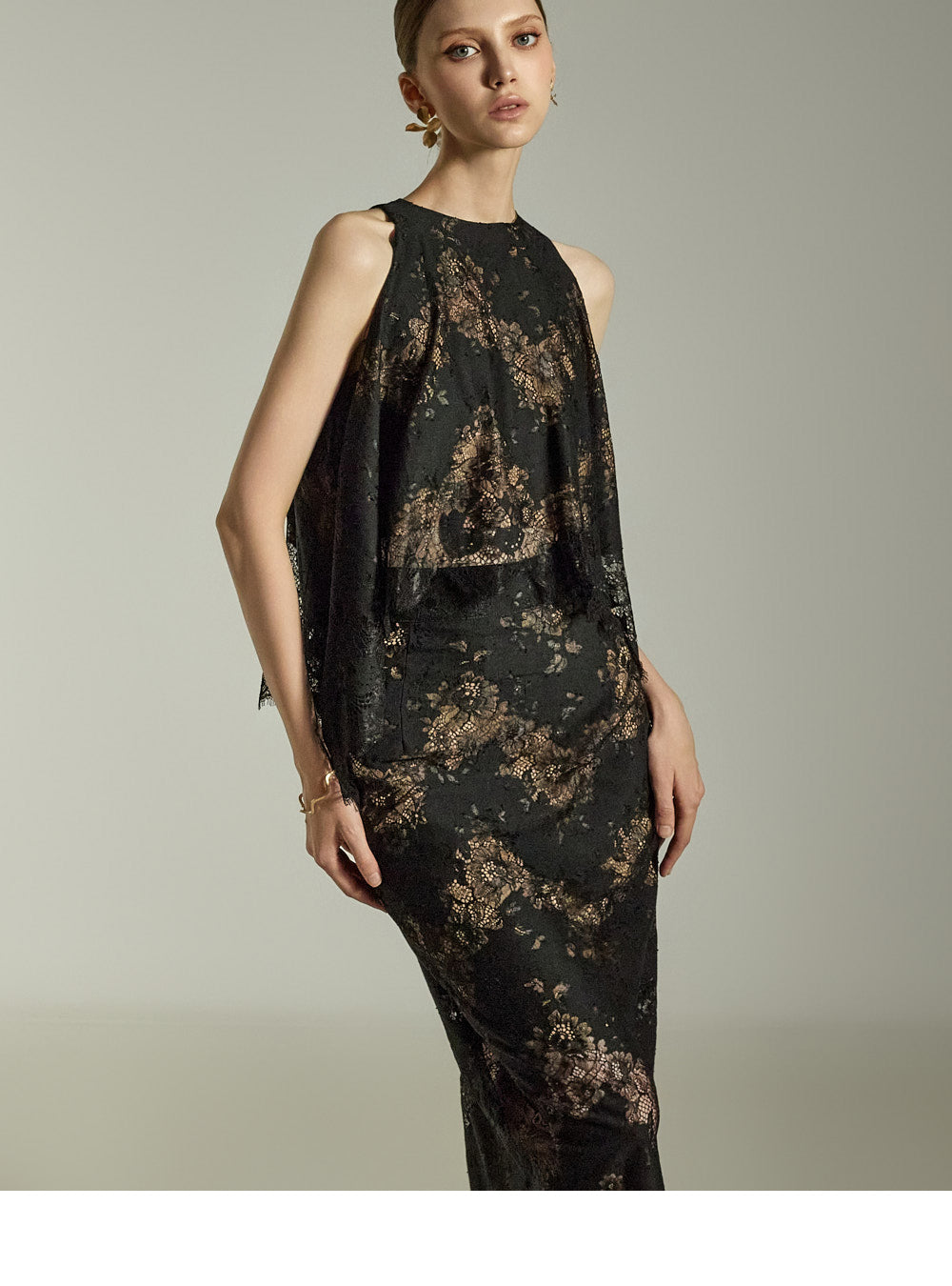 The floral lace adds a touch of sophistication, while the asymmetrical hem