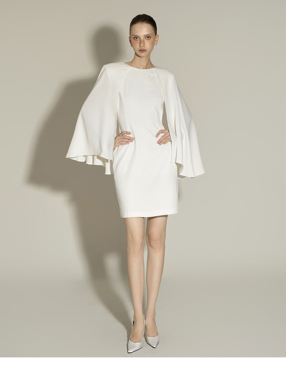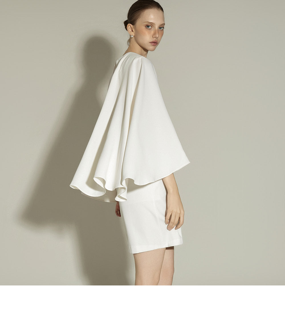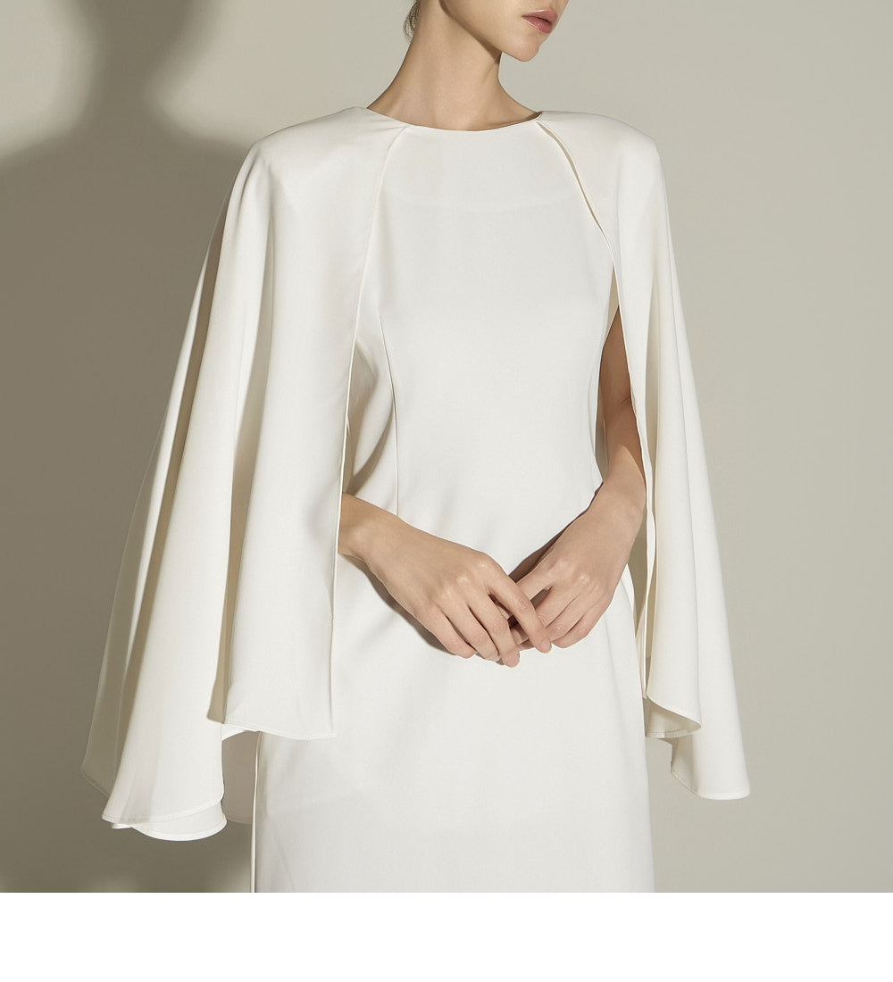 The sleeveless design with cape sleeves creates an elegant silhouette,