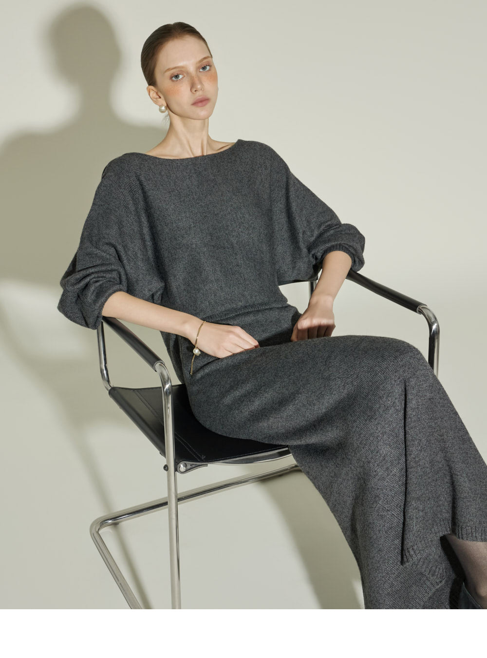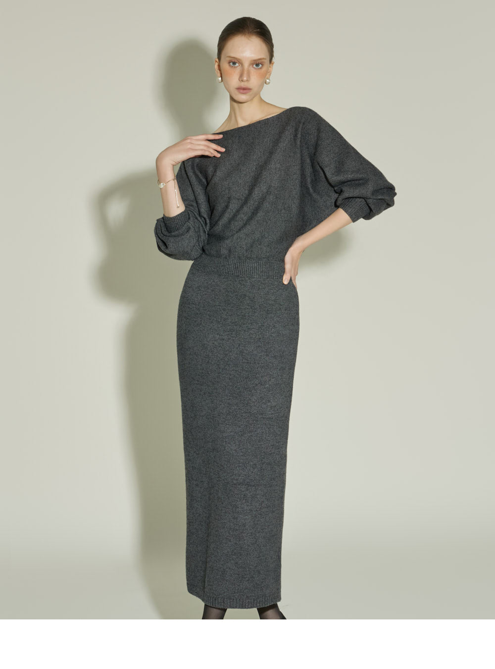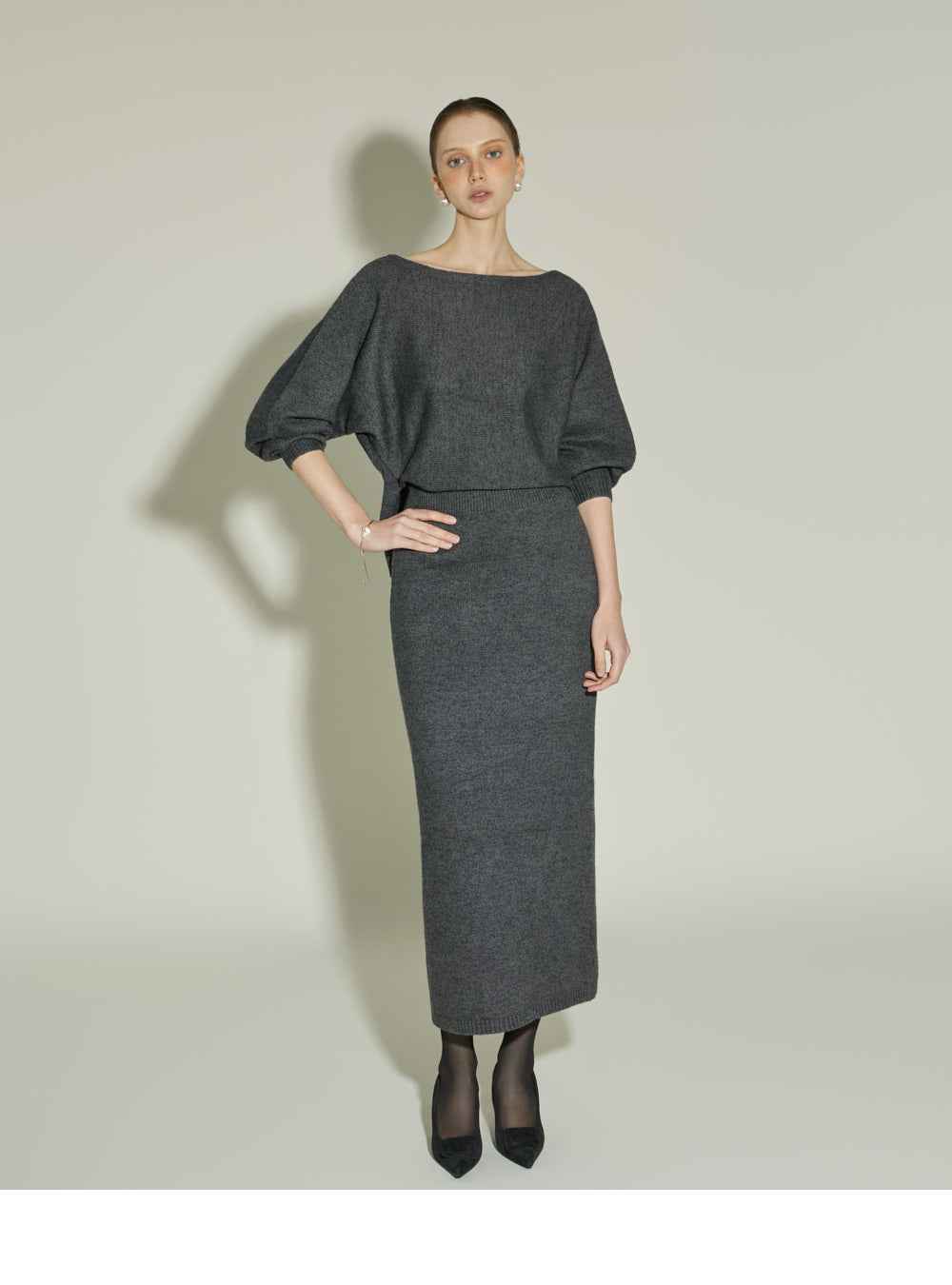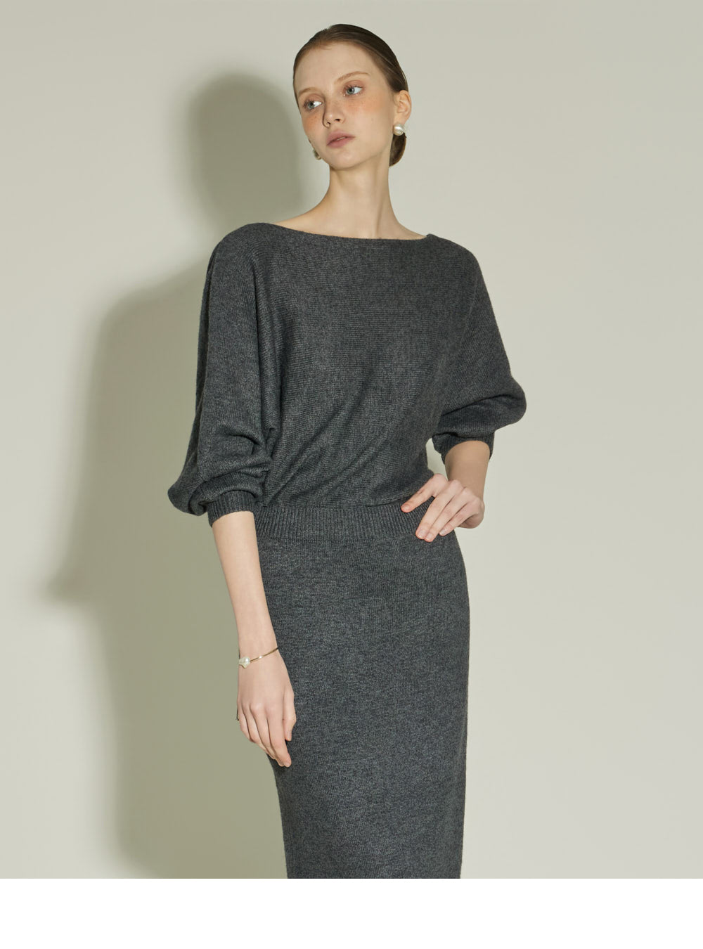 The boat neckline delicately reveals the neckline,