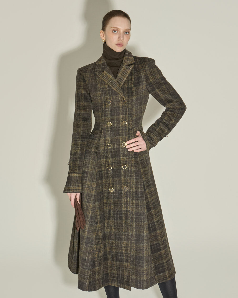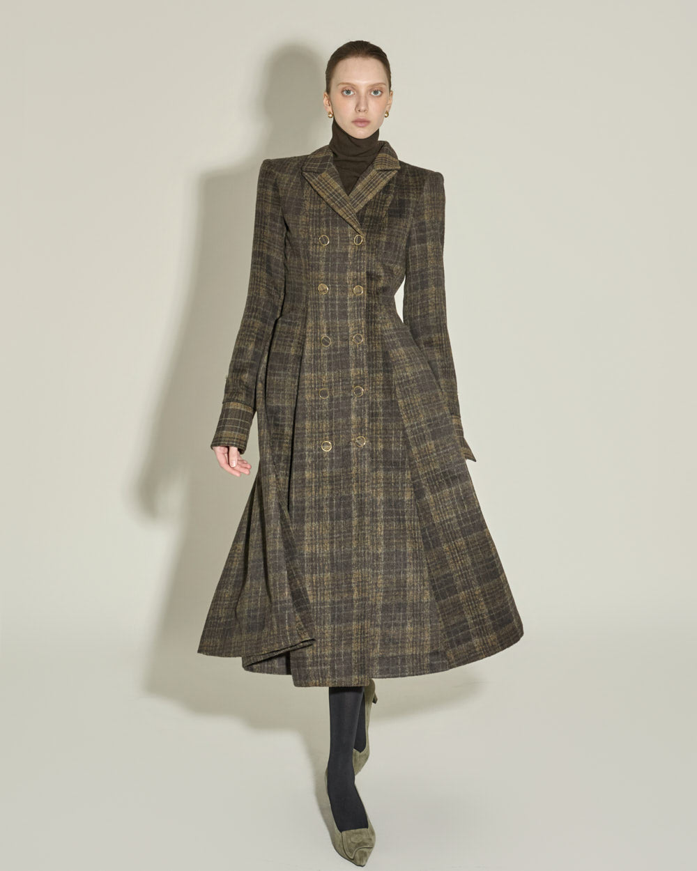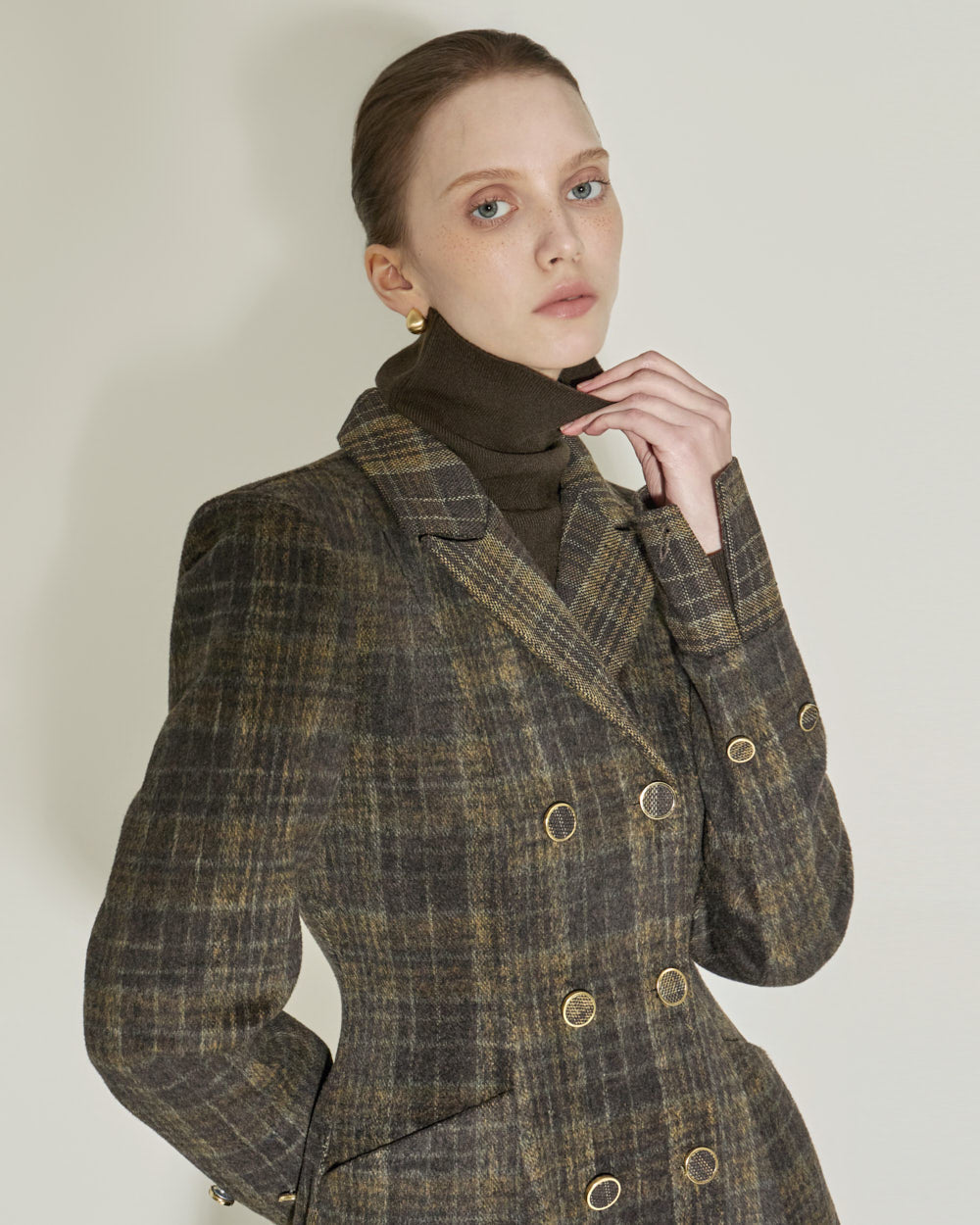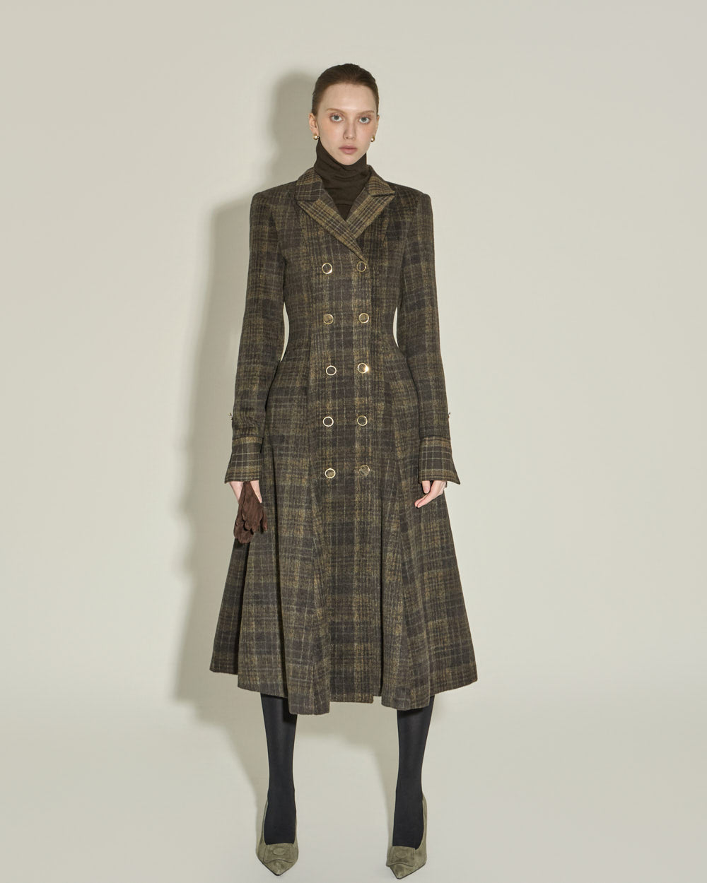 The tailored collar and double-button front closure