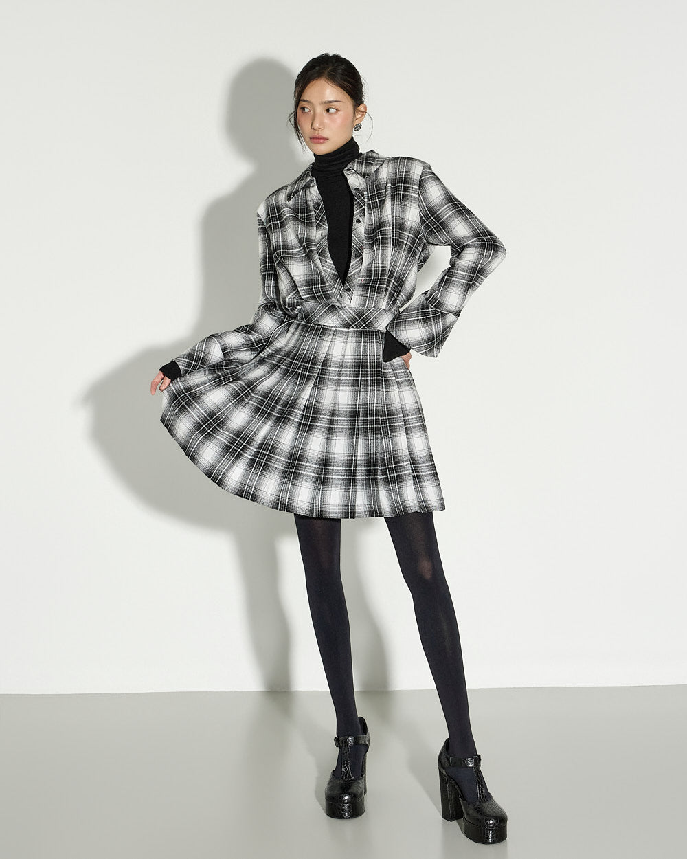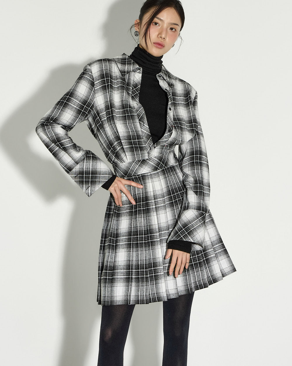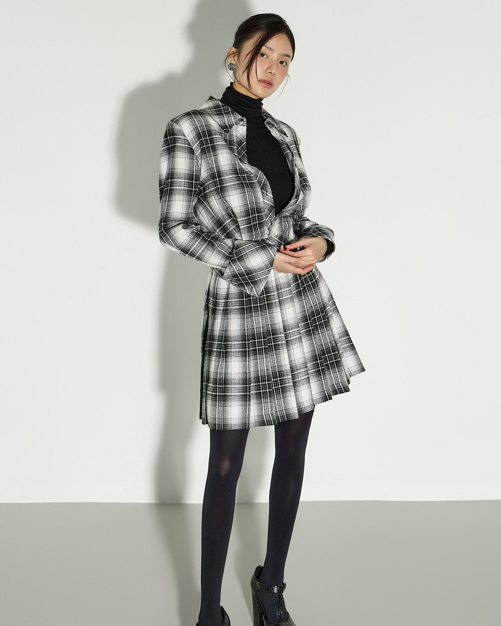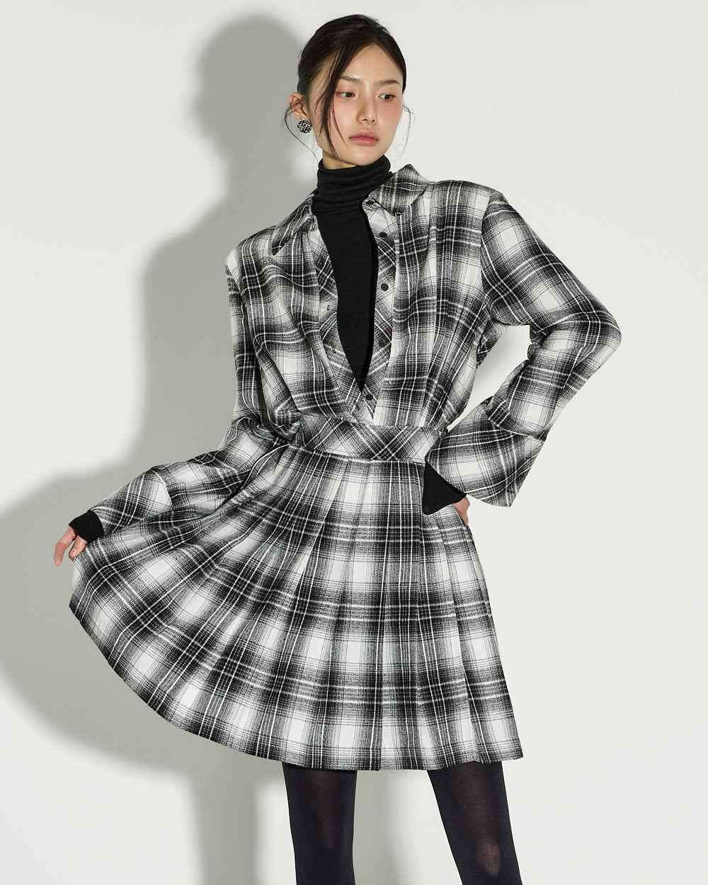 This check pleated dress exudes a modern and chic vibe.