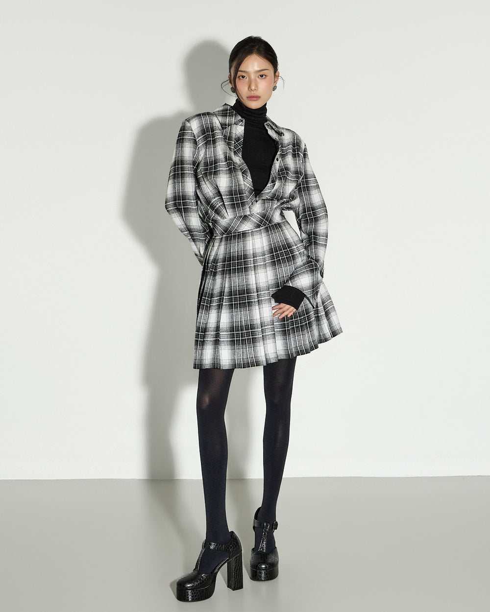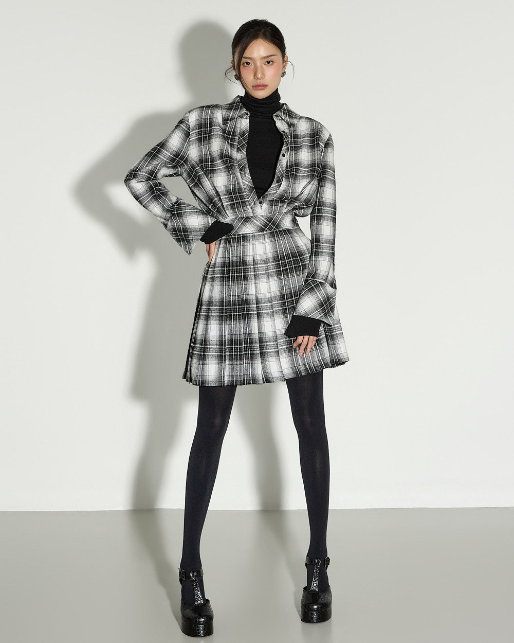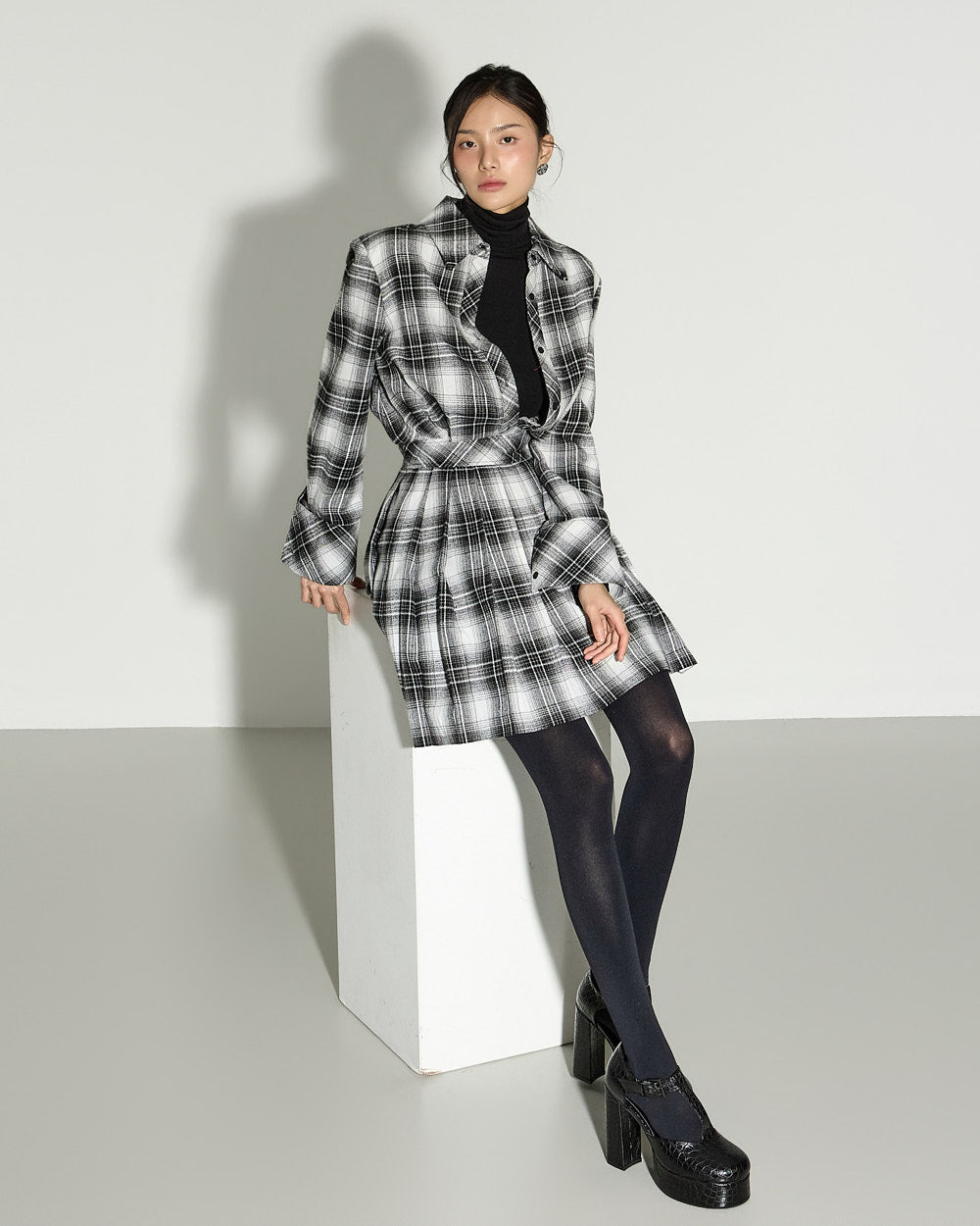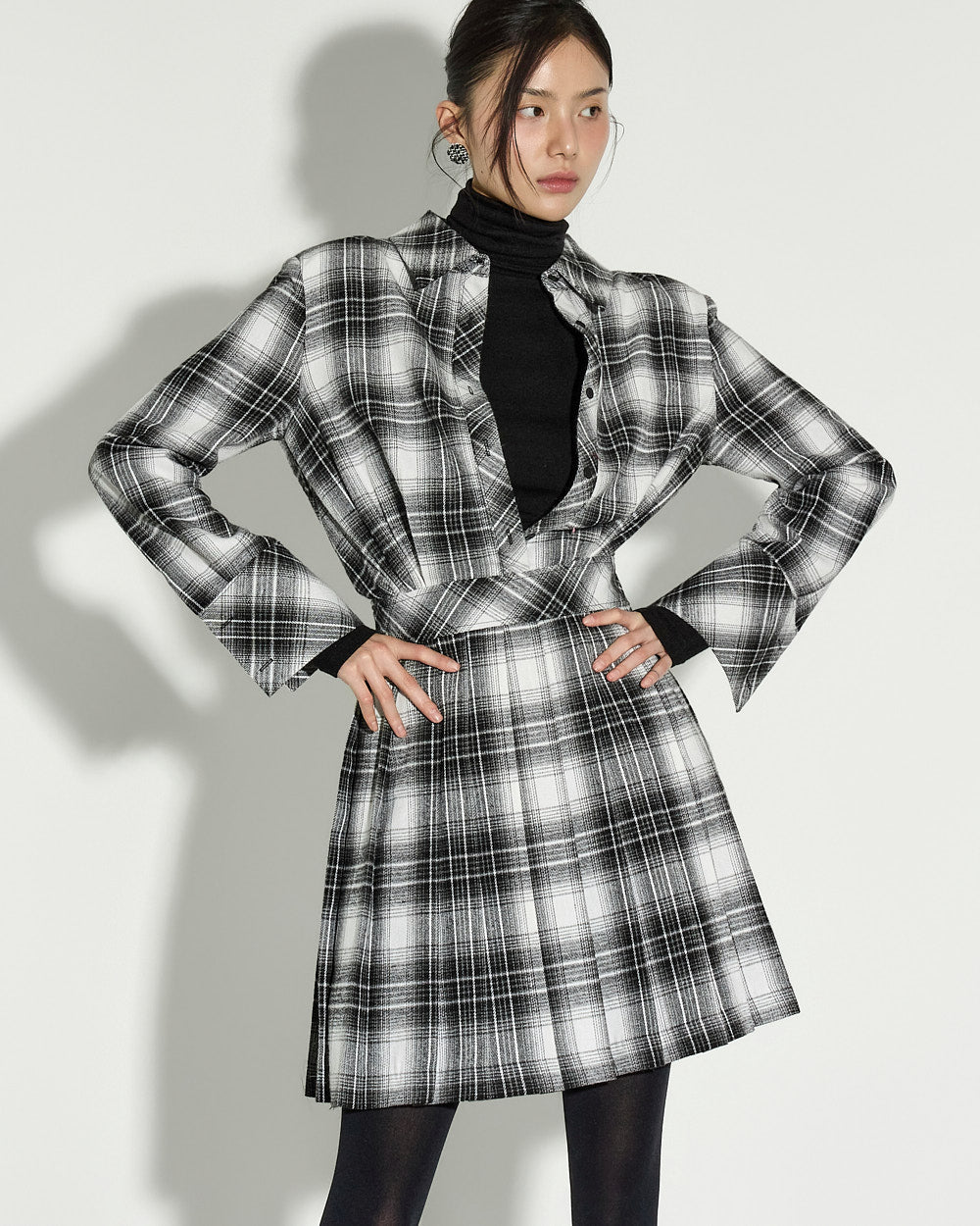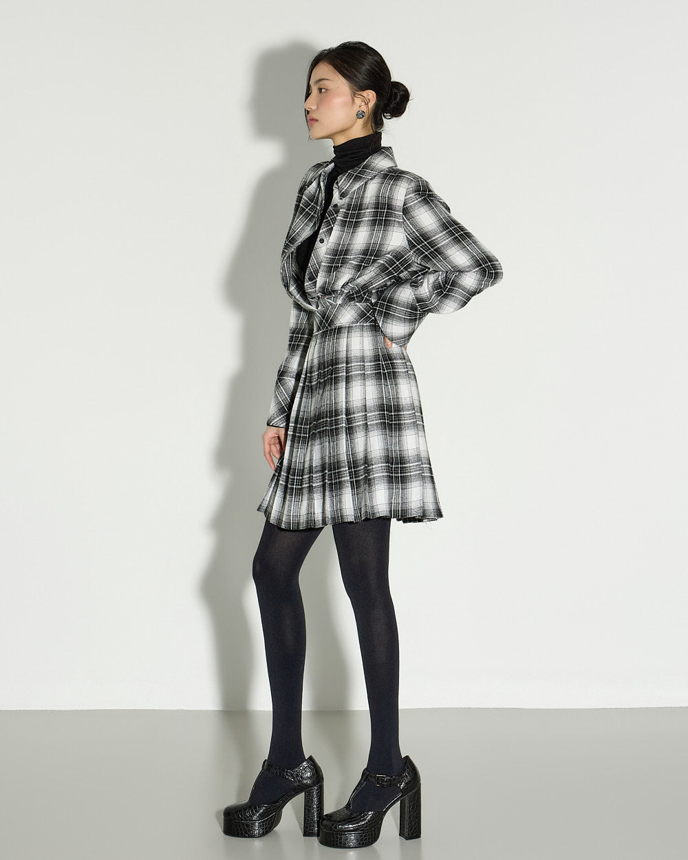 This check pleated dress exudes a modern and chic vibe.