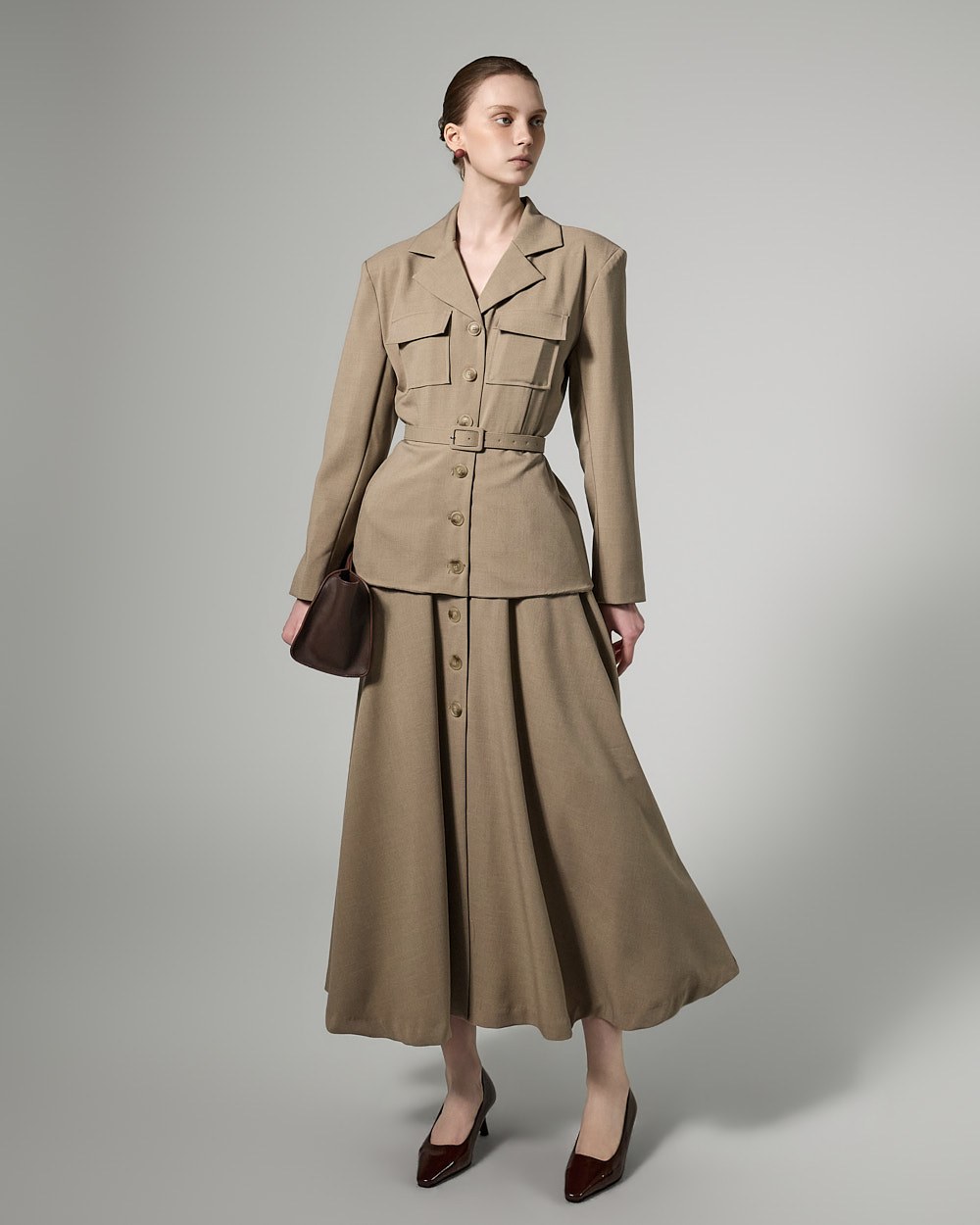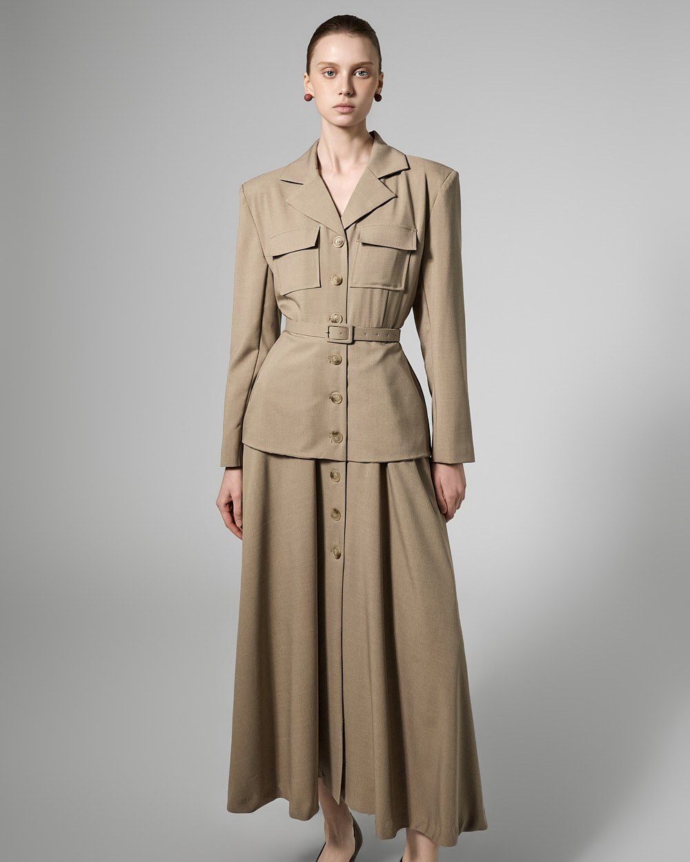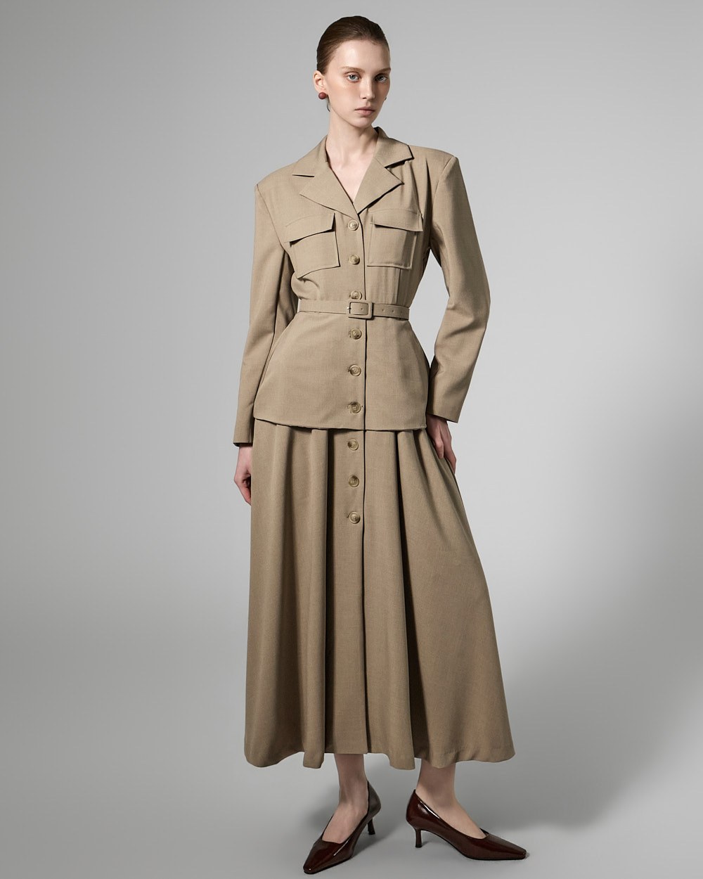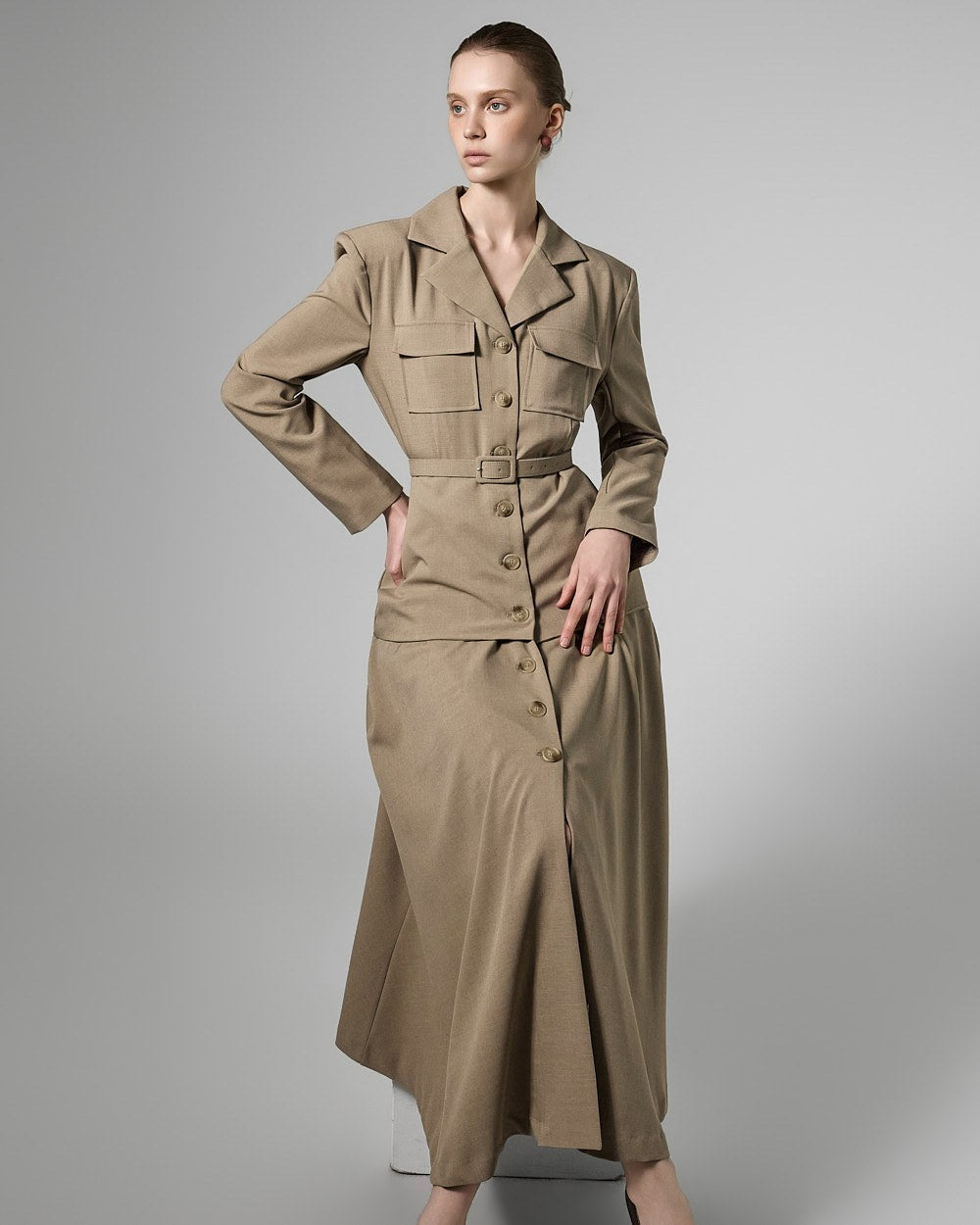 This belt set dress exudes a feminine yet modern vibe.